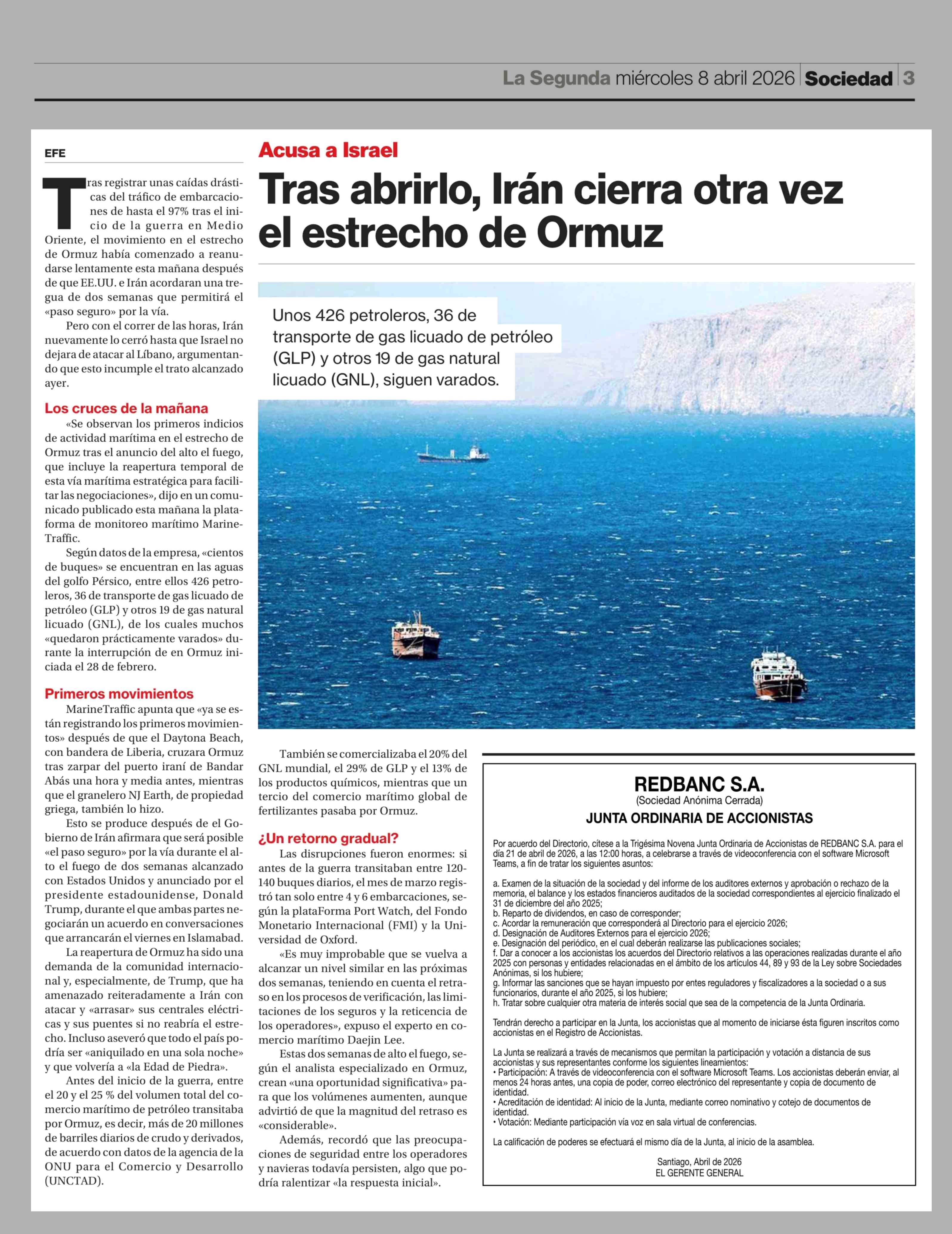 Tras abrirlo, Irán cierra otra vez el estrecho de Ormuz 08-04-2026 La Segunda |