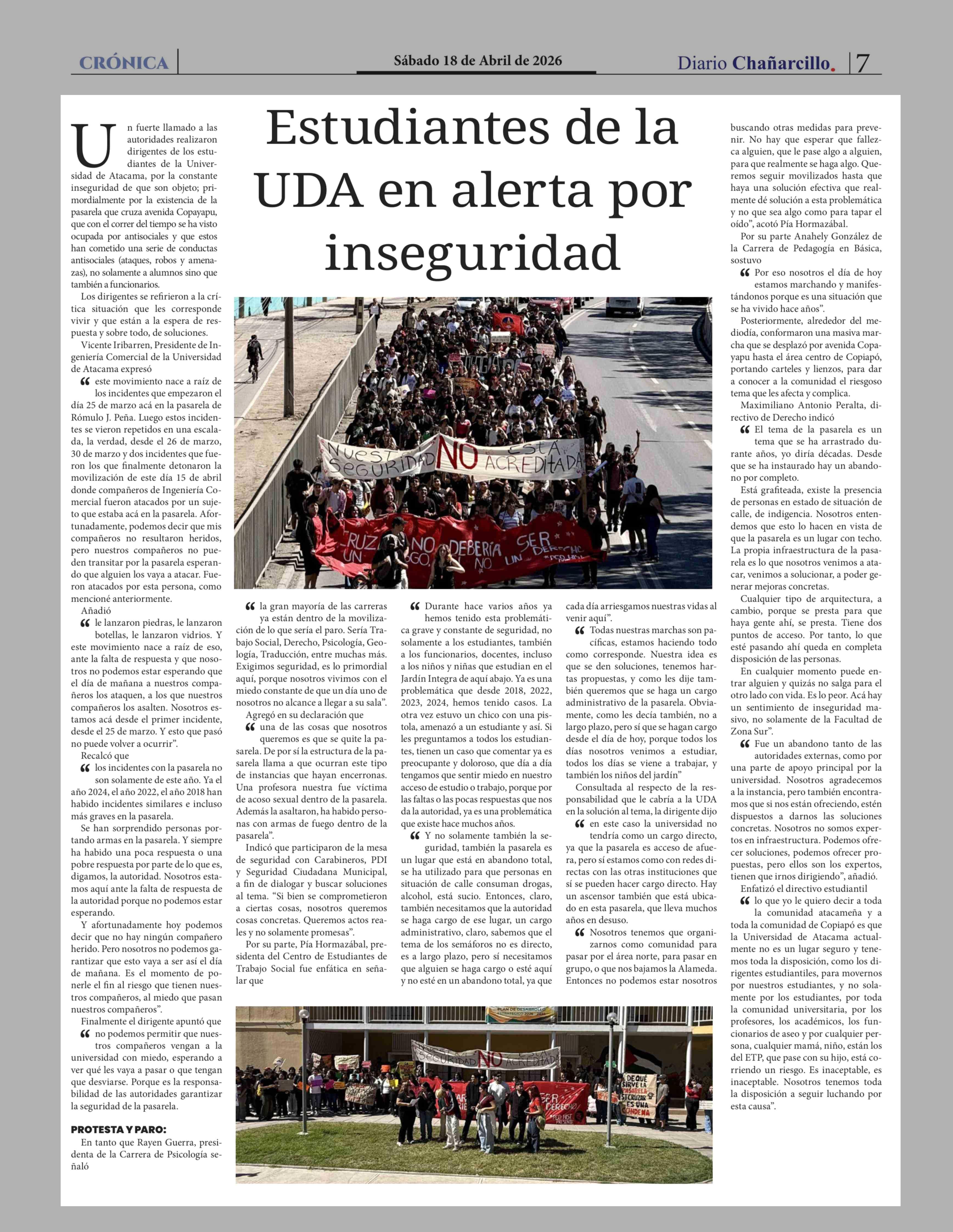 Estudiantes de la UDA en alerta por inseguridad 18-04-2026 Diario Chañarcillo |