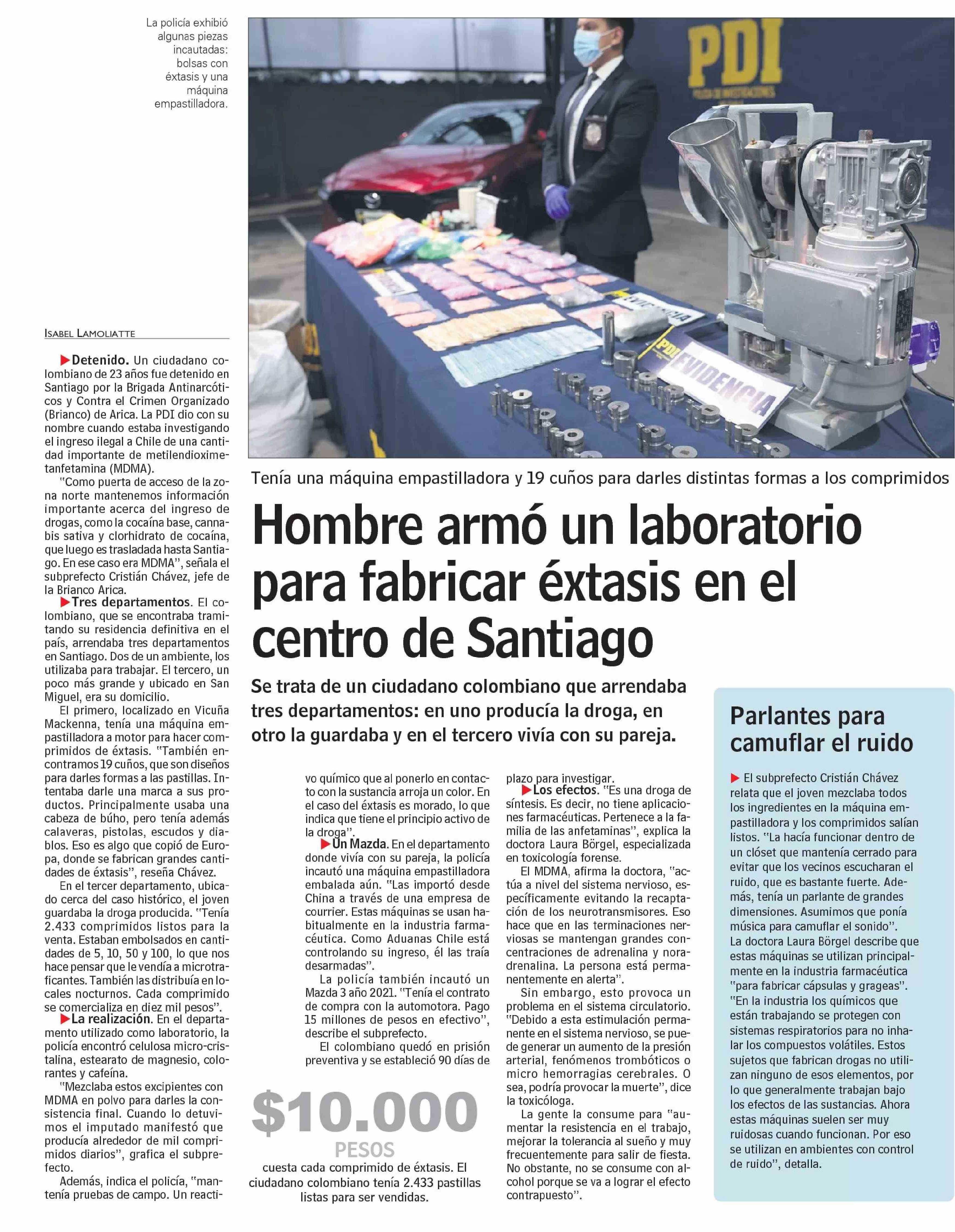 | Título: | Hombre armó un laboratorio para fabricar éxtasis en el centro de Santiago |