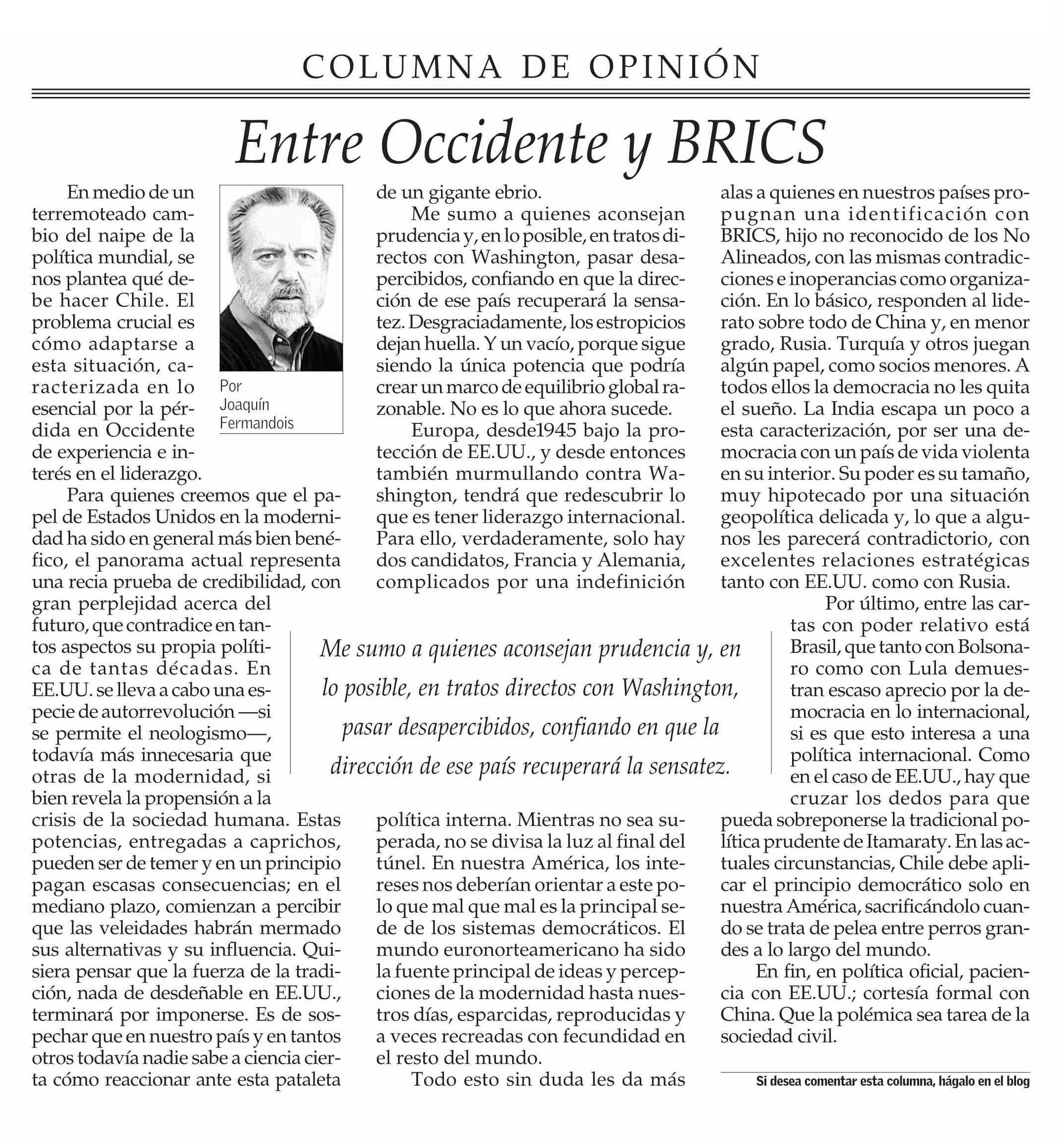 | Título: | COLUMNAS DE OPINIÓN: Entre Occidente y BRICS |