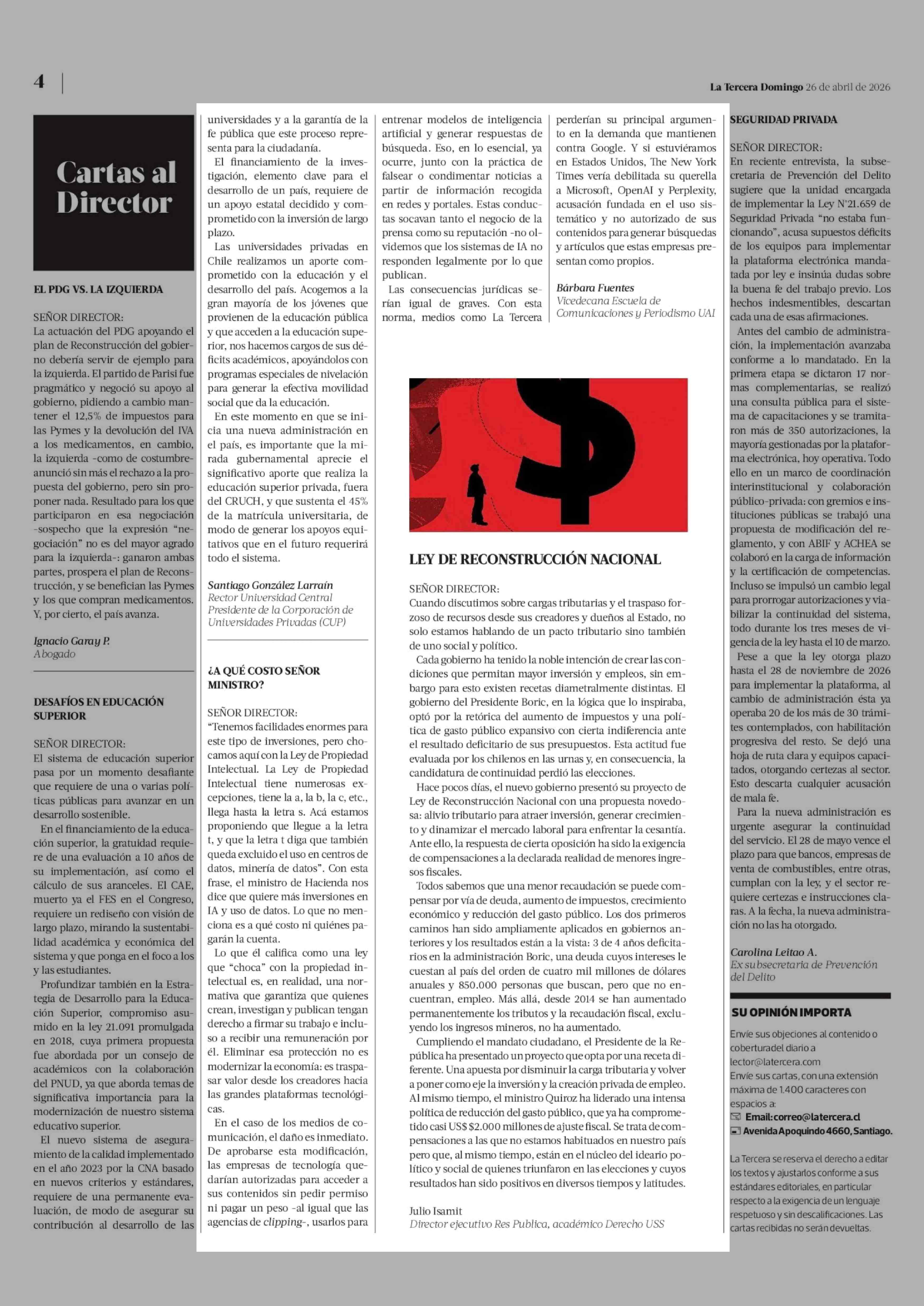 Cartas: ¿A QUÉ COSTO SEÑOR MINISTRO? 26-04-2026 La Tercera |