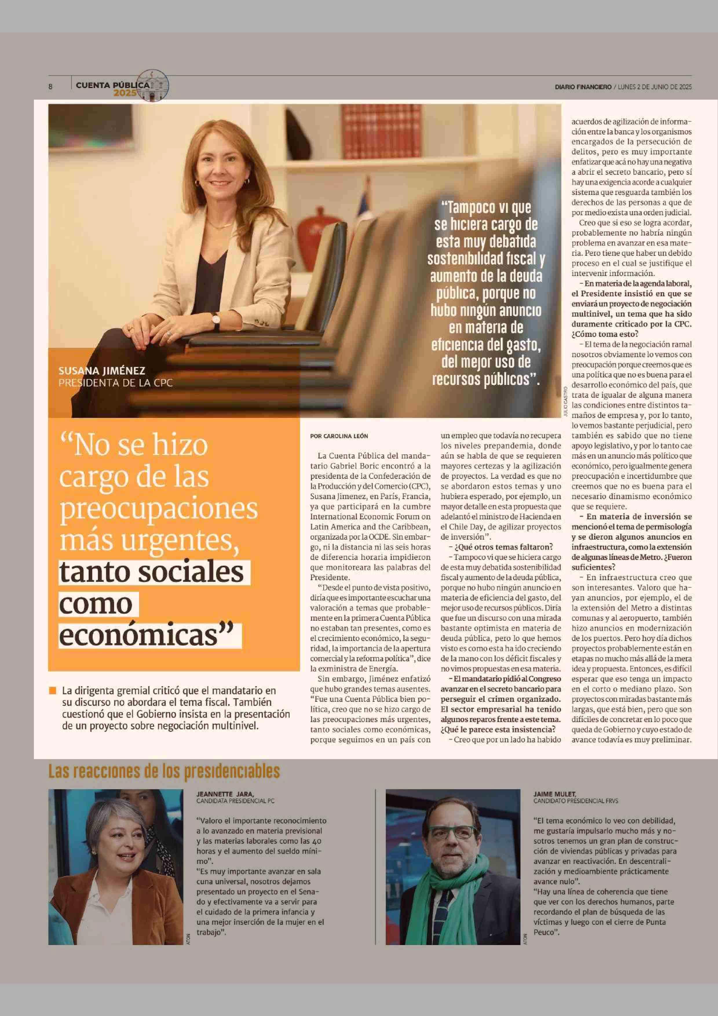 “No se hizo cargo de las preocupaciones más urgentes, tanto sociales como económicas" 02-06-2025 Diario Financiero |