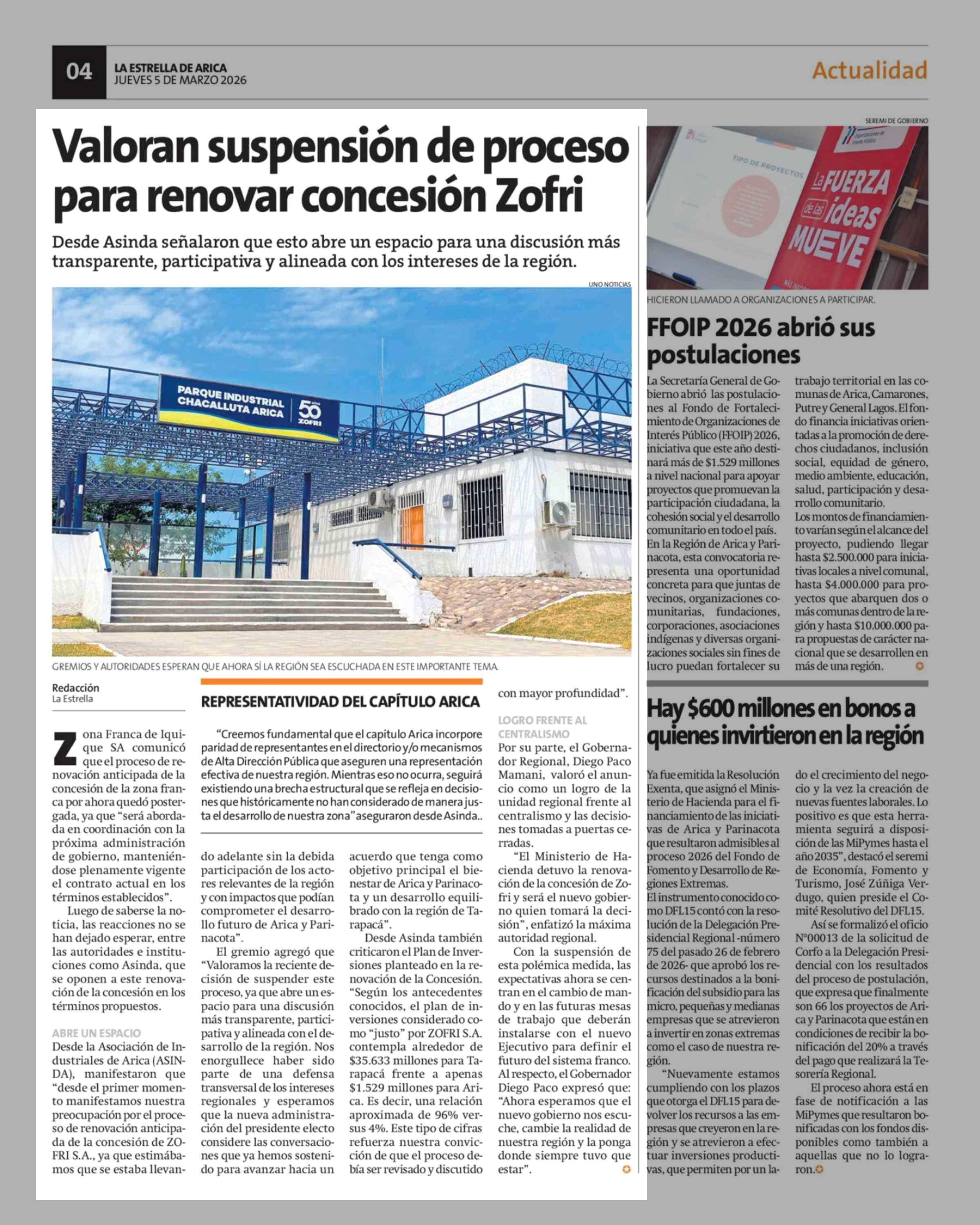 Valoran suspensión de proceso para renovar concesión Zofri 05-03-2026 La Estrella de Arica |