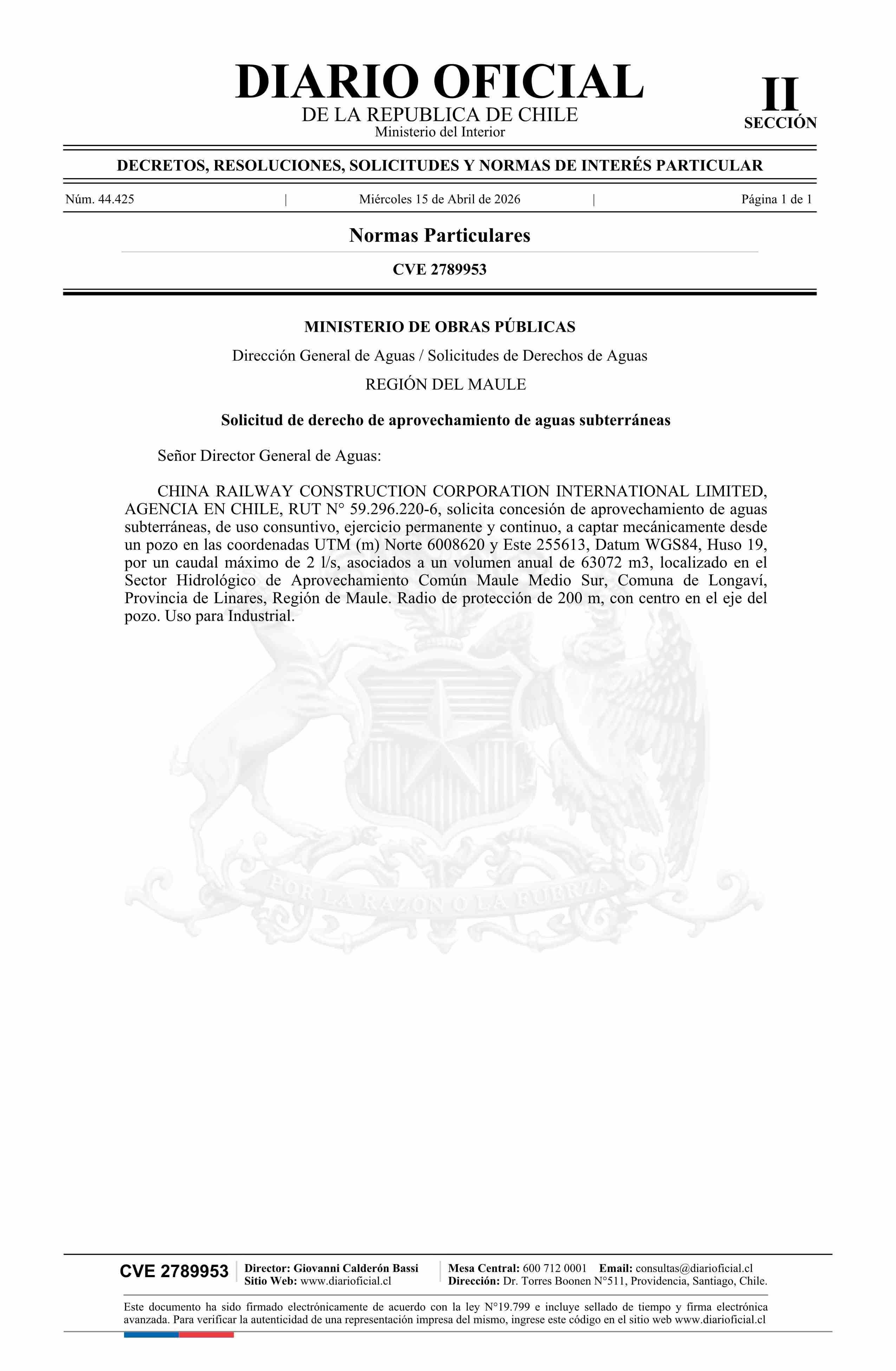 Solicitud China Railway Construction Corporation International Limited, Agencia en Chile 15-04-2026 Diario Oficial Edición Electrónica |