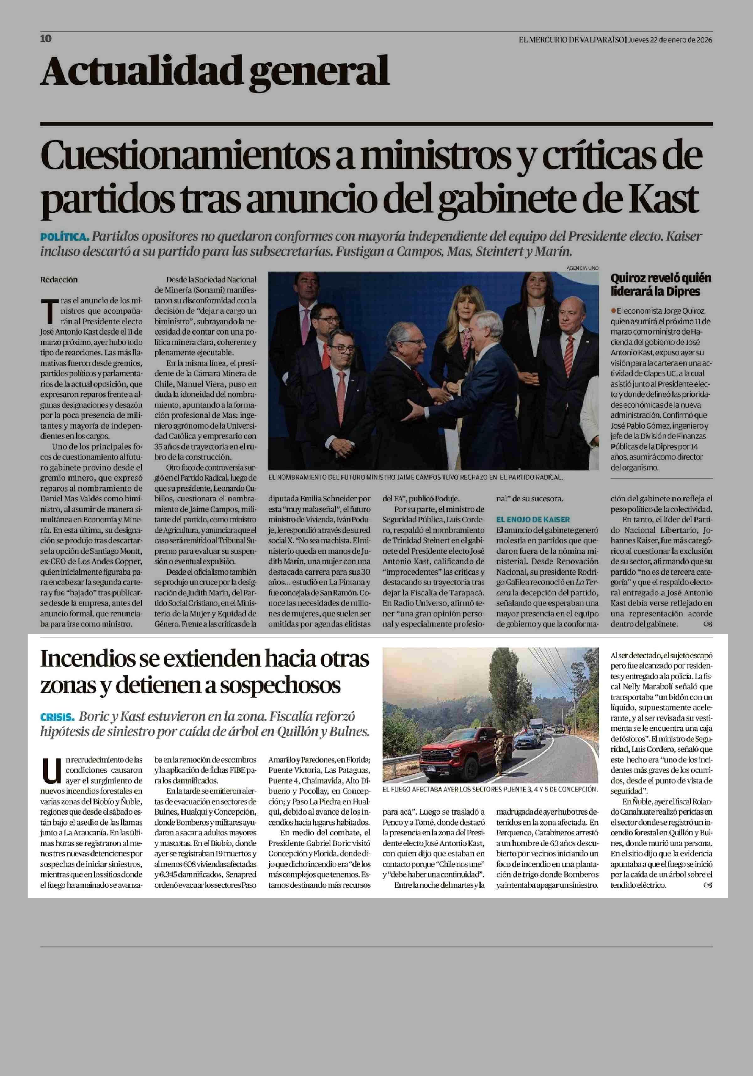 Incendios se extienden hacia otras zonas y detienen a sospechosos 22-01-2026 El Mercurio de Valparaíso |