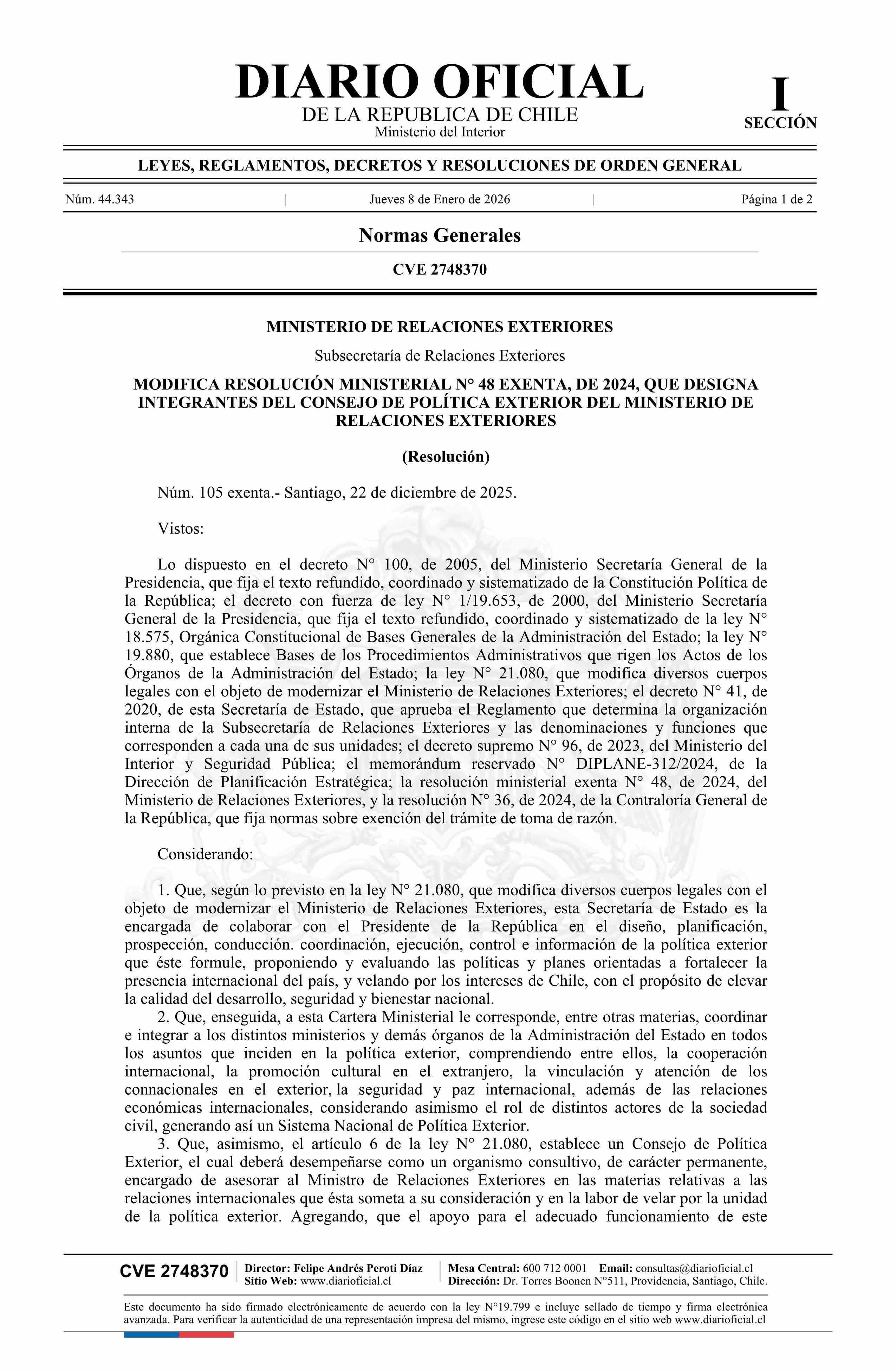 Resolución exenta número 105, de 2025.- Modifica resolución N° 48 exenta, de 2024, que designa integrantes del Consejo de Política Exterior del Ministerio de Relaciones Exteriores 08-01-2026 DIARIO OFICIAL CHILE - BOLETÍN OFICIAL DE MINERÍA |