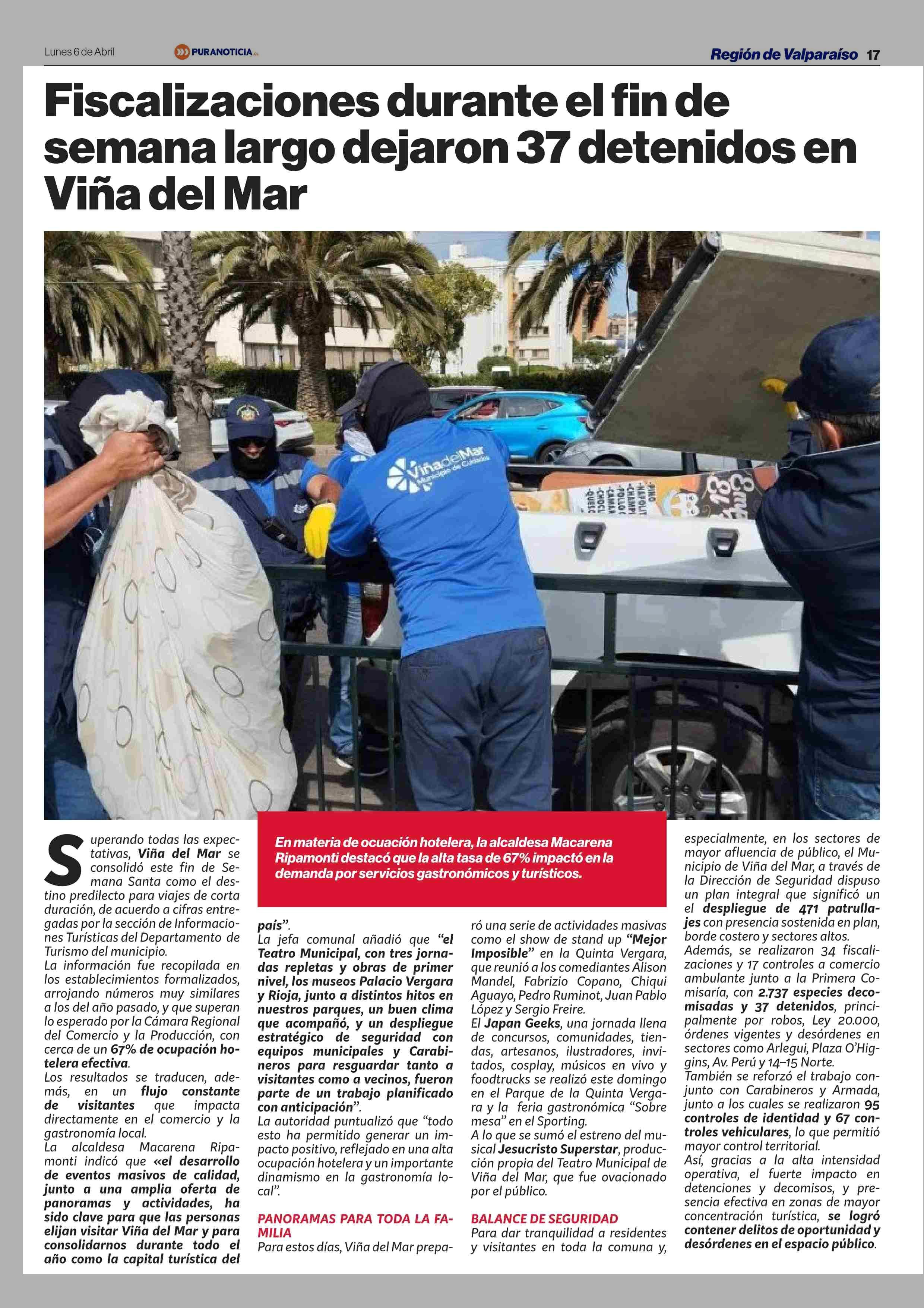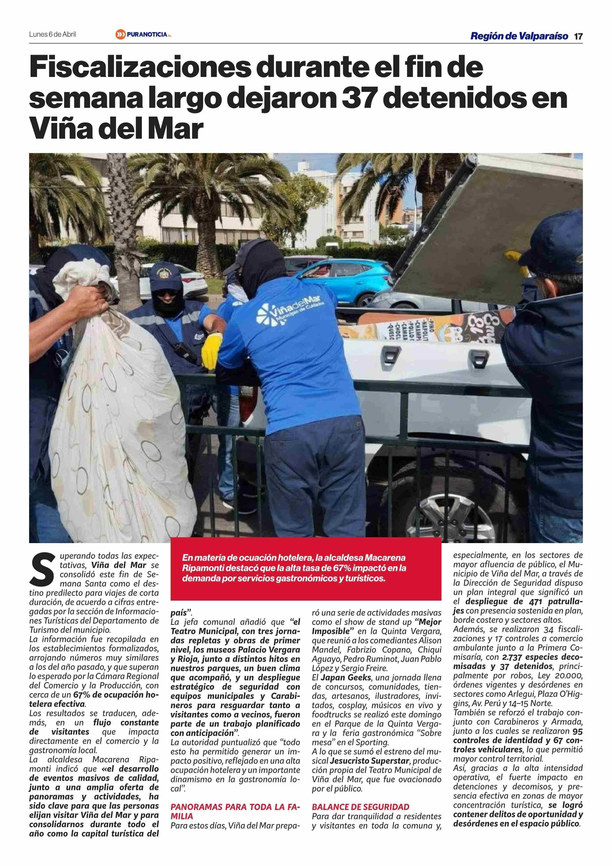 Fiscalizaciones durante el fin de semana largo dejaron 37 detenidos en Viña del Mar 06-04-2026 Puranoticia.cl |