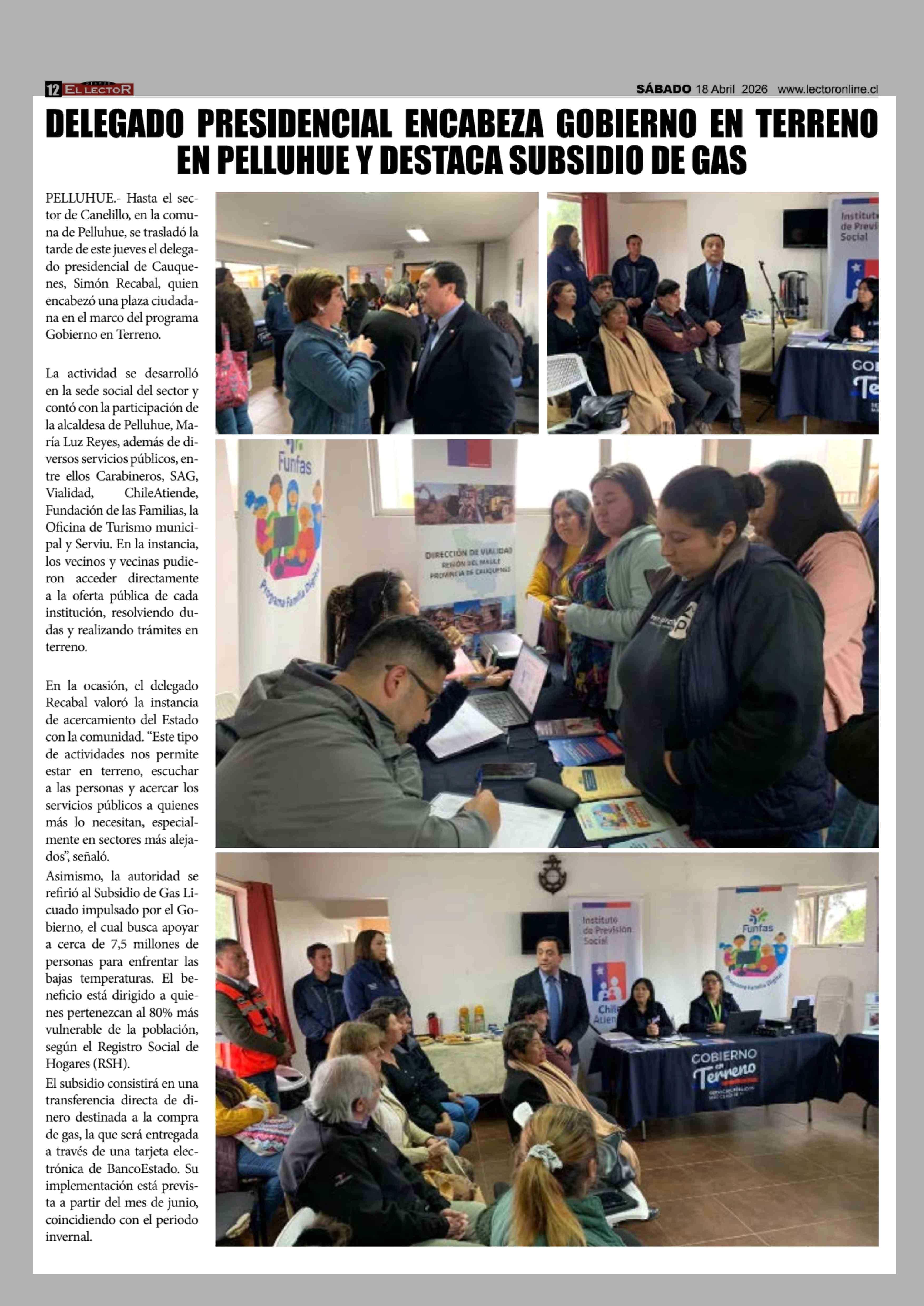 DELEGADO PRESIDENCIAL ENCABEZA GOBIERNO EN TERRENO EN PELLUHUE Y DESTACA SUBSIDIO DE GAS 18-04-2026 El Lector |