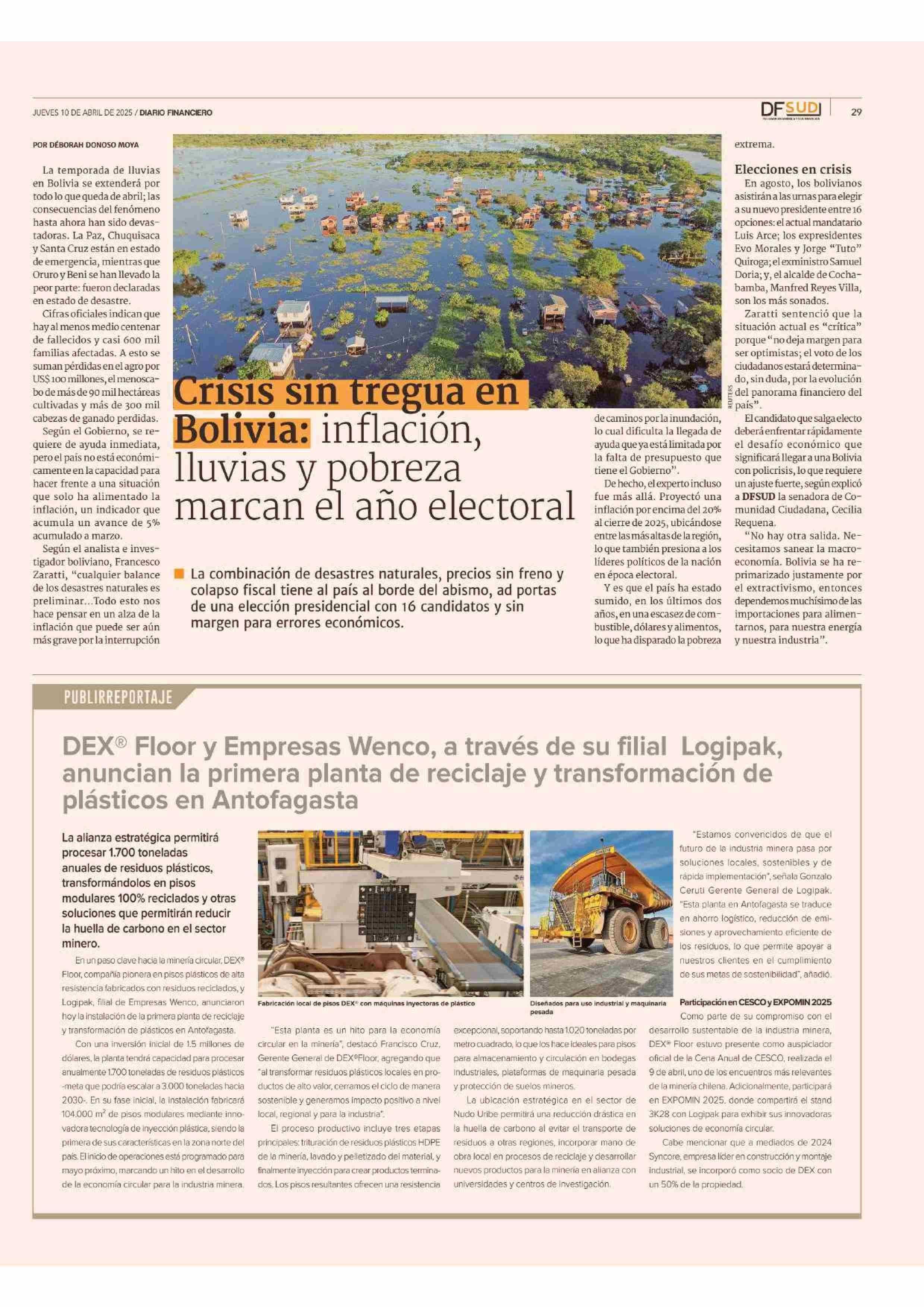 DEX? Floor y Empresas Wenco, a través de su filial Logipak, anuncian la primera planta de reciclaje y transformación de plásticos en Antofagasta 10-04-2025 Diario Financiero |