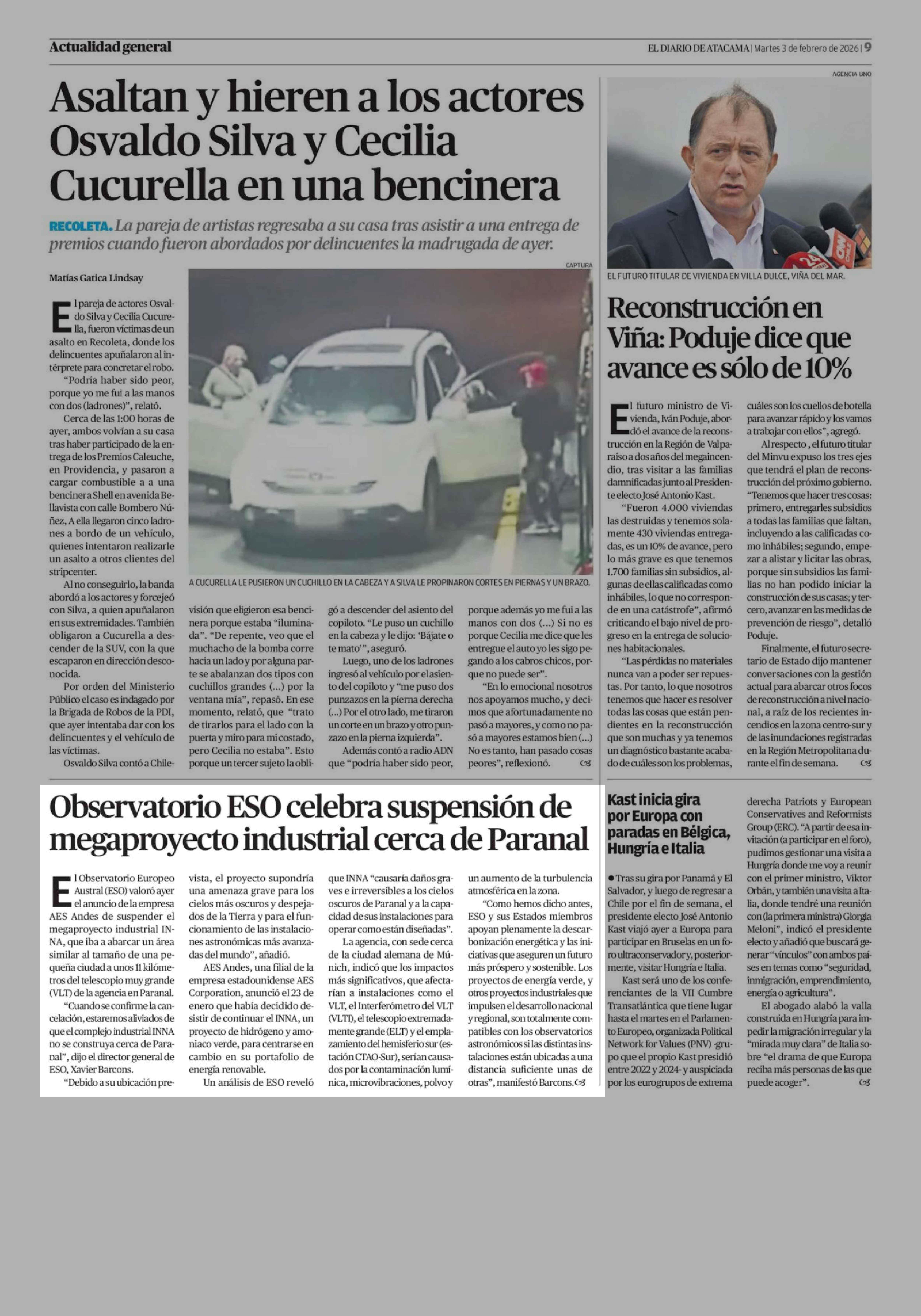 Observatorio ESO celebra suspensión de megaproyecto industrial cerca de Paranal 03-02-2026 El Diario de Atacama |