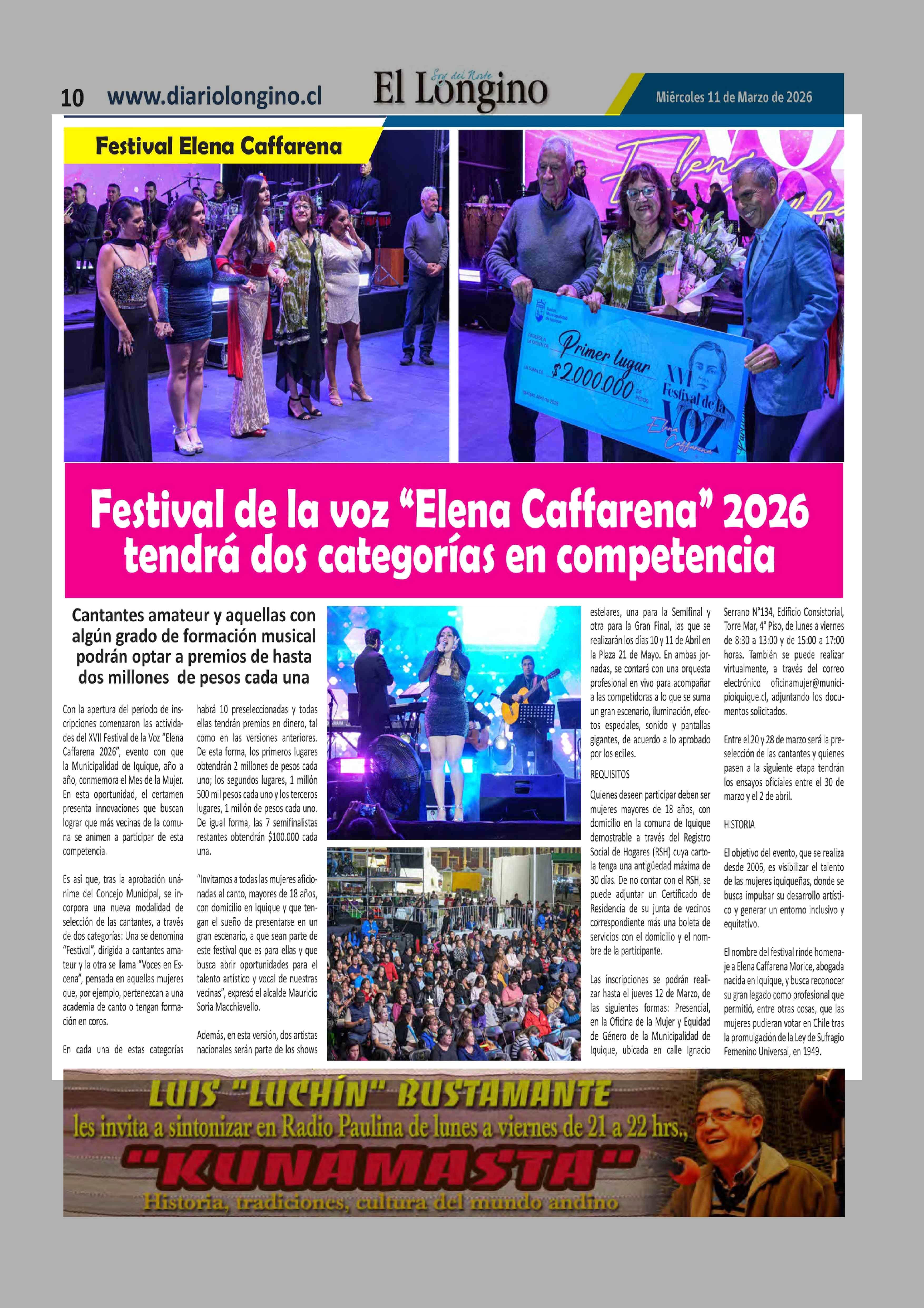 Festival de la voz "Elena Caffarena" 2026 tendrá dos categorías en competencia 11-03-2026 El Longino |