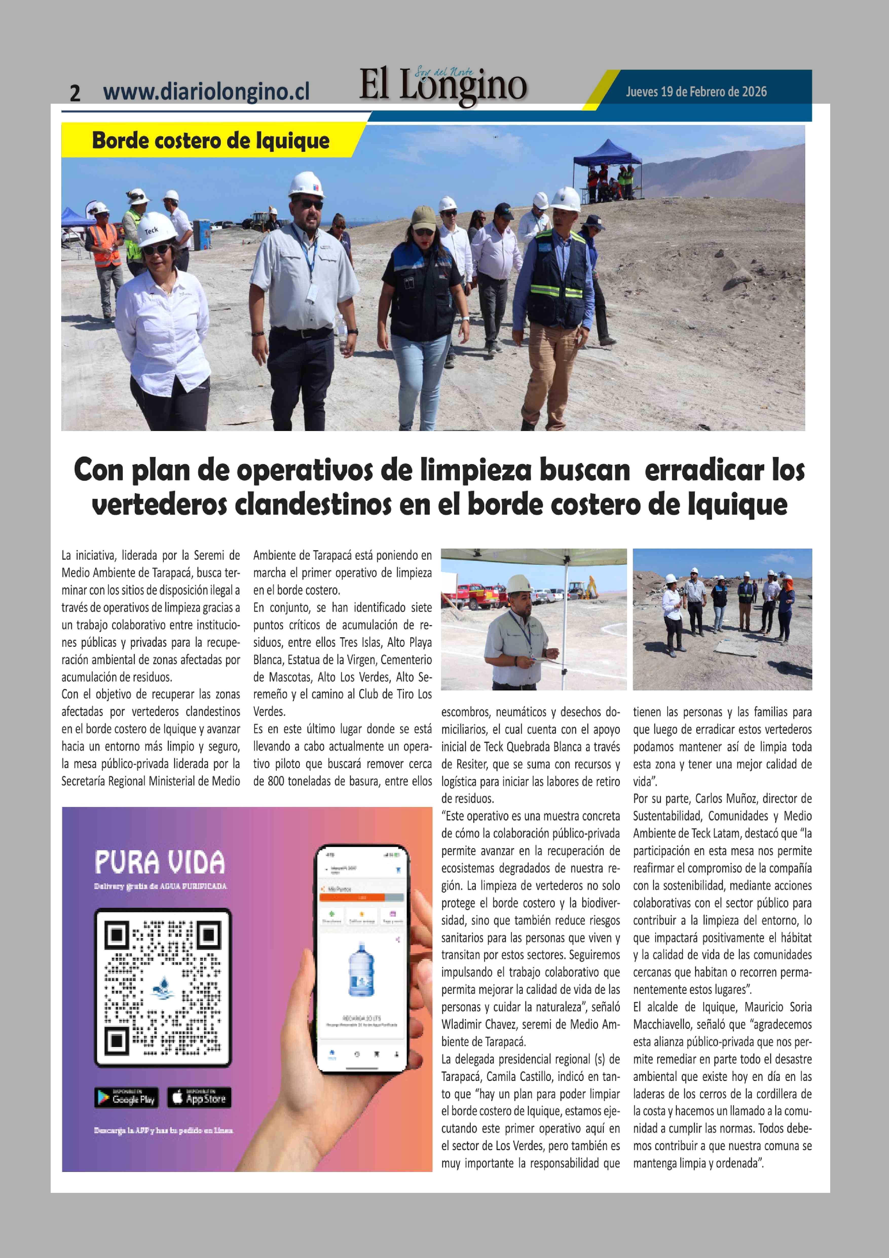 Con plan de operativos de limpieza buscan erradicar los vertederos clandestinos en el borde costero de Iquique 19-02-2026 El Longino |