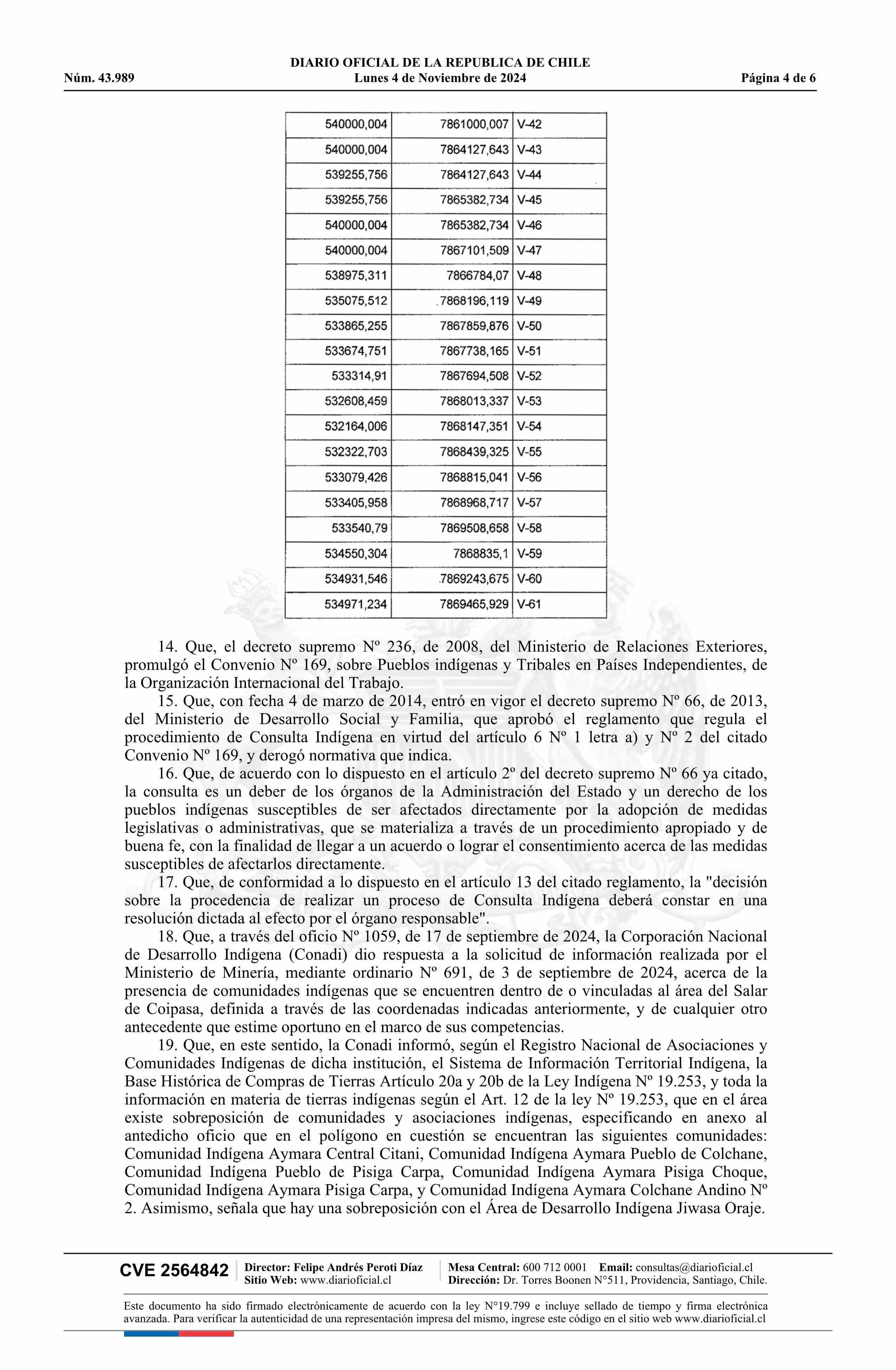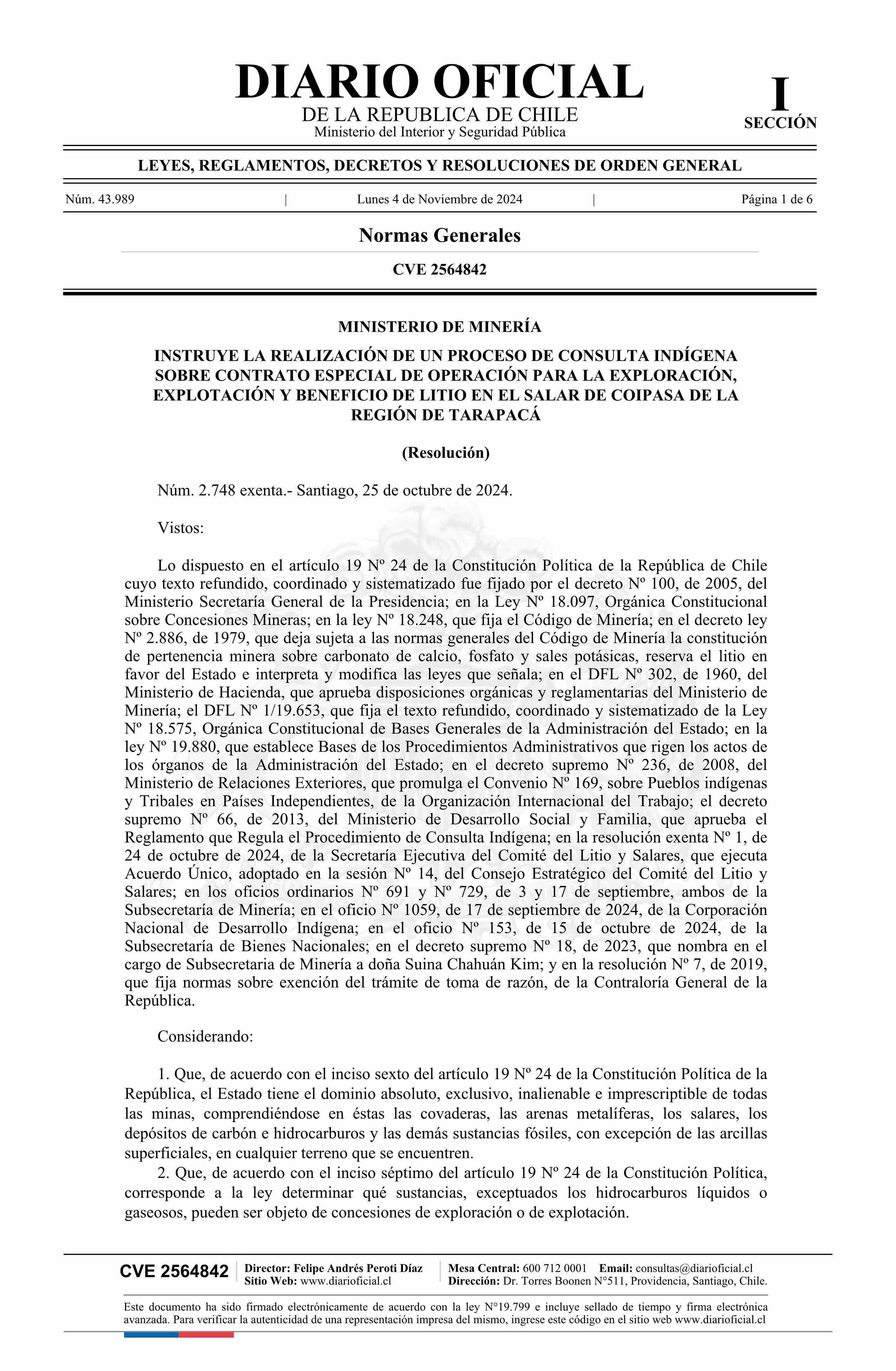 | Título: | Resolución exenta número 2.748, de 2024.- Instruye la realización de un proceso de consulta indígena sobre contrato especial de operación para la exploración, explotación y beneficio de litio en el Salar de Coipasa de la Región de Tarapacá |