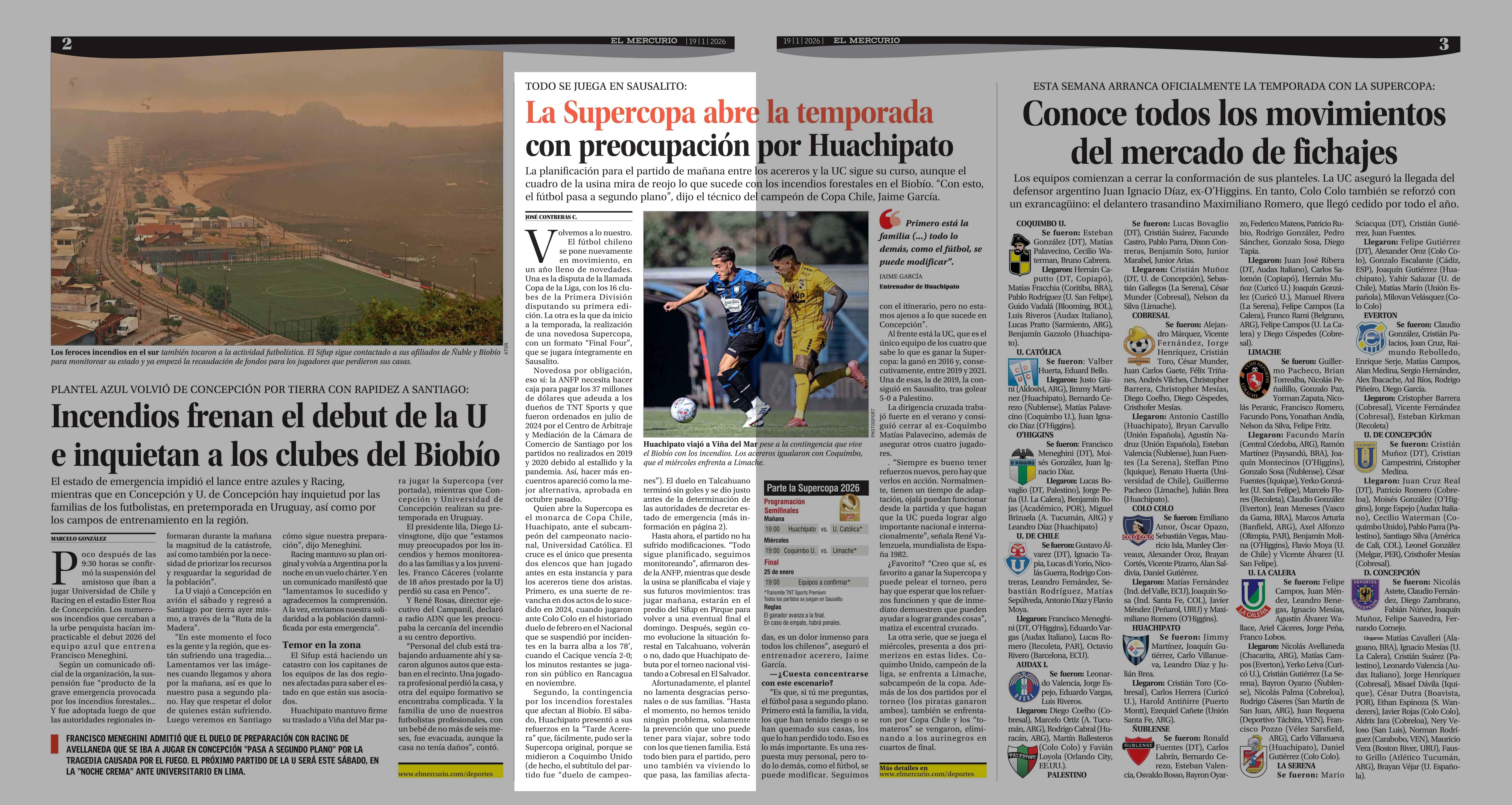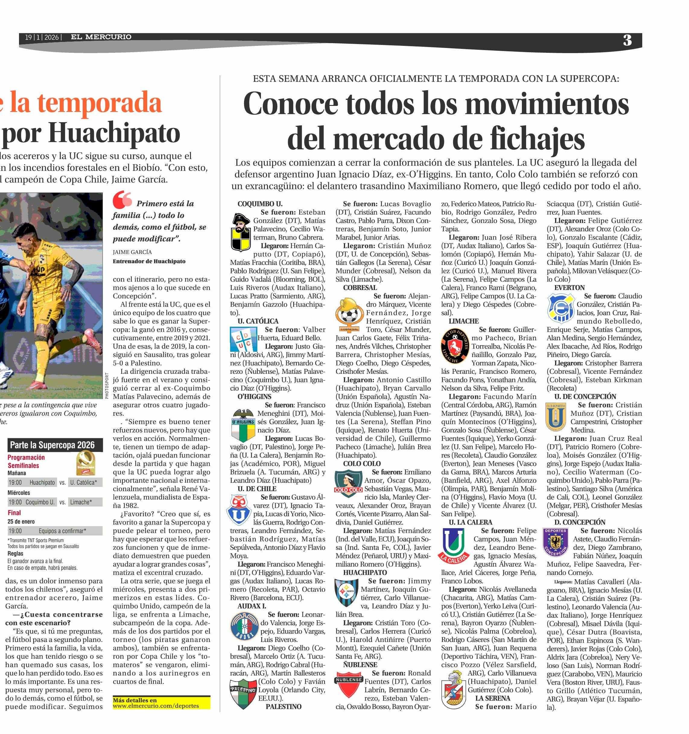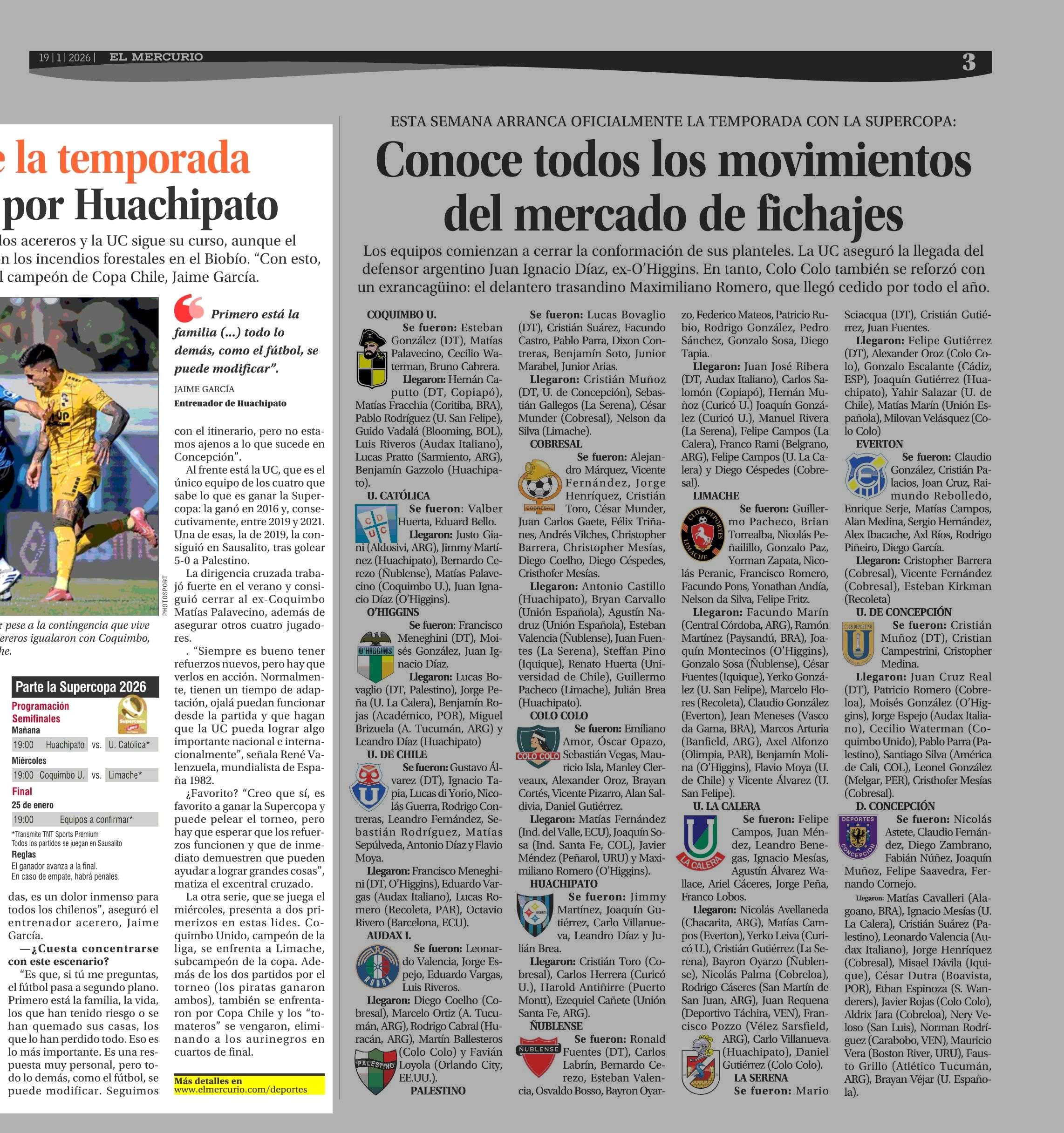 La Supercopa abre la temporada con preocupación por Huachipato 19-01-2026 El Mercurio |