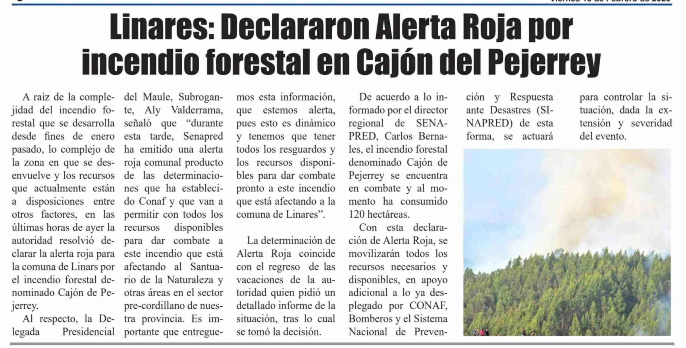 Linares: Declararon Alerta Roja por incendio forestal en Cajón del Pejerrey 13-02-2026 El Heraldo |