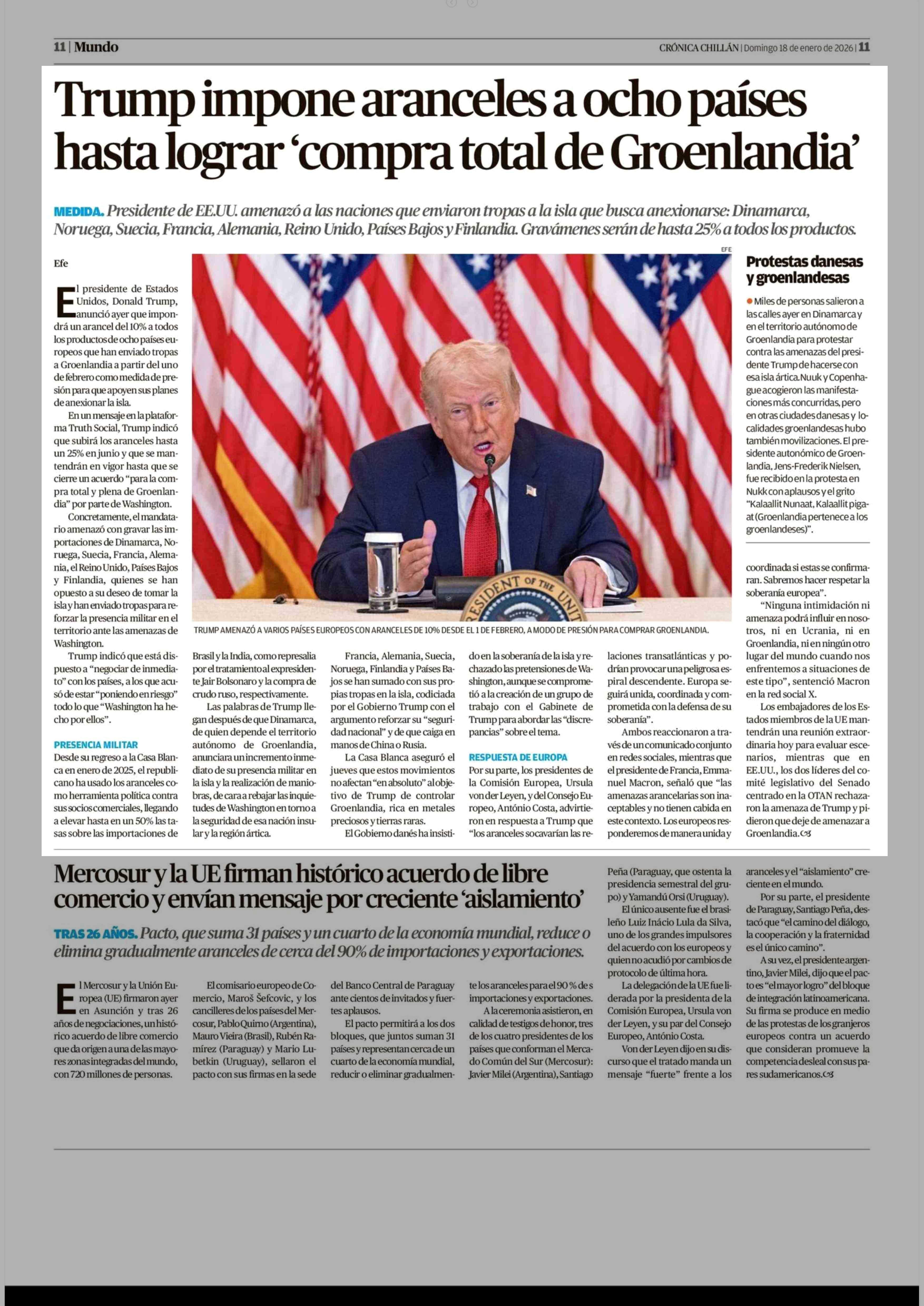 Trump impone aranceles a ocho países hasta lograr 'compra total de Groenlandia' 18-01-2026 Crónica de Chillán |