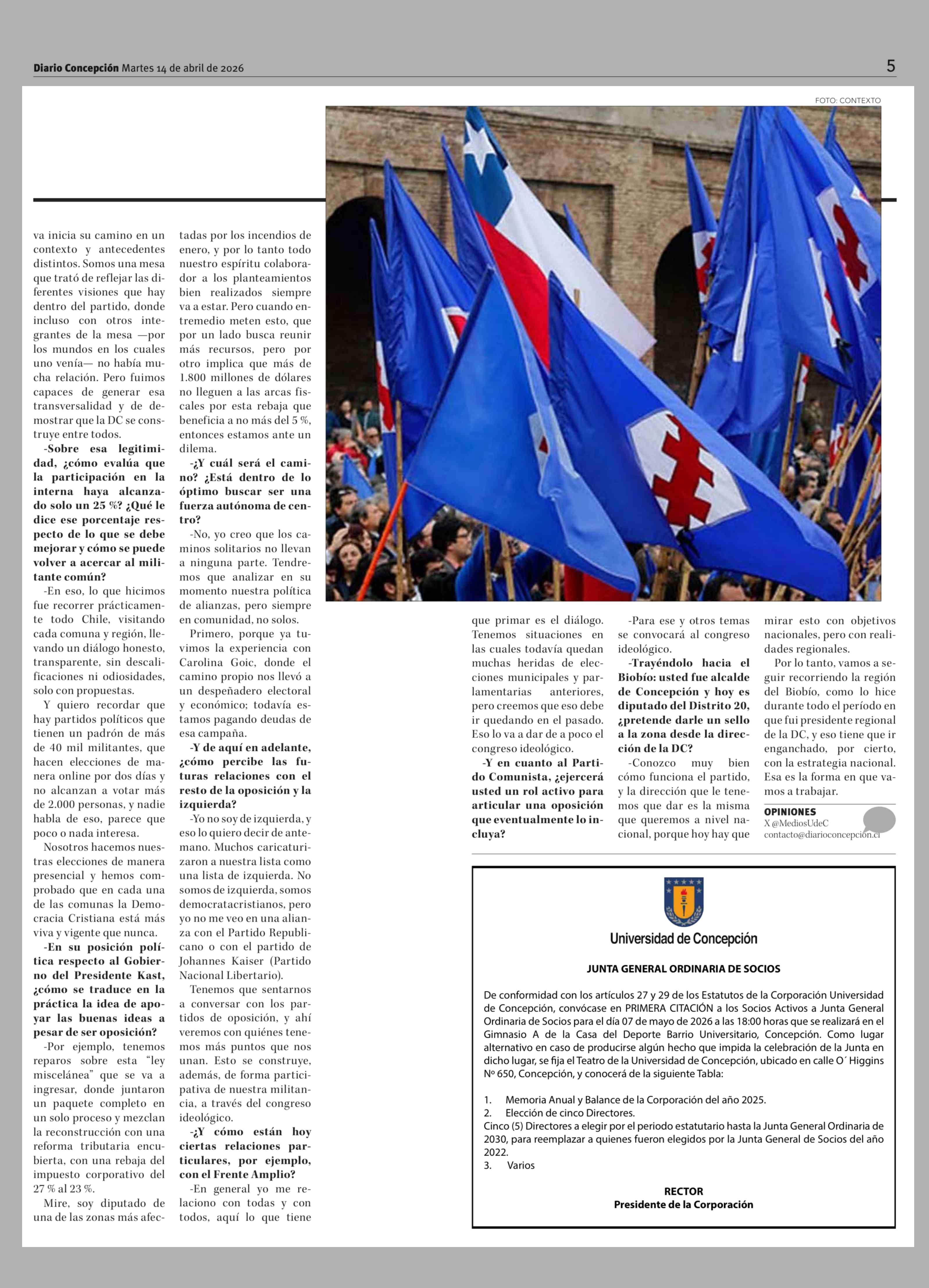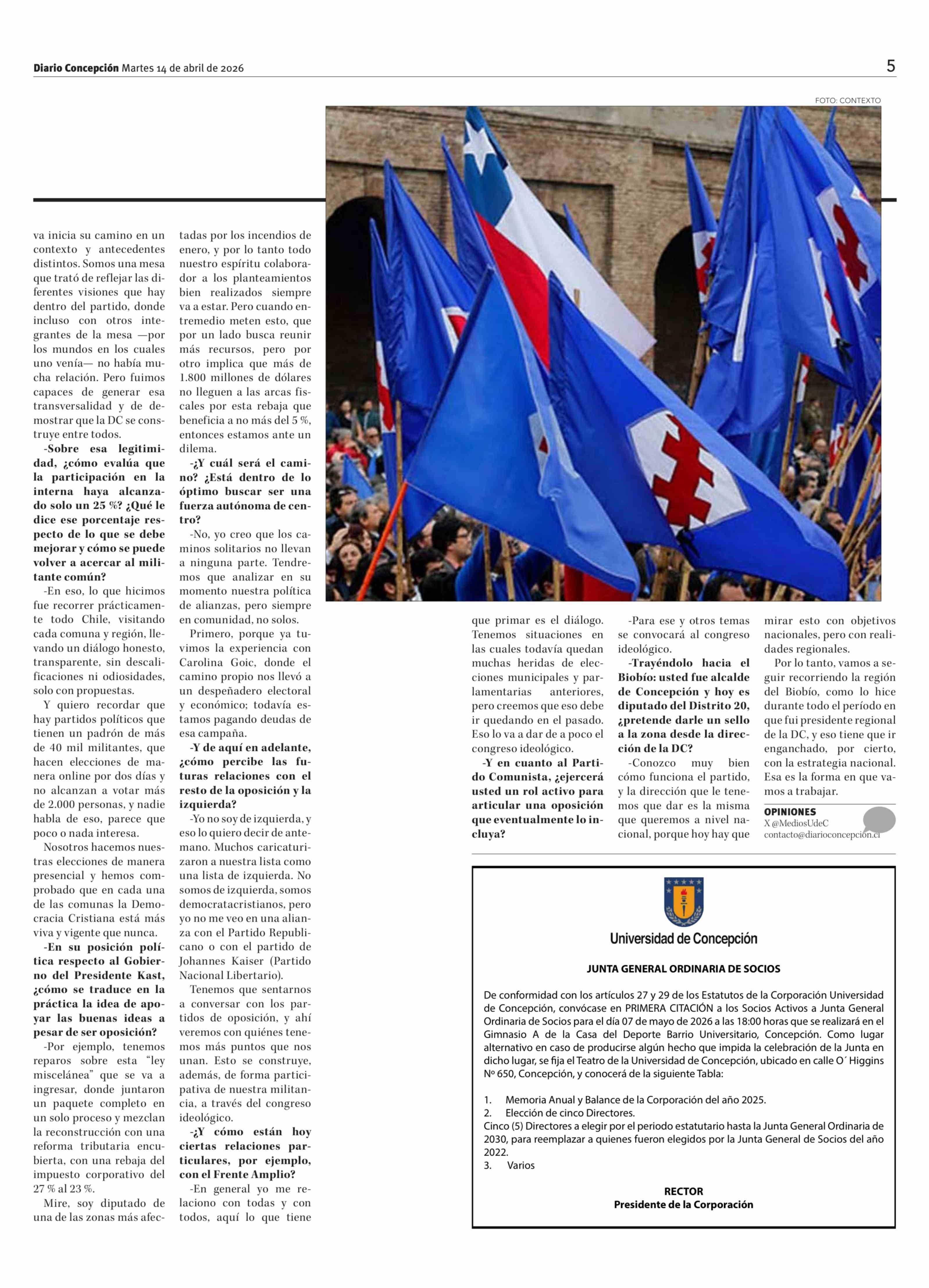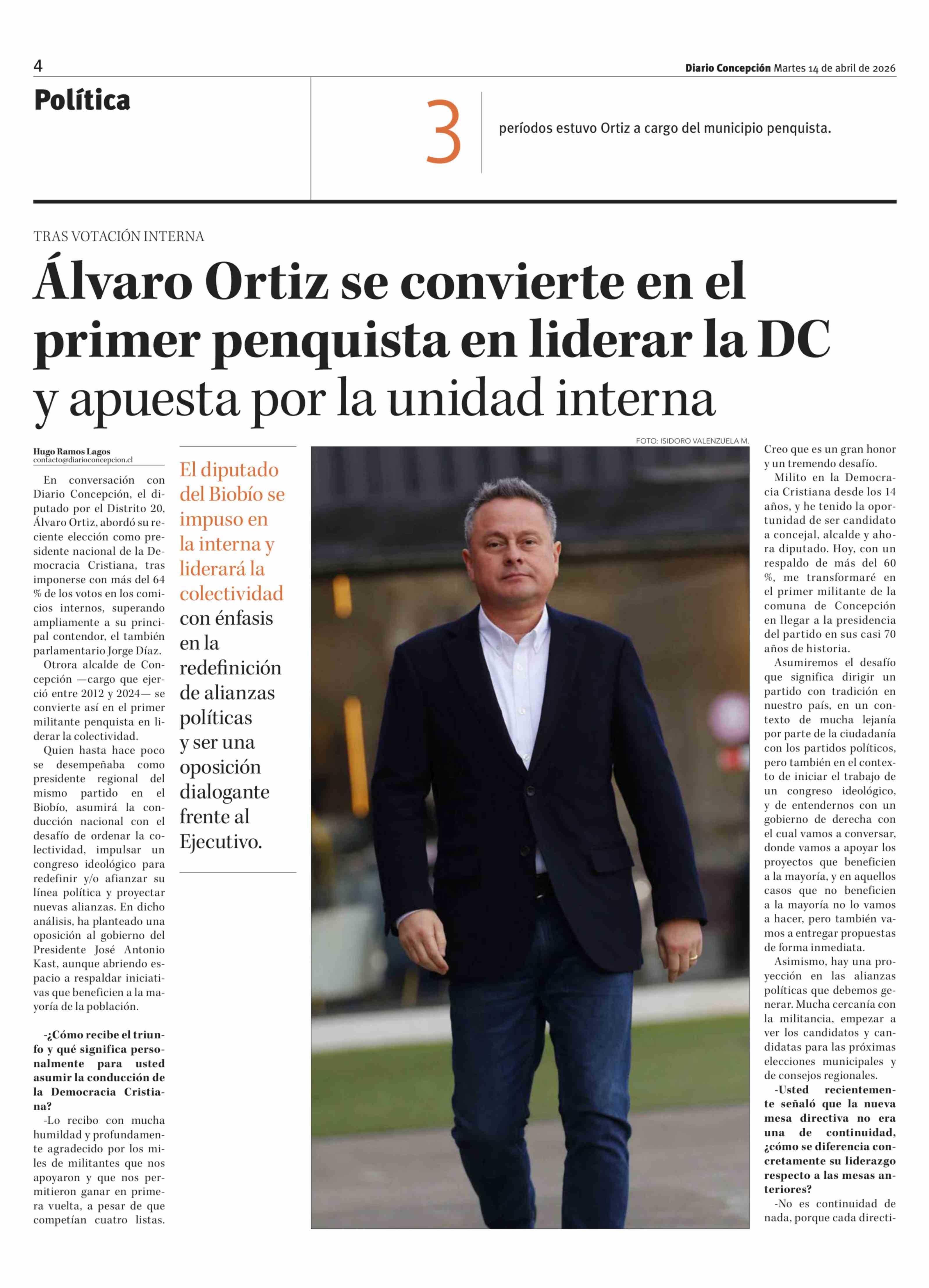 Álvaro Ortiz se convierte en el primer penquista en liderar la DC y apuesta por la unidad interna 14-04-2026 Diario Concepción |