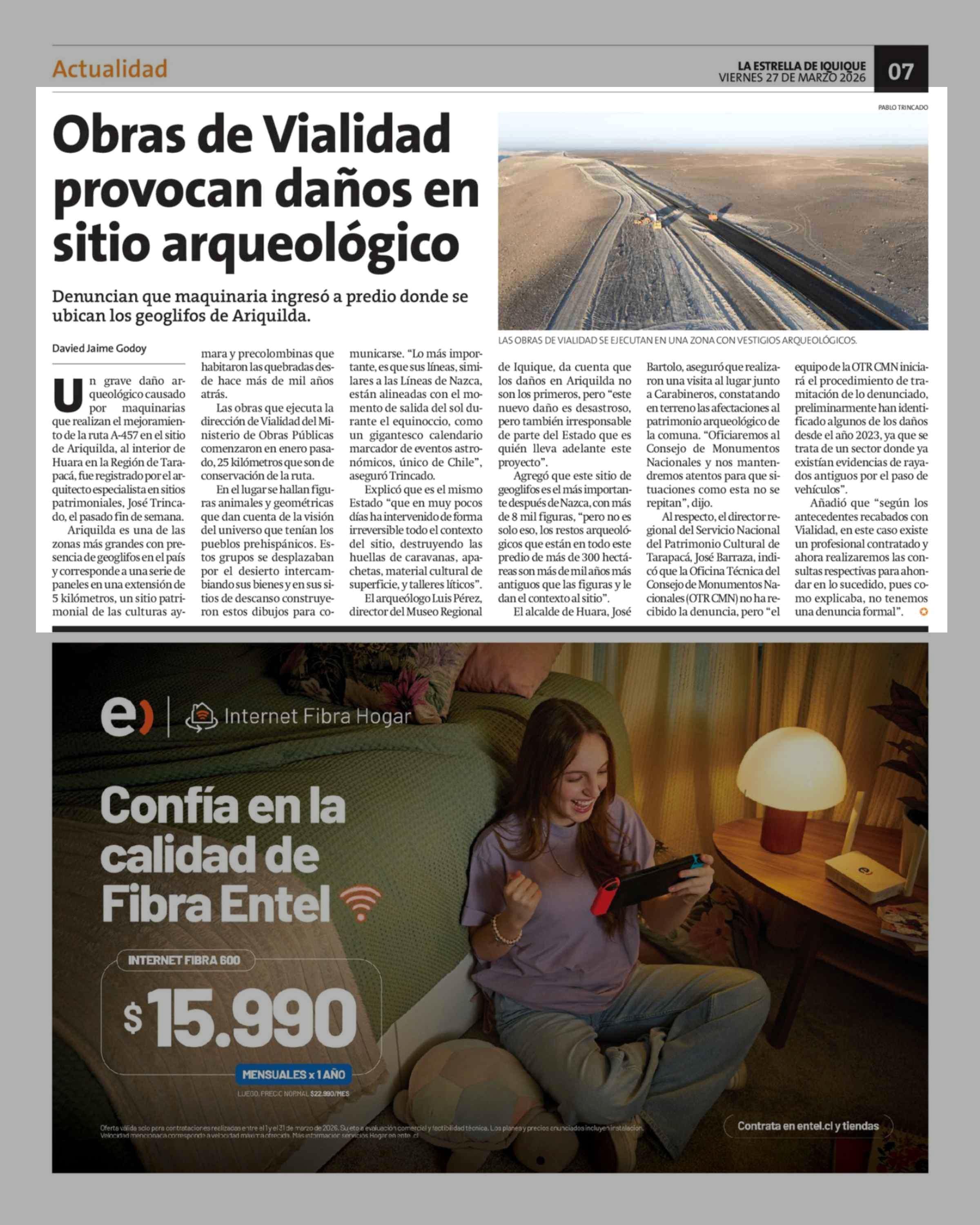 Obras de Vialidad provocan daños en sitio arqueológico 27-03-2026 La Estrella de Iquique |