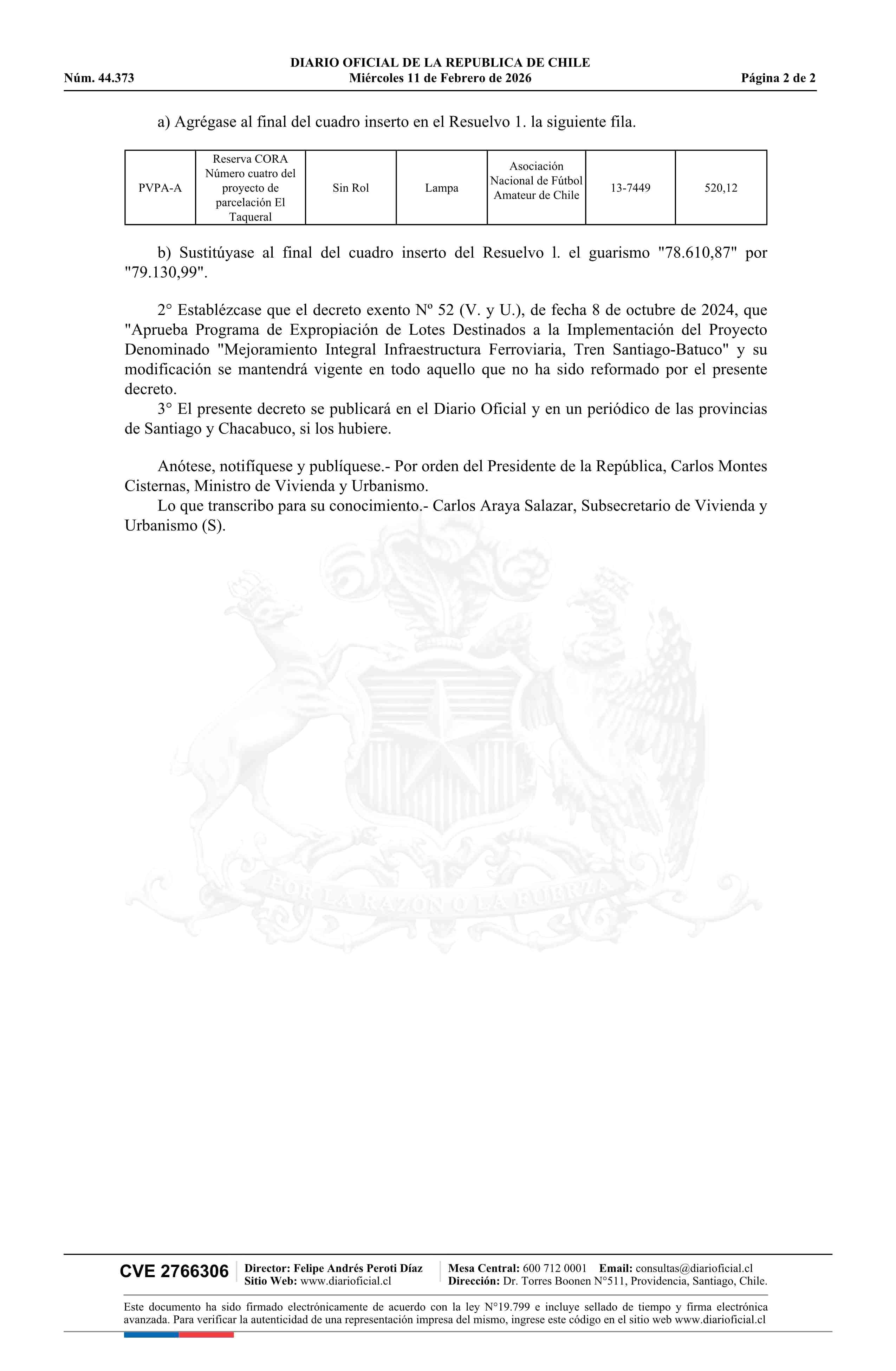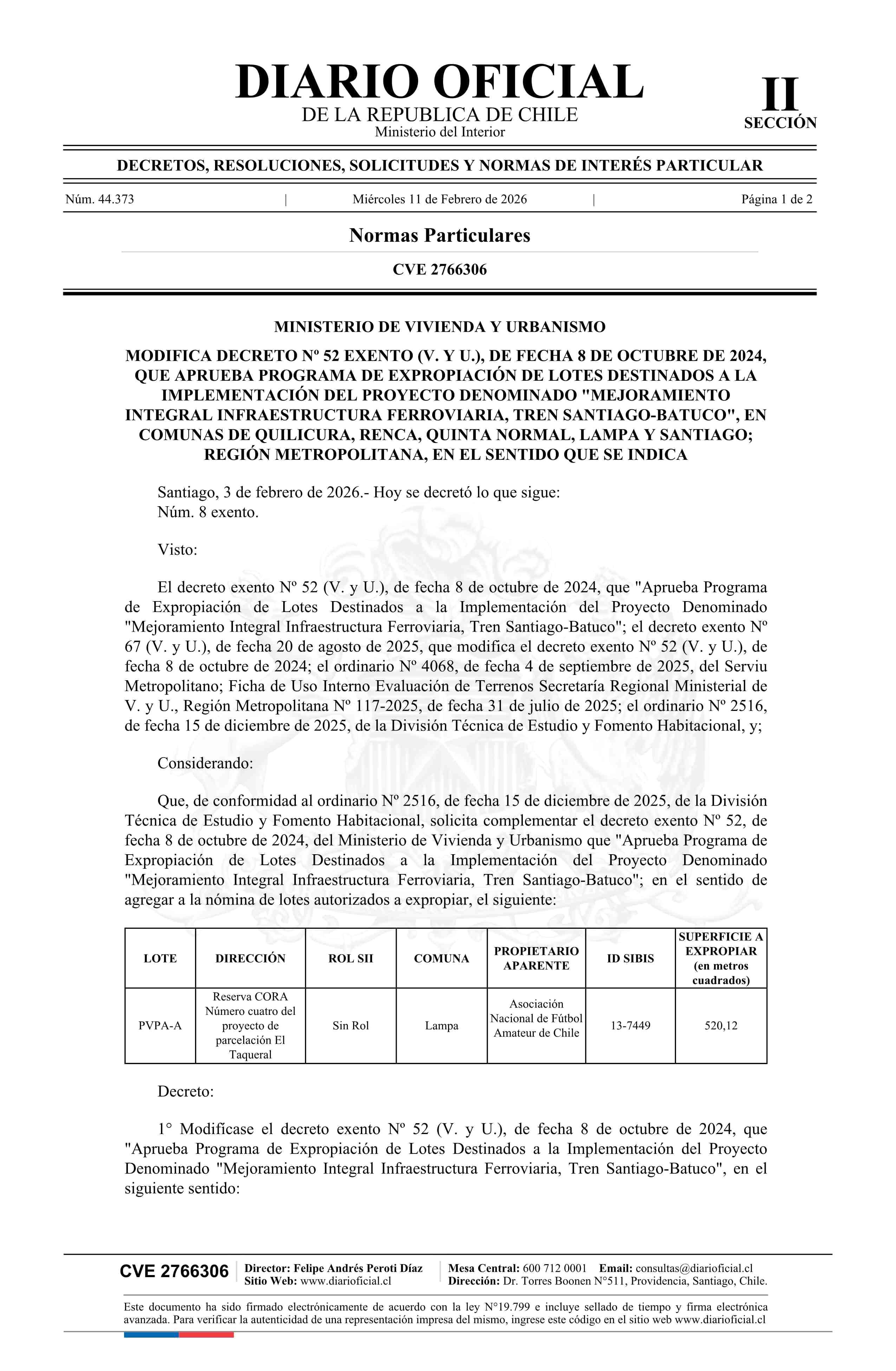 | Título: | Decreto exento número 8, de 2026.- Modifica decreto N° 52 exento, de 2024, que aprueba programa de expropiación de lotes destinados a la implementación del proyecto denominado Mejoramiento Integral Infraestructura Ferroviaria, Tren Santiago-Batuco, en comunas de Quilicura, Renca, Quinta Normal, Lamp |