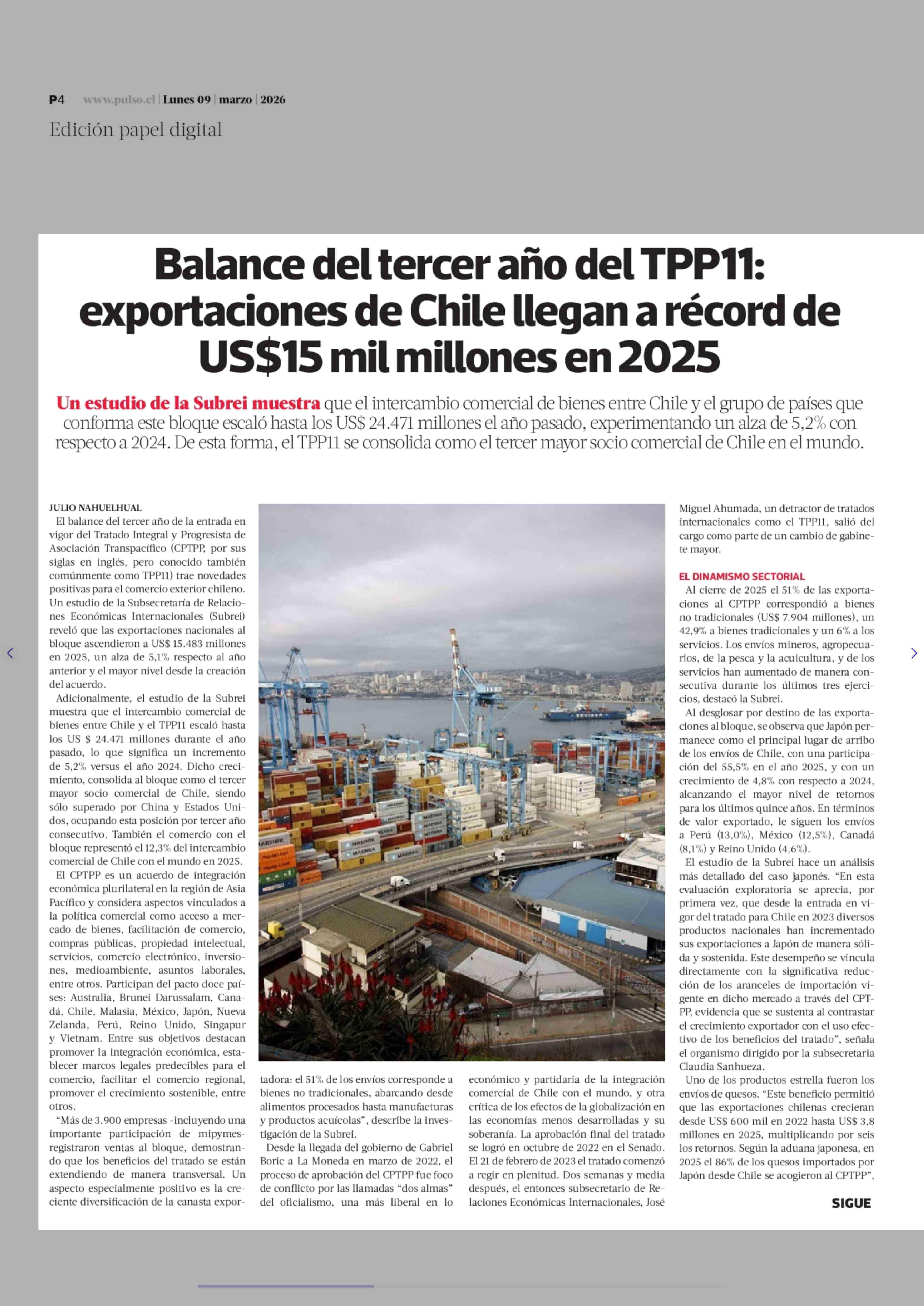 Título: Balance del tercer año del TPP11: exportaciones de Chile llegan a récord de US$15 mil millones en 2025