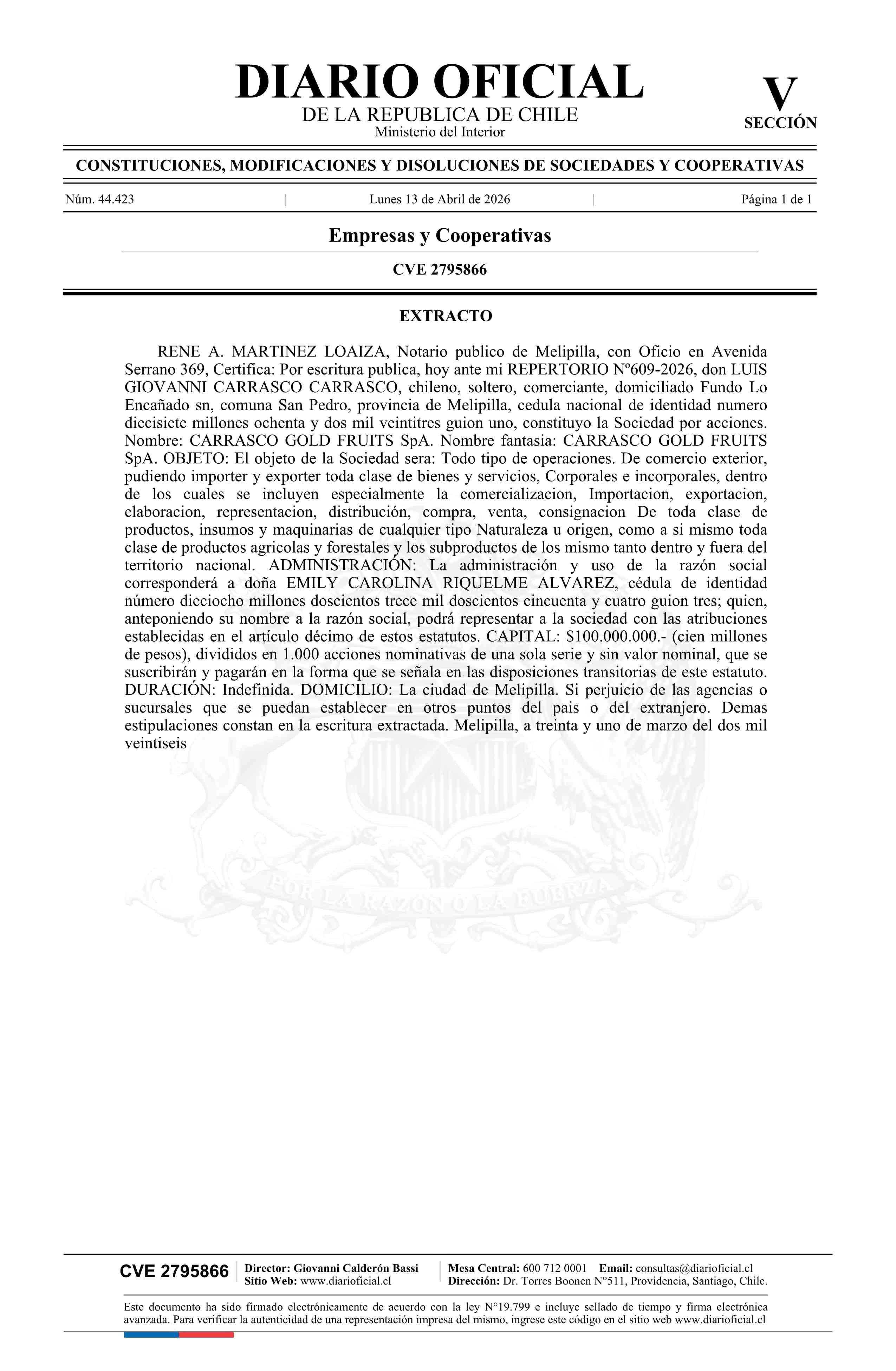 CARRASCO GOLD FRUITS SpA 13-04-2026 Diario Oficial Edición Electrónica |