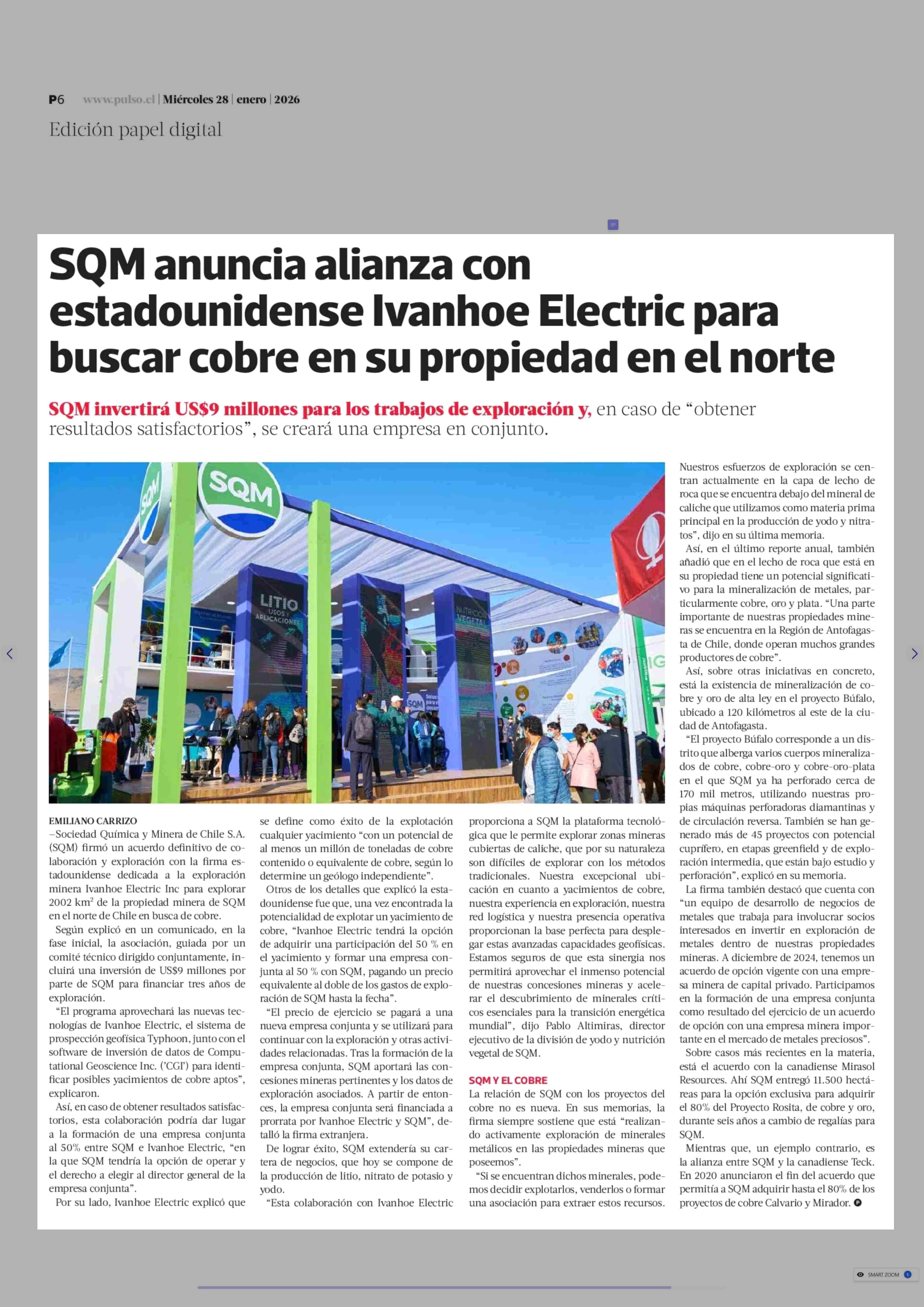 | Título: | SQM anuncia alianza con estadounidense Ivanhoe Electric para buscar cobre en su propiedad en el norte |