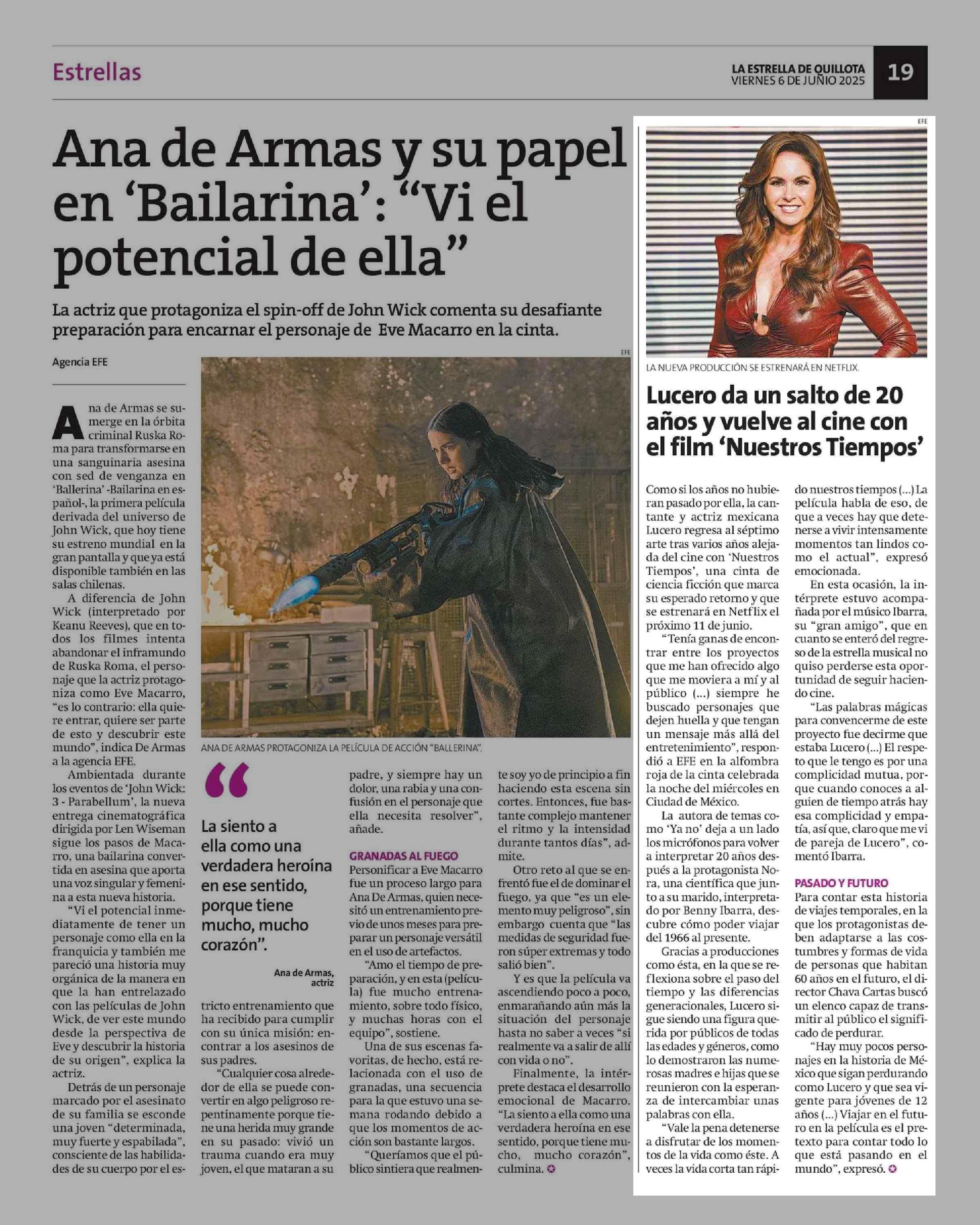 Lucero da un salto de 20 años y vuelve al cine con el film “Nuestros Tiempos” 06-06-2025 La Estrella de Quillota |