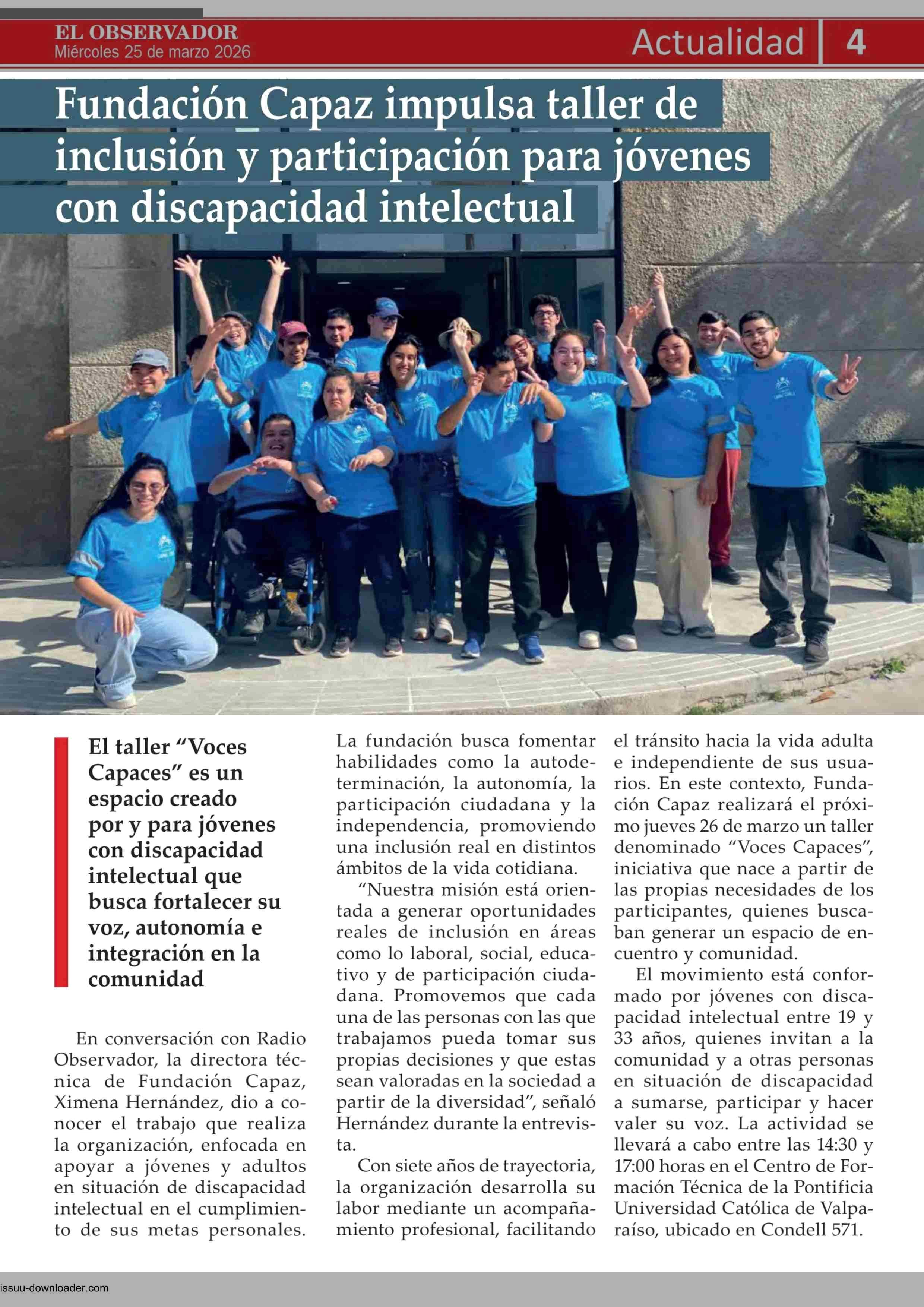 Fundación Capaz impulsa taller de inclusión y participación para jóvenes con discapacidad intelectual 25-03-2026 El Observador Vespertino |