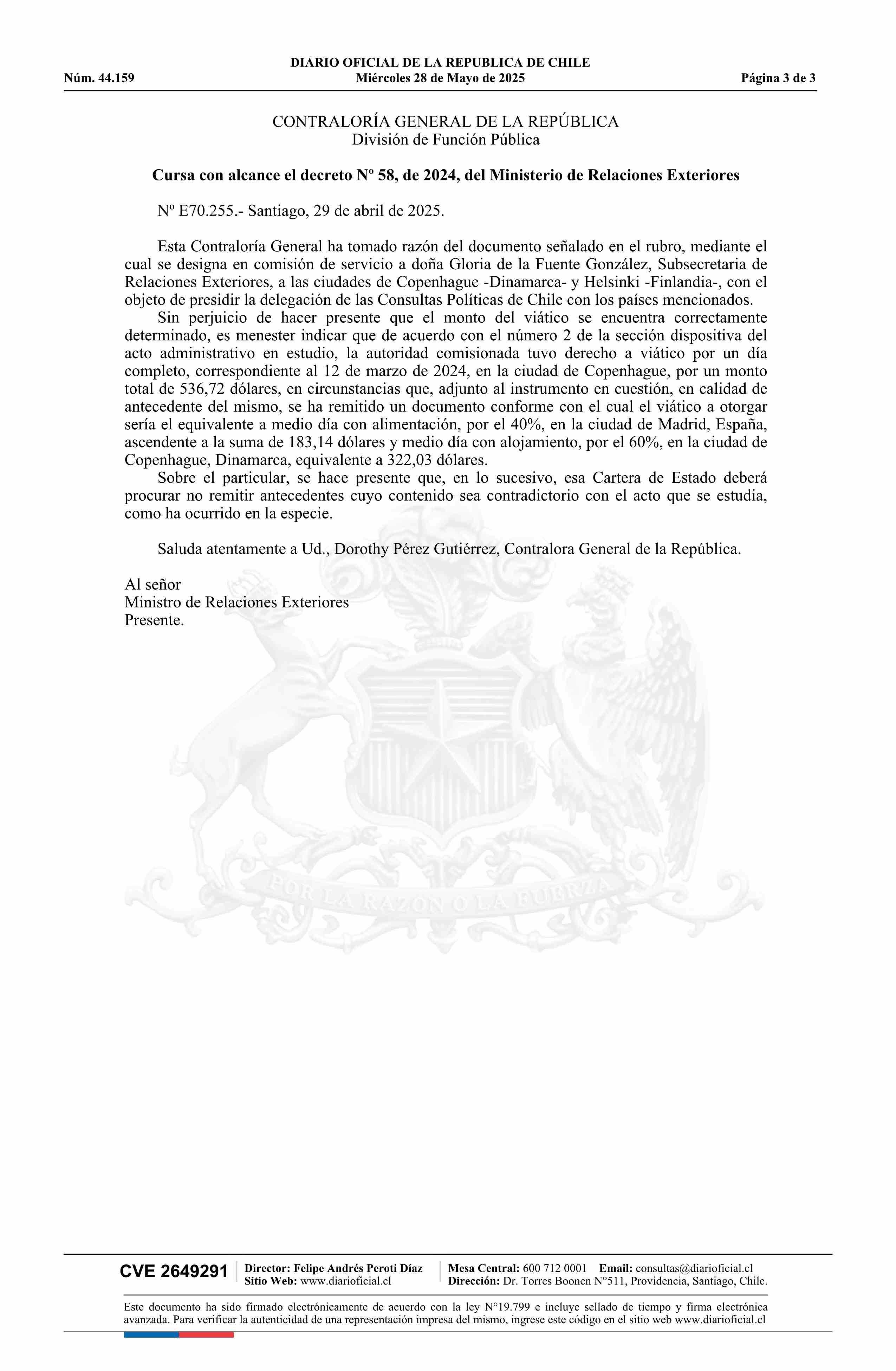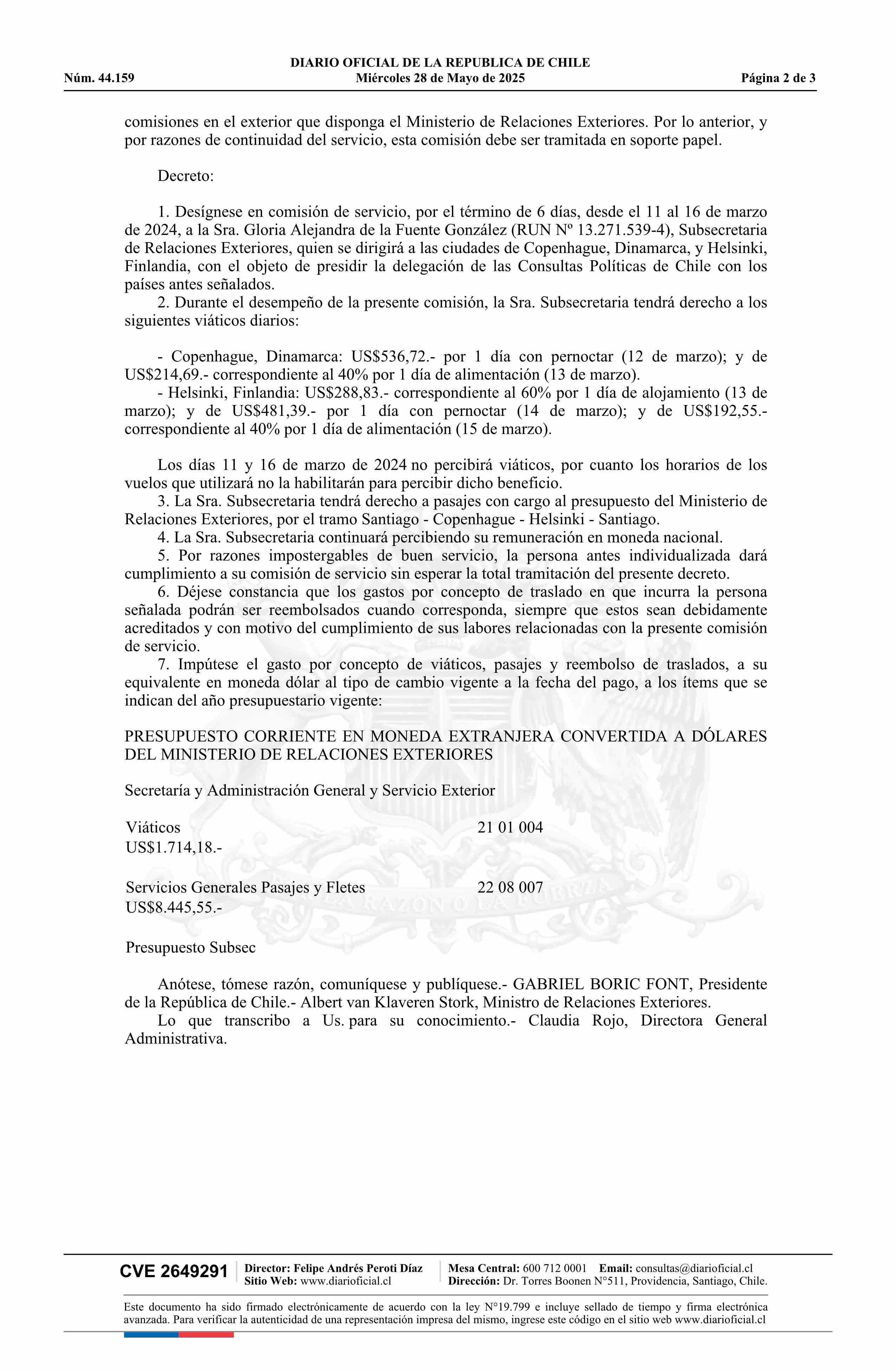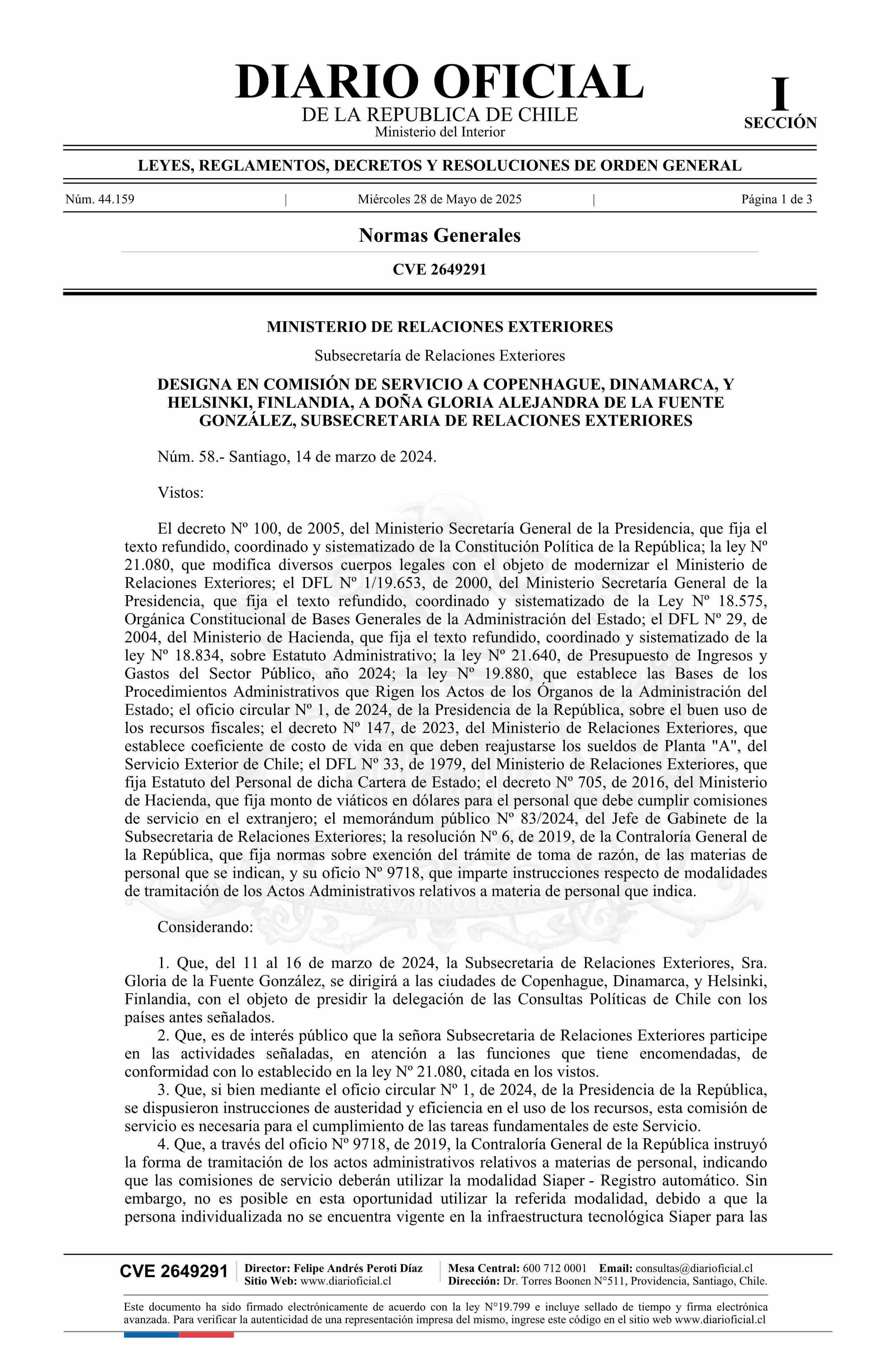 Decreto número 58, de 2024.- Designa a doña Gloria Alejandra de la Fuente González, Subsecretaria de Relaciones Exteriores, en comisión de servicio a Copenhague, Dinamarca, y Helsinki, Finlandia 28-05-2025 DIARIO OFICIAL CHILE - BOLETÍN OFICIAL DE MINERÍA |