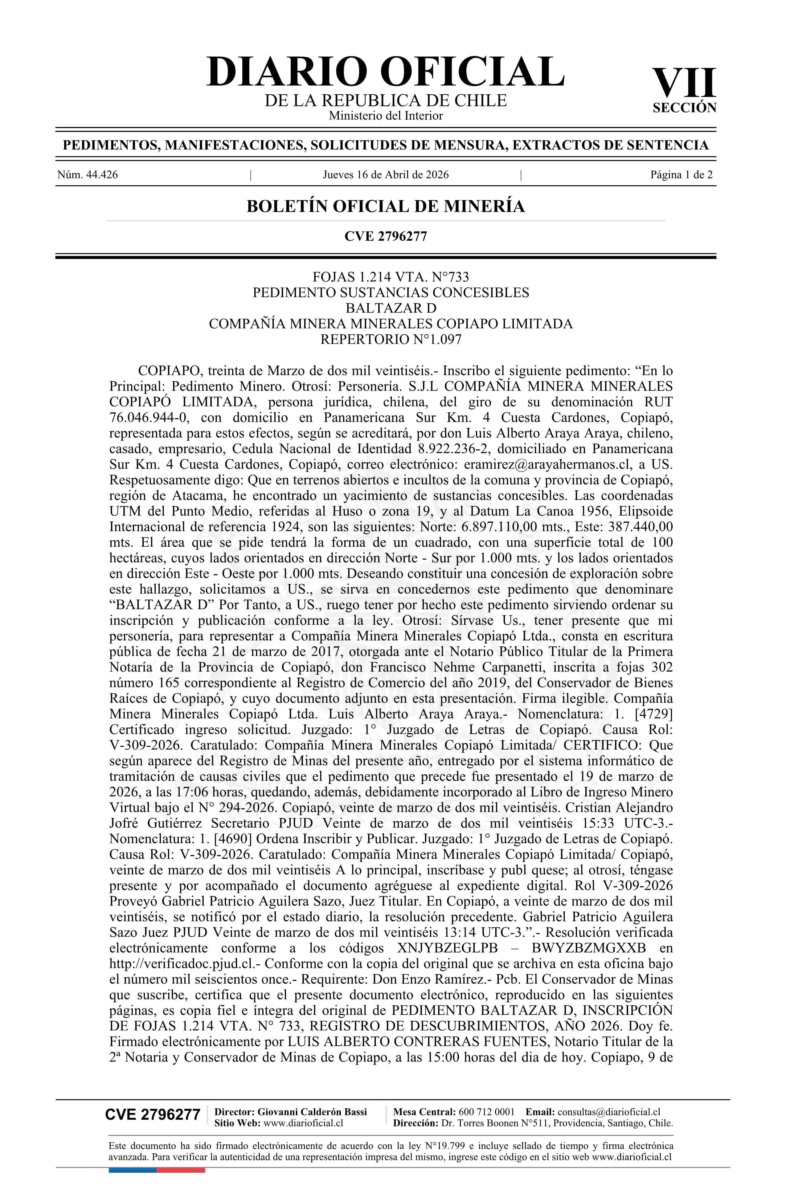 BALTAZAR D / Compañía Minera Minerales Copiapó Limitada 16-04-2026 DIARIO OFICIAL CHILE - BOLETÍN OFICIAL DE MINERÍA |