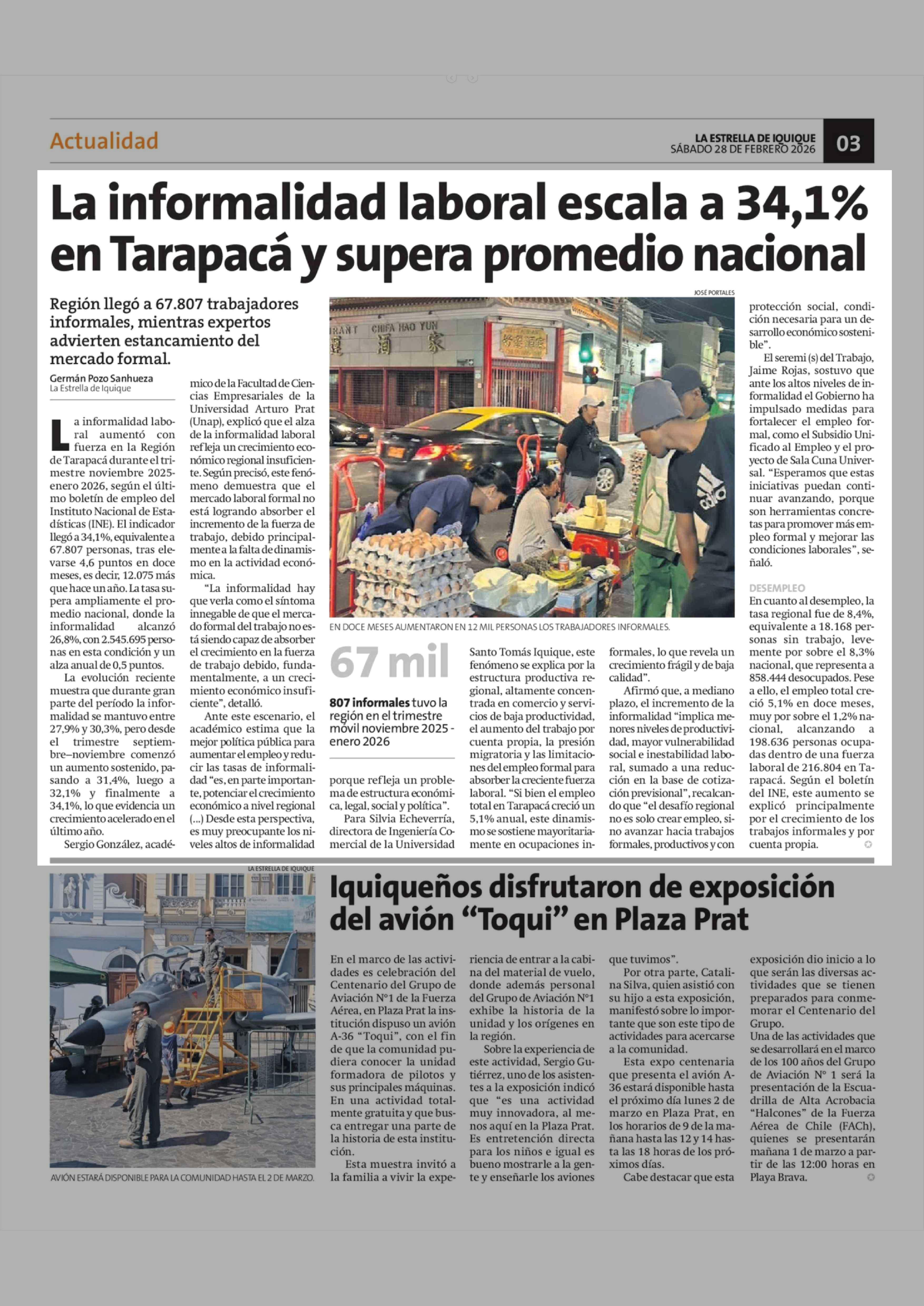 La informalidad laboral escala a 34,1% en Tarapacá y supera promedio nacional 28-02-2026 La Estrella de Iquique |