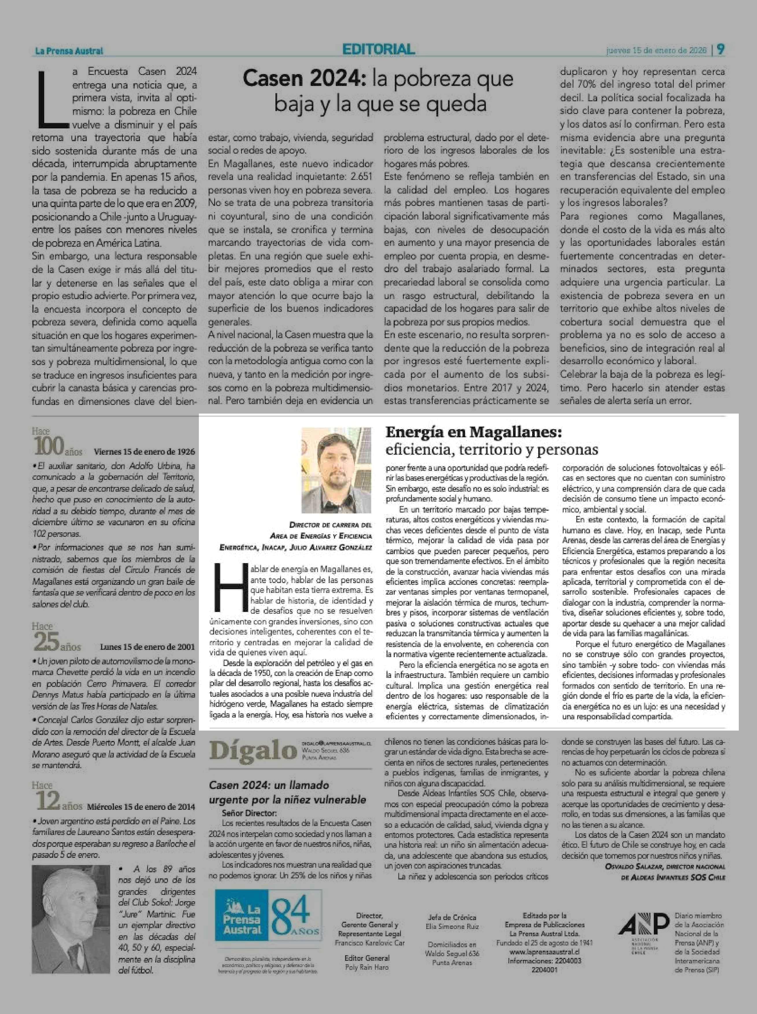 Columnas de Opinión: Energía en Magallanes: eficiencia, territorio y personas 15-01-2026 La Prensa Austral |
