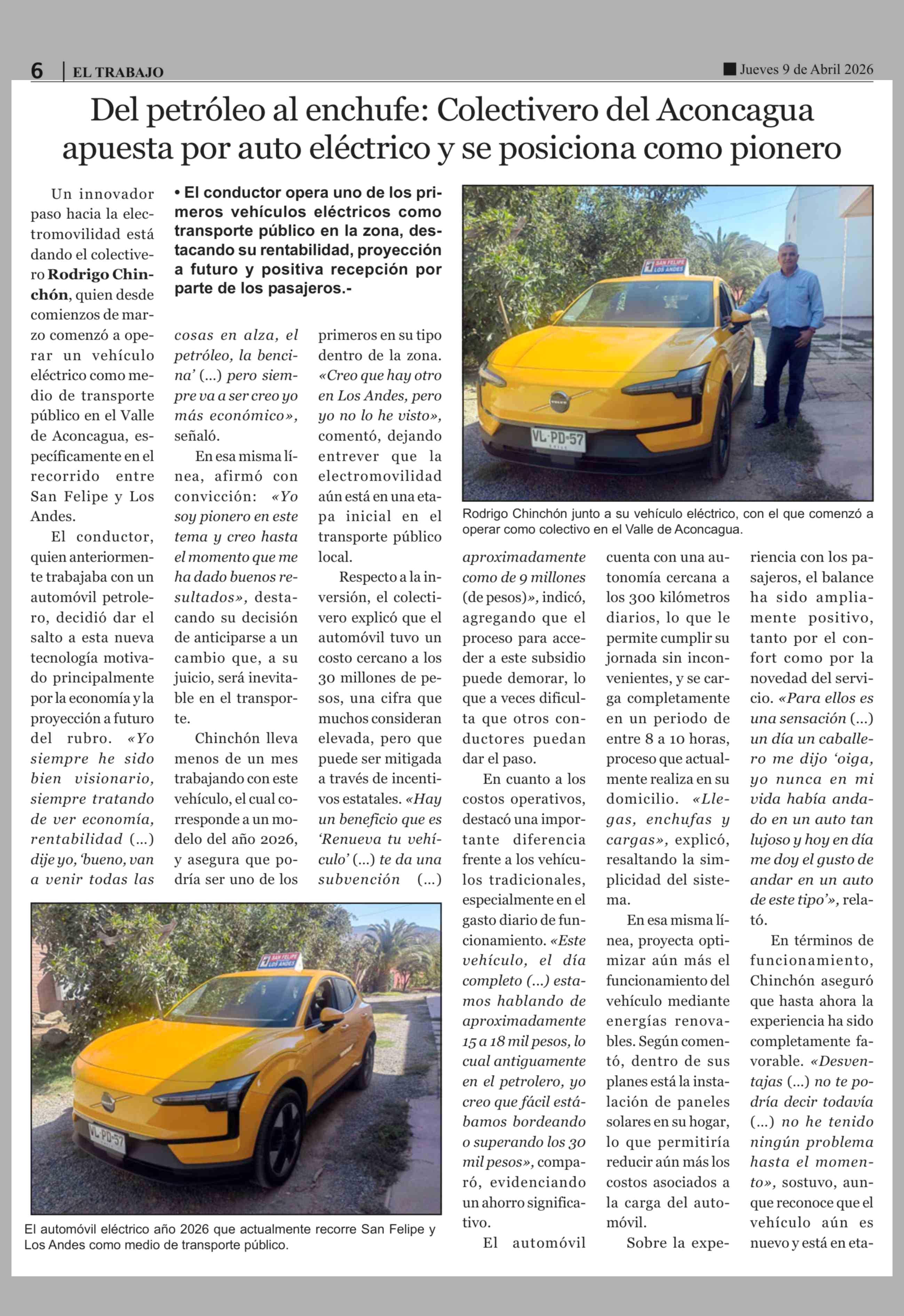 Del petróleo al enchufe: Colectivero del Aconcagua apuesta por auto eléctrico y se posiciona como pionero 09-04-2026 El Trabajo |