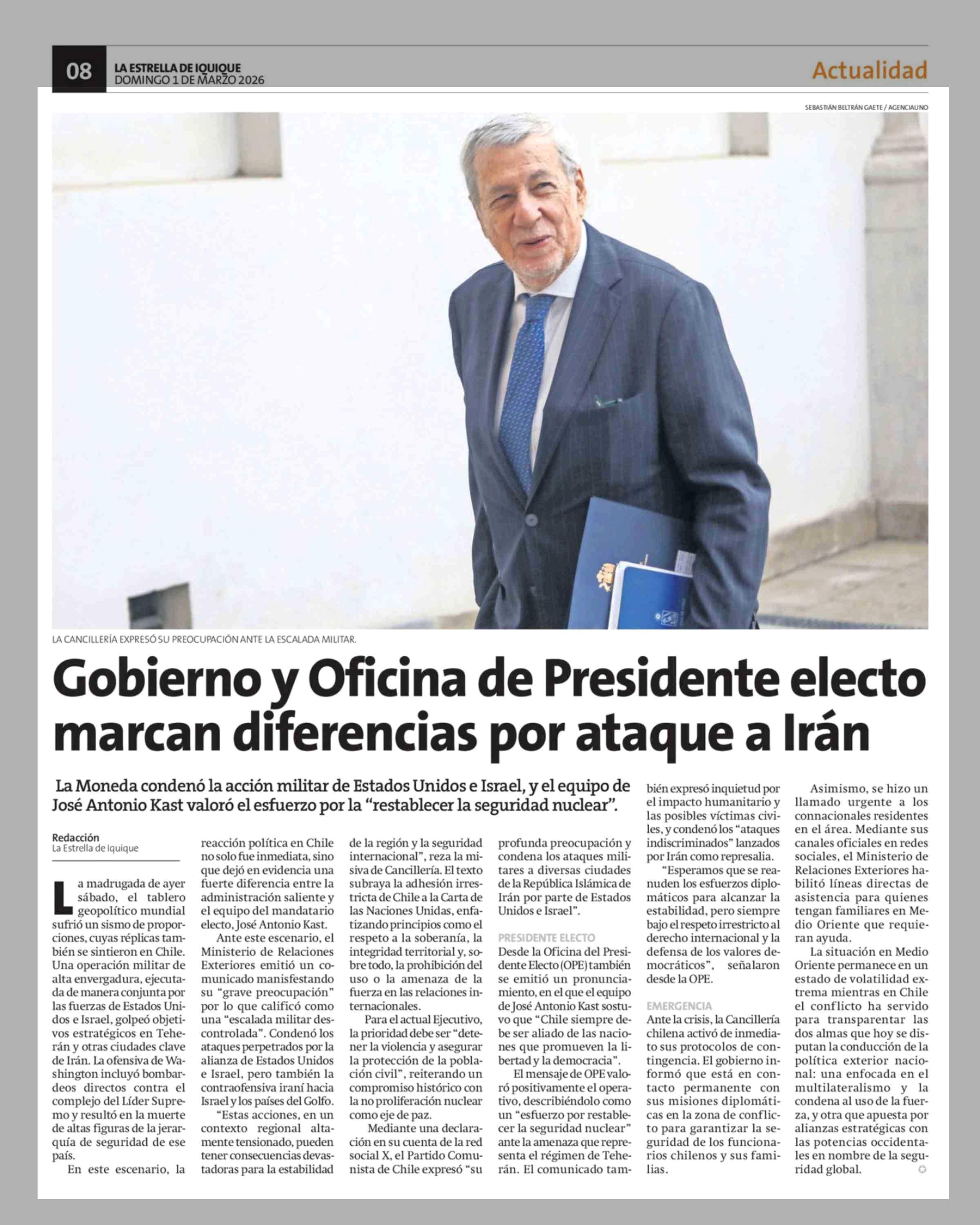 Gobierno y Oficina de Presidente electo marcan diferencias por ataque a Irán 01-03-2026 La Estrella de Iquique |