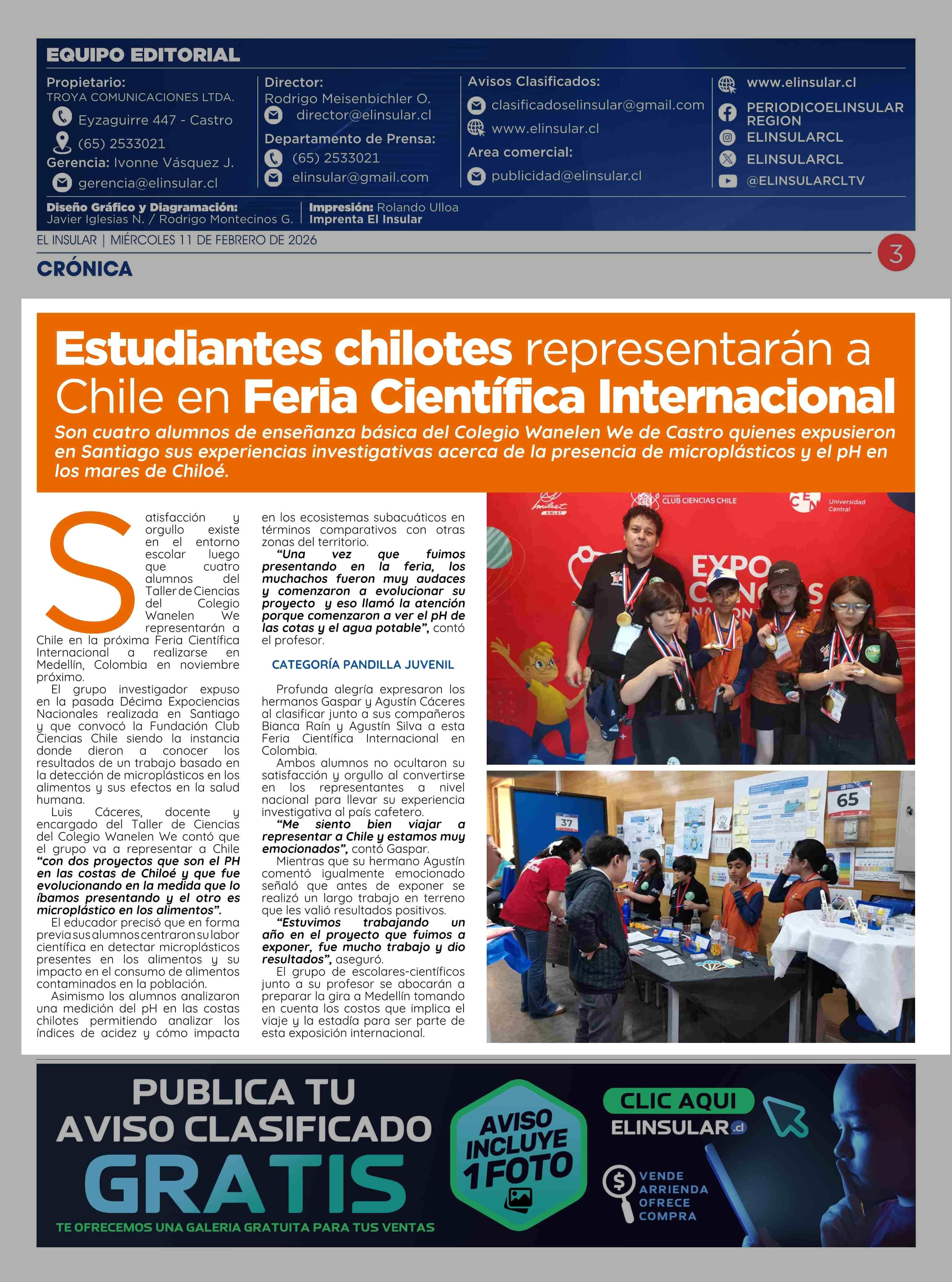 Estudiantes chilotes representarán a Chile en Feria Científica Internacional 11-02-2026 El Insular |