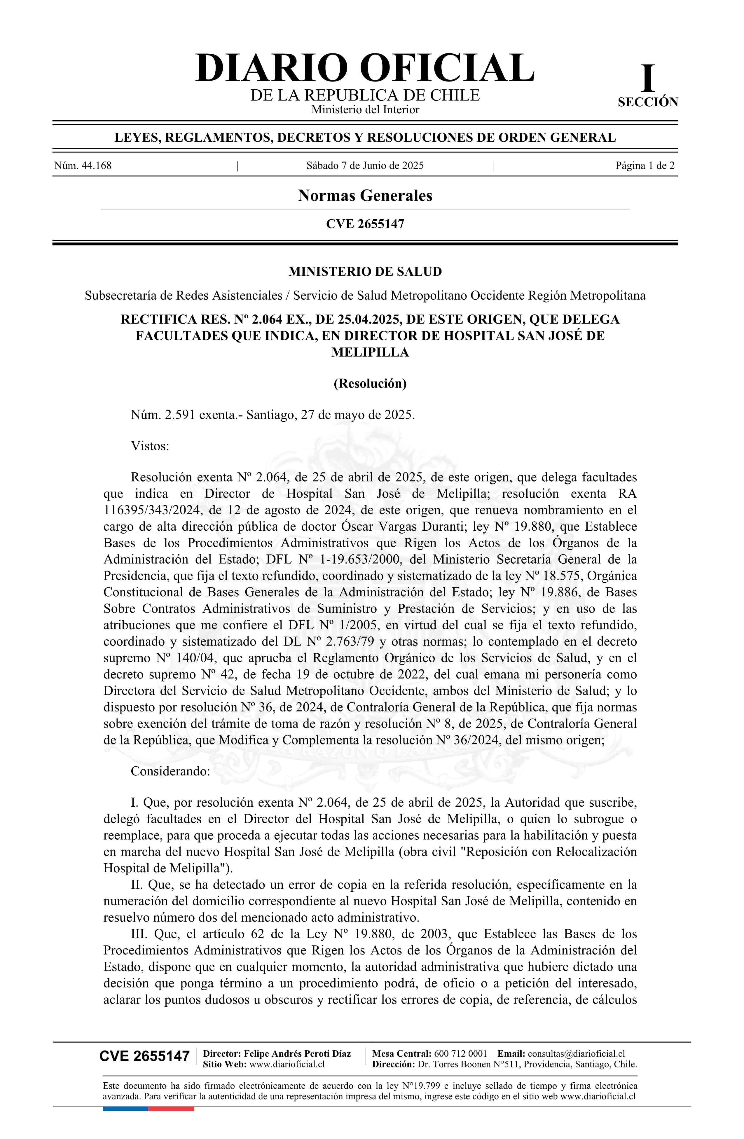 Resolución exenta número 2.591, de 2025.- Rectifica resolución Nº 2.064 exenta, 2025, que delega facultades que indica, en Director de Hospital San José de Melipilla 07-06-2025 Diario Oficial Edición Electrónica |