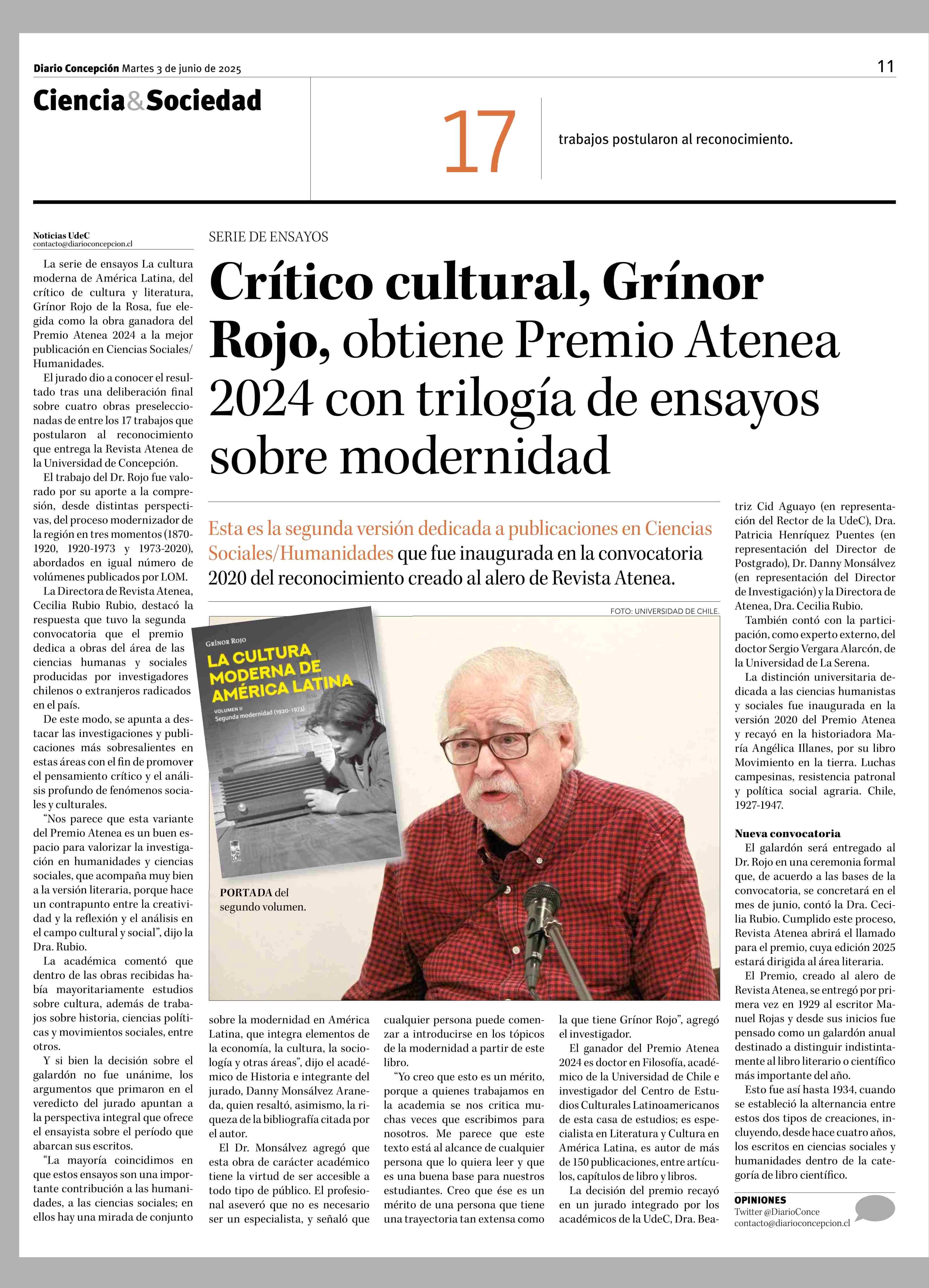 Título: Crítico cultural, Grínor Rojo, obtiene Premio Atenea 2024 con trilogía de ensayos sobre modernidad