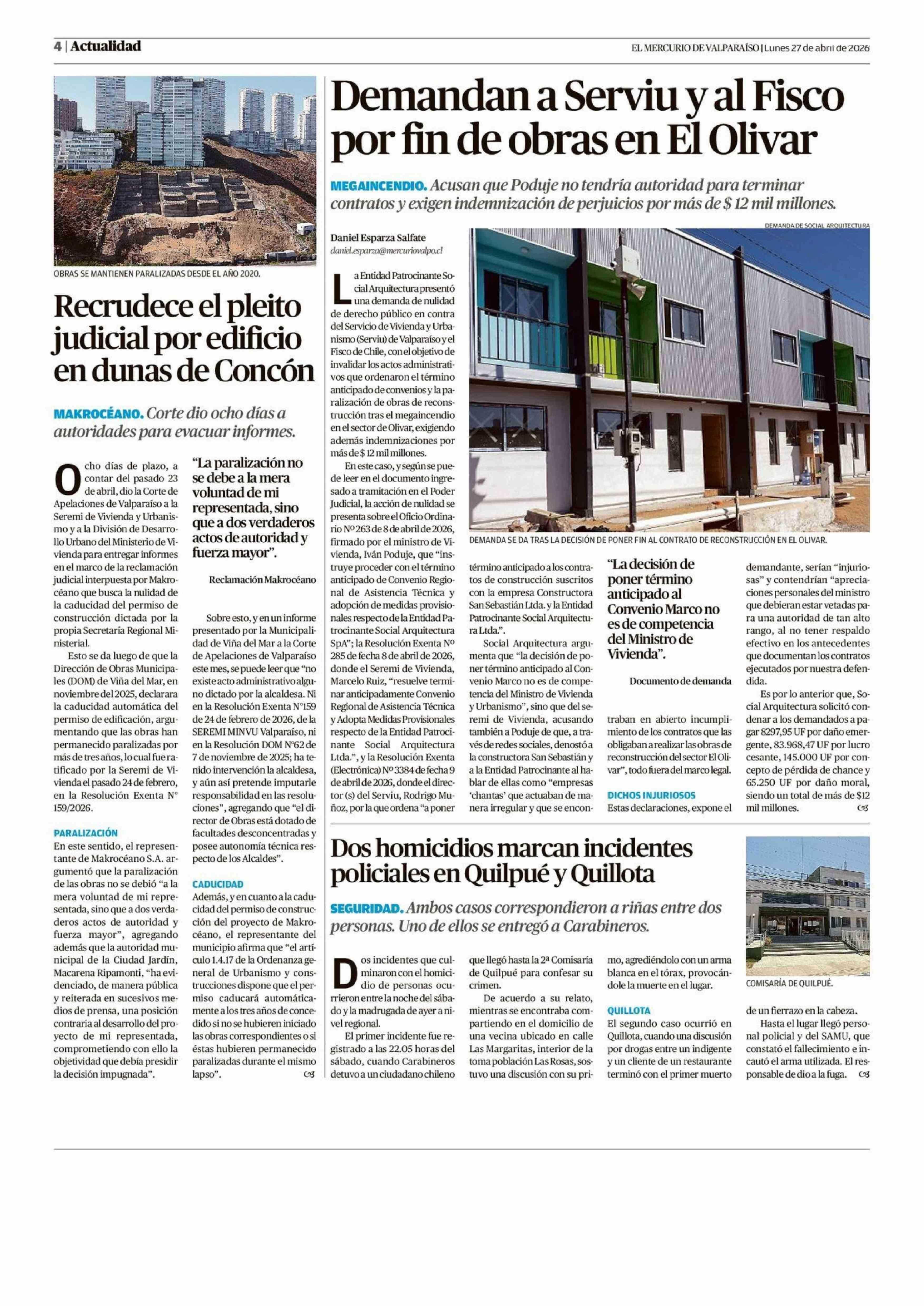 Demandan a Serviu y al Fisco por fin de obras en El Olivar 27-04-2026 El Mercurio de Valparaíso |
