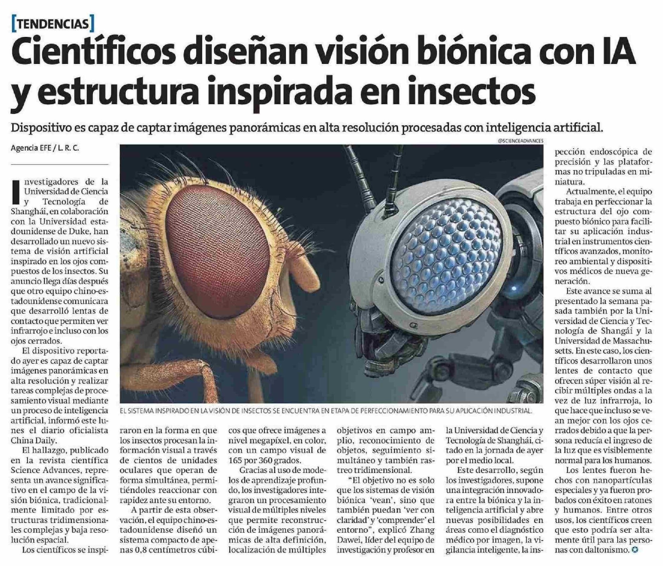 Científicos diseñan visión biónica con lA y estructura inspirada en insectos 29-05-2025 La Estrella de Arica |