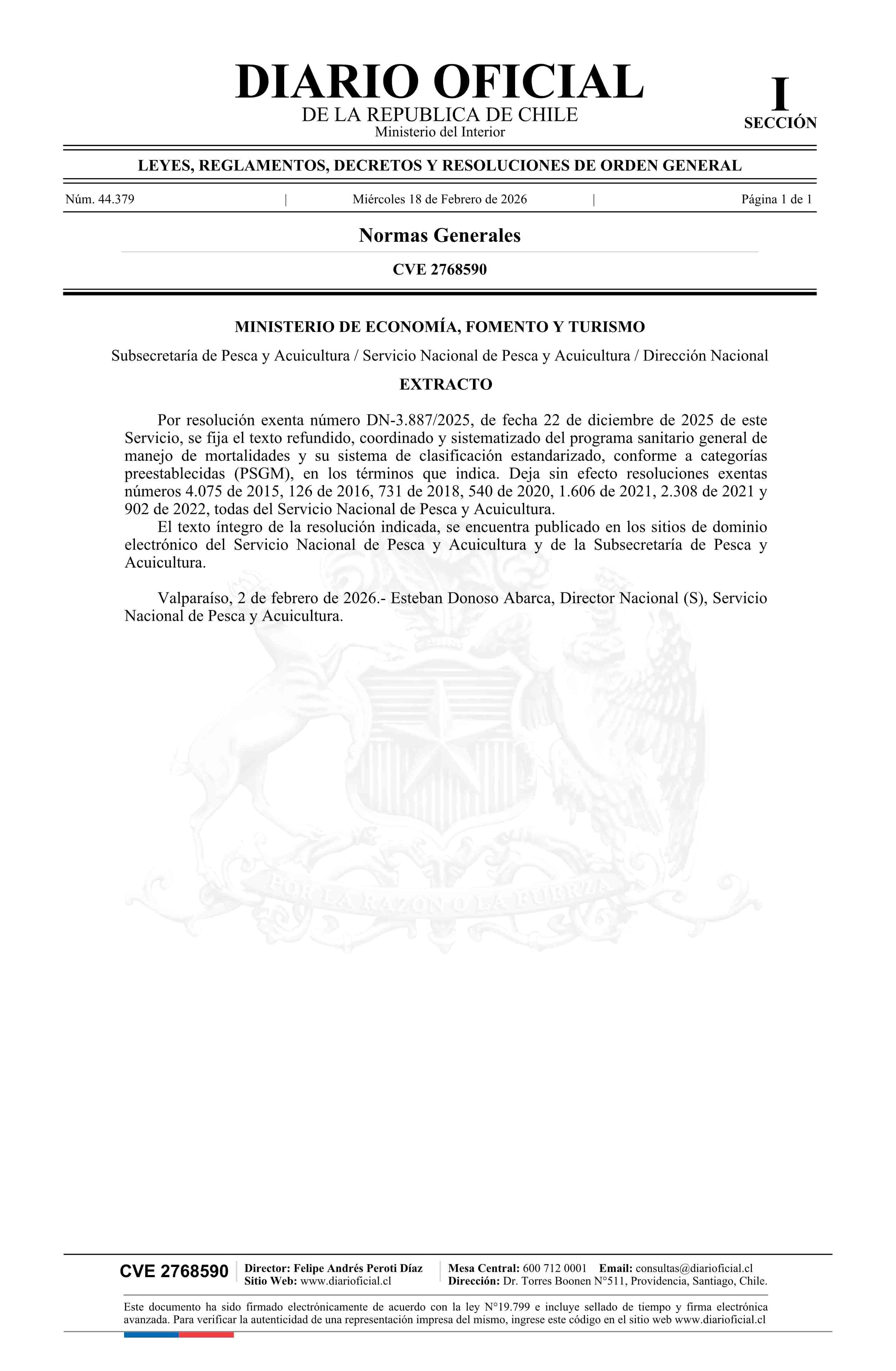 | Título: | Extracto de resolución exenta número DN-3.887, de 2025.- Fija texto refundido, coordinado y sistematizado del Programa Sanitario General de Manejo de Mortalidades y su sistema de clasificación estandarizado |