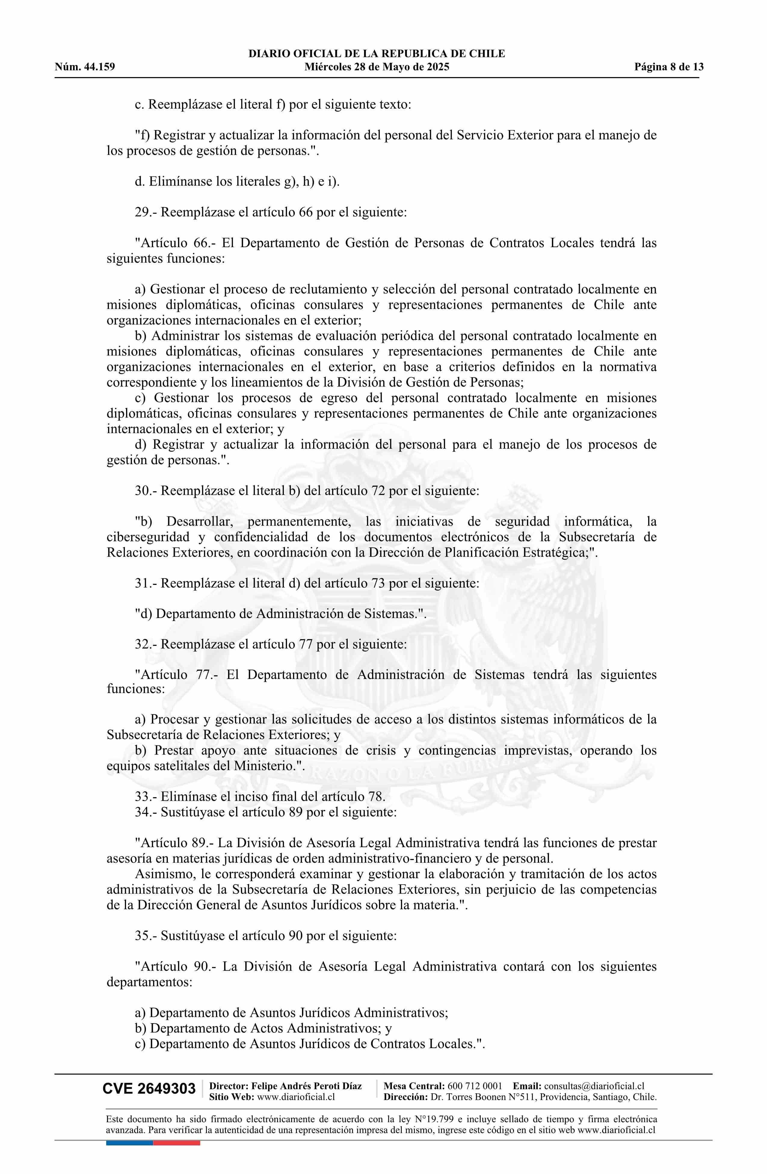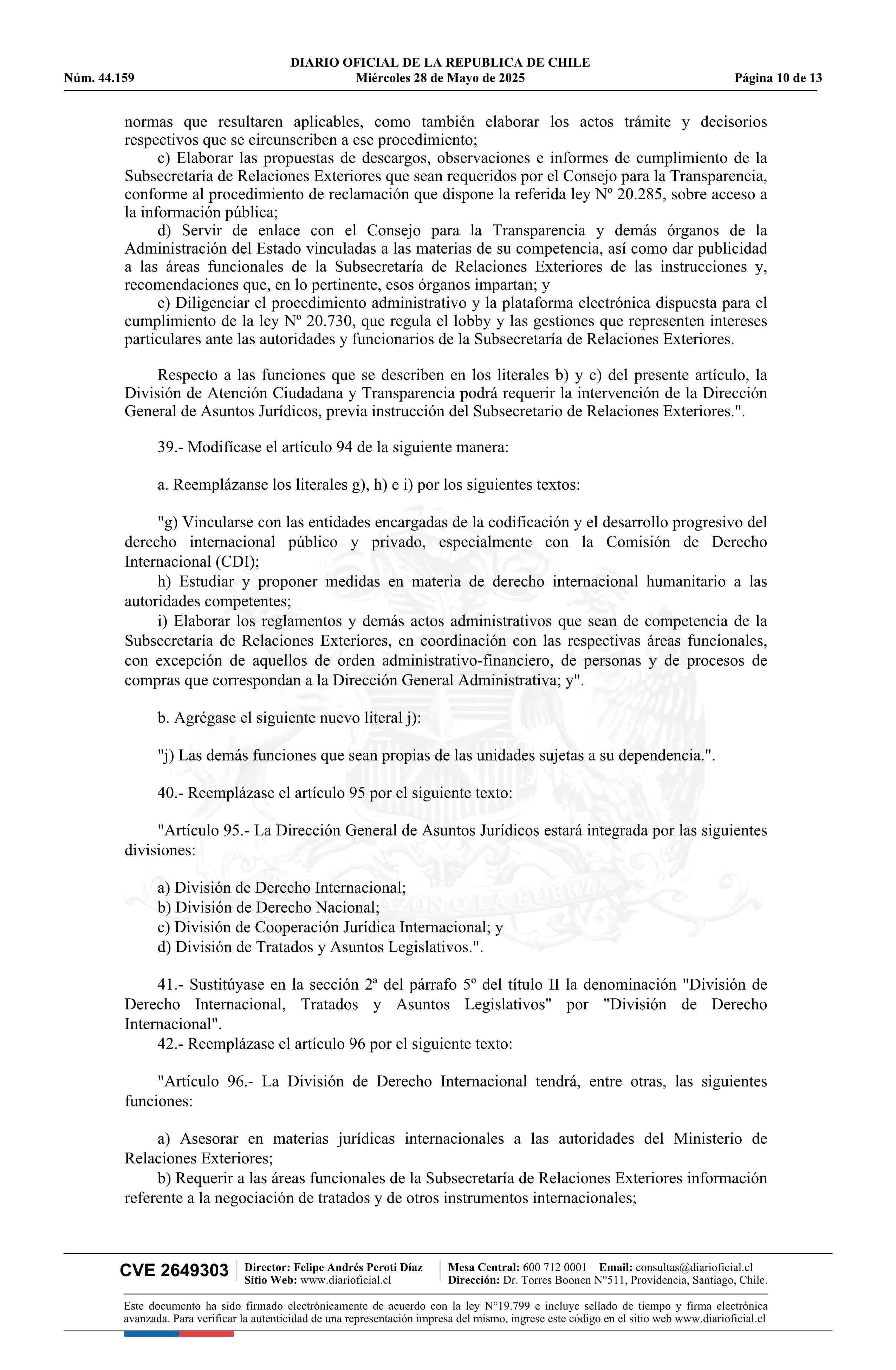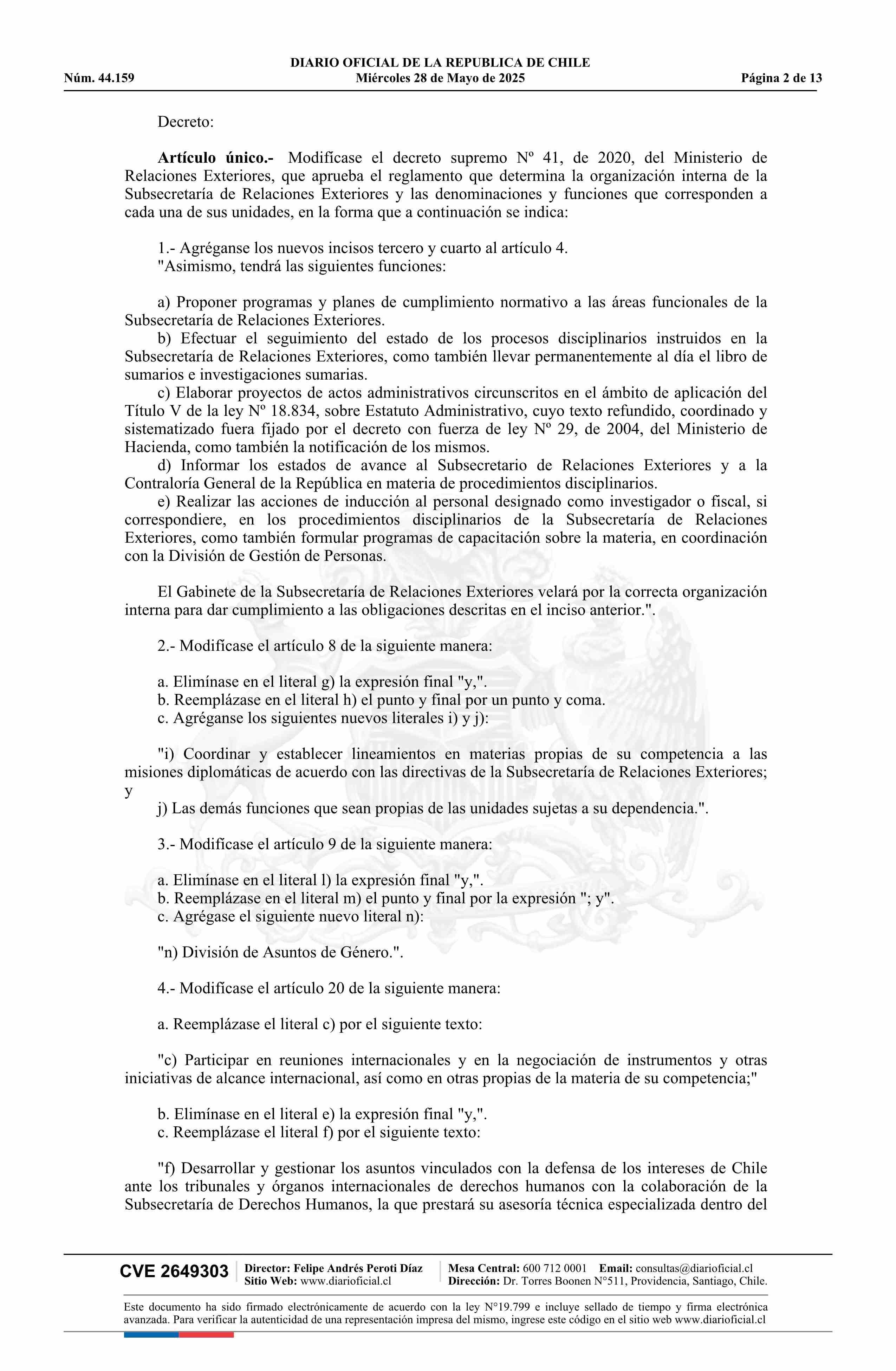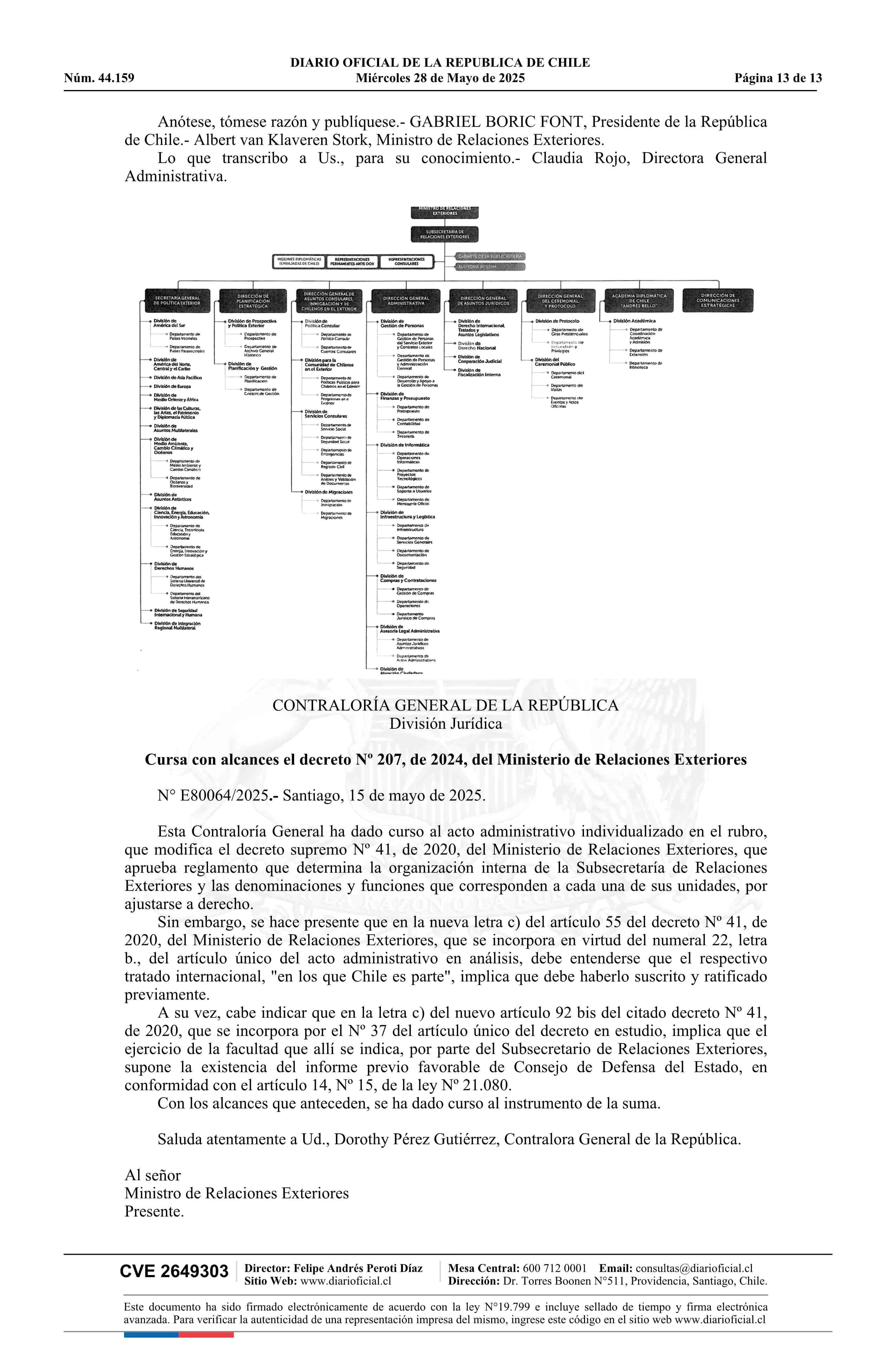 | Título: | Decreto número 207, de 2024.- Modifica el decreto Nº 41, de 2020, que aprueba Reglamento que determina la organización interna de la Subsecretaría de Relaciones Exteriores y las denominaciones y funciones que corresponden a cada una de sus unidades |