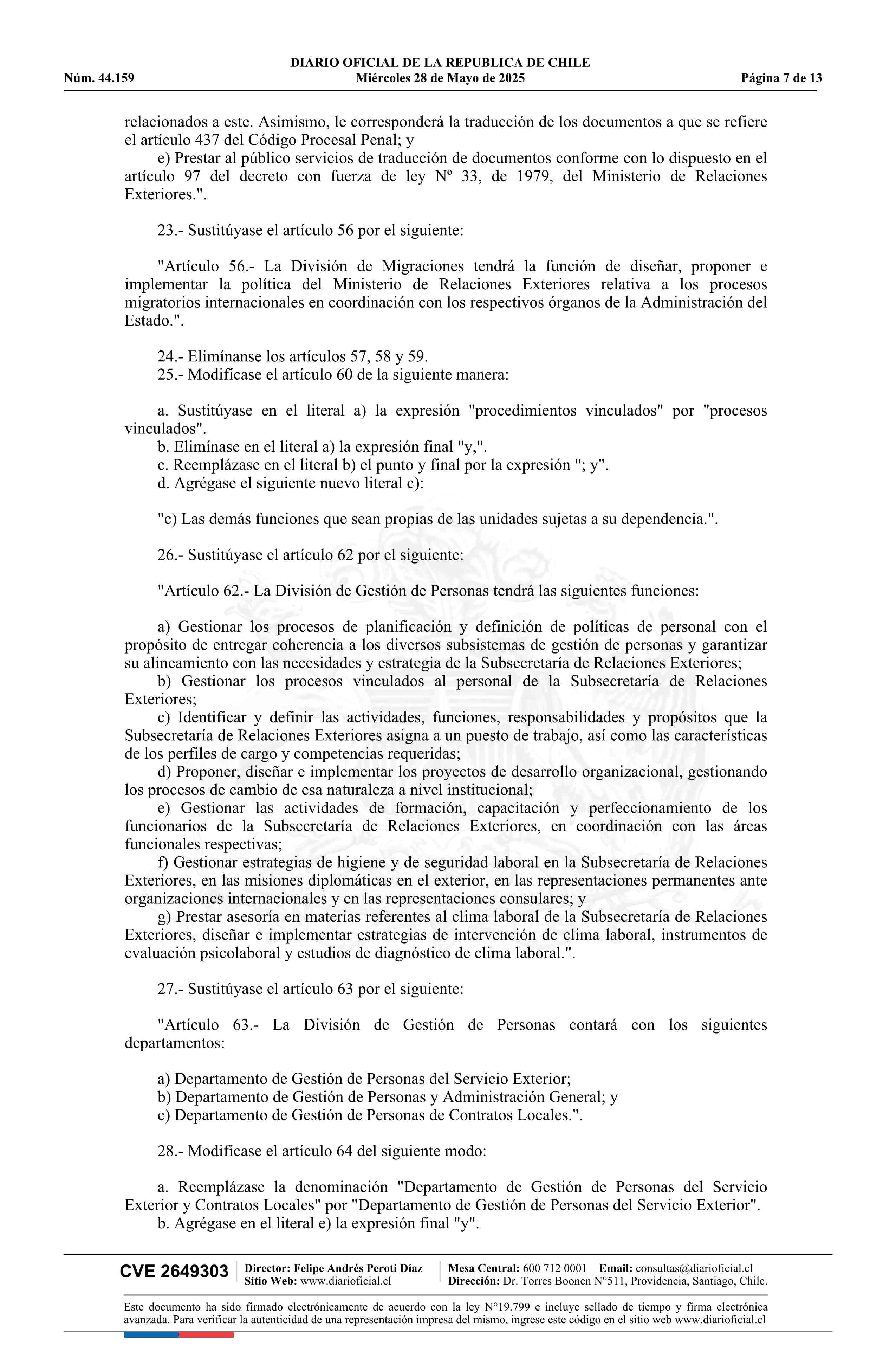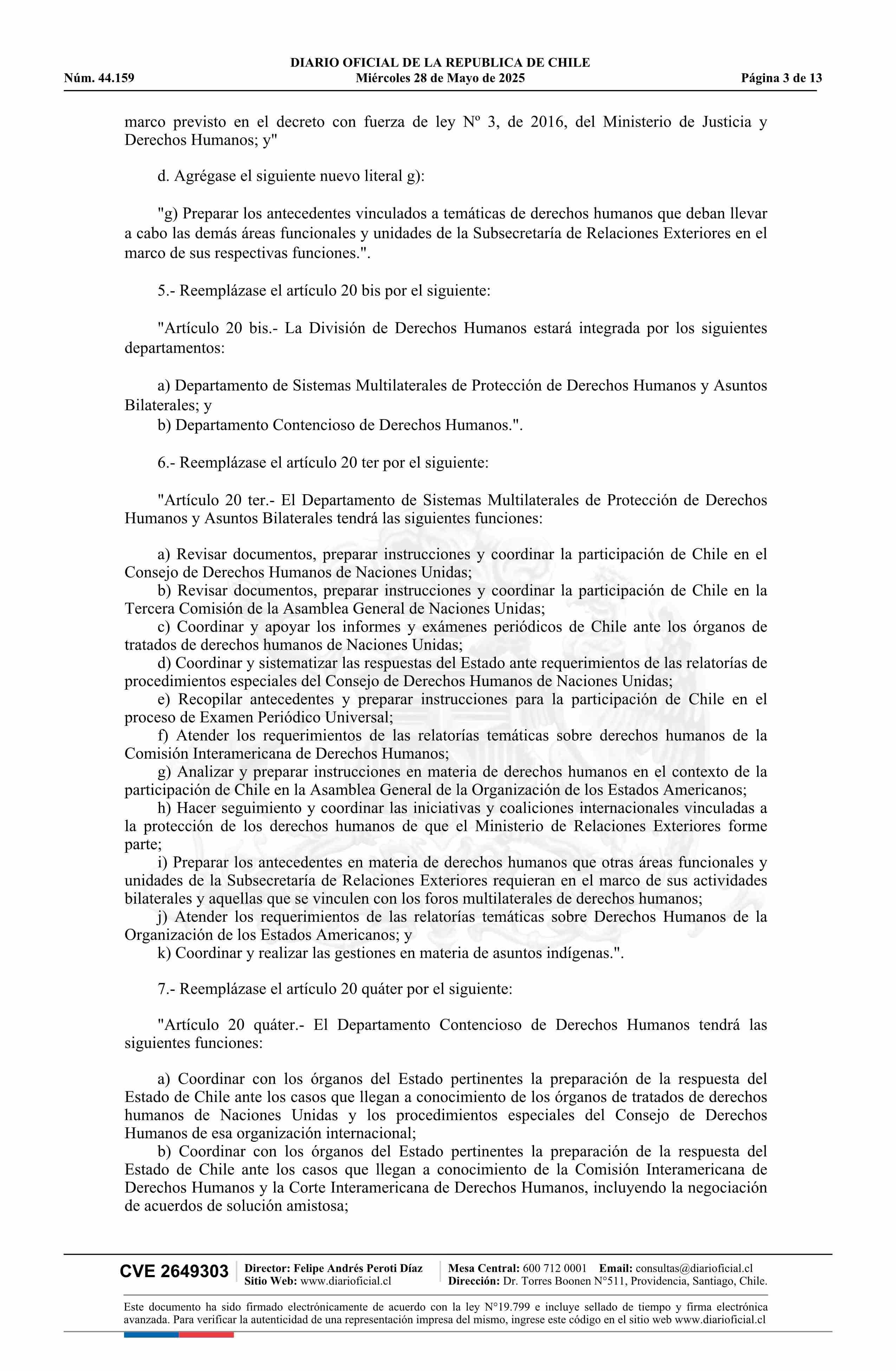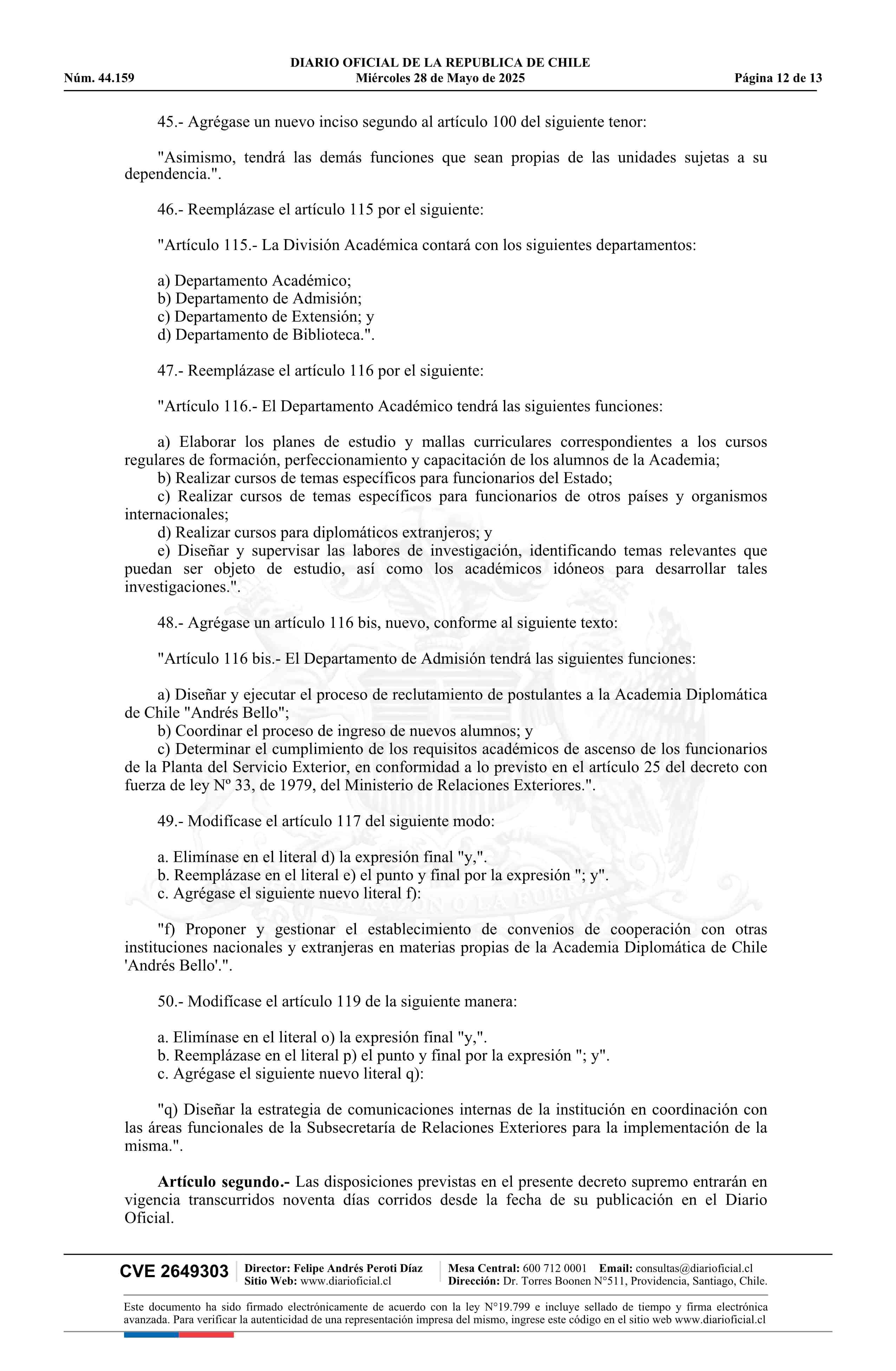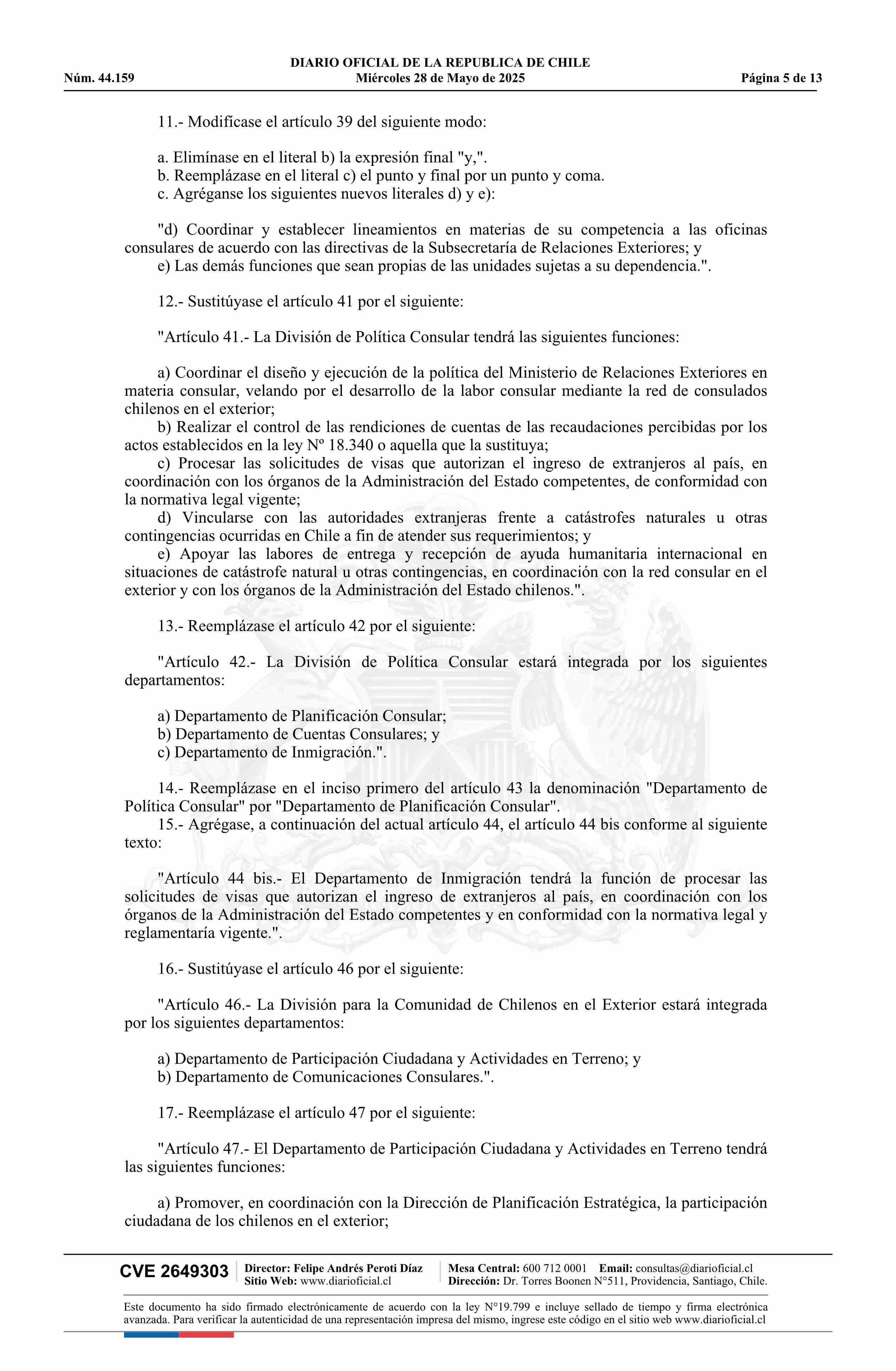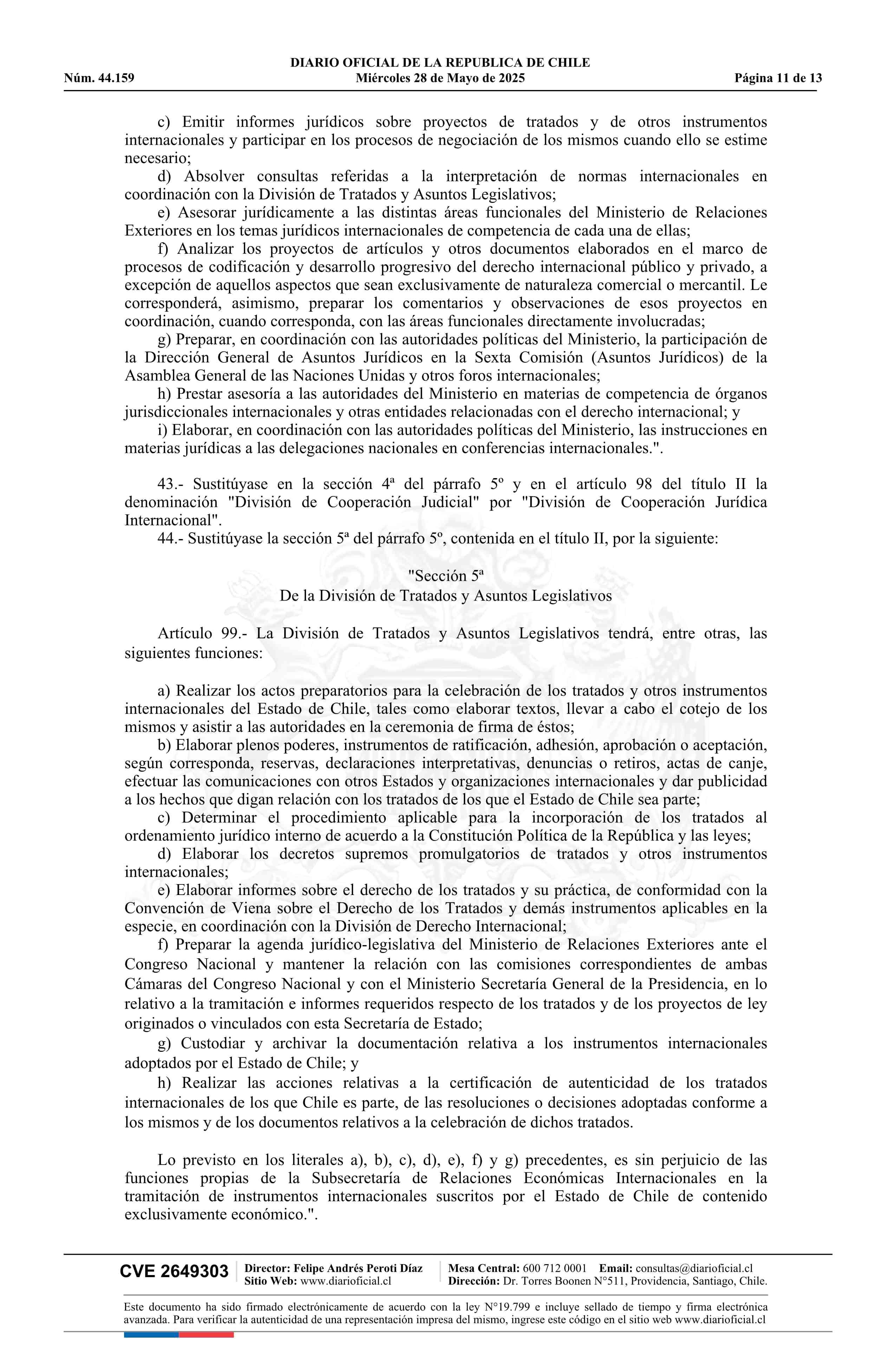 | Título: | Decreto número 207, de 2024.- Modifica el decreto Nº 41, de 2020, que aprueba Reglamento que determina la organización interna de la Subsecretaría de Relaciones Exteriores y las denominaciones y funciones que corresponden a cada una de sus unidades |