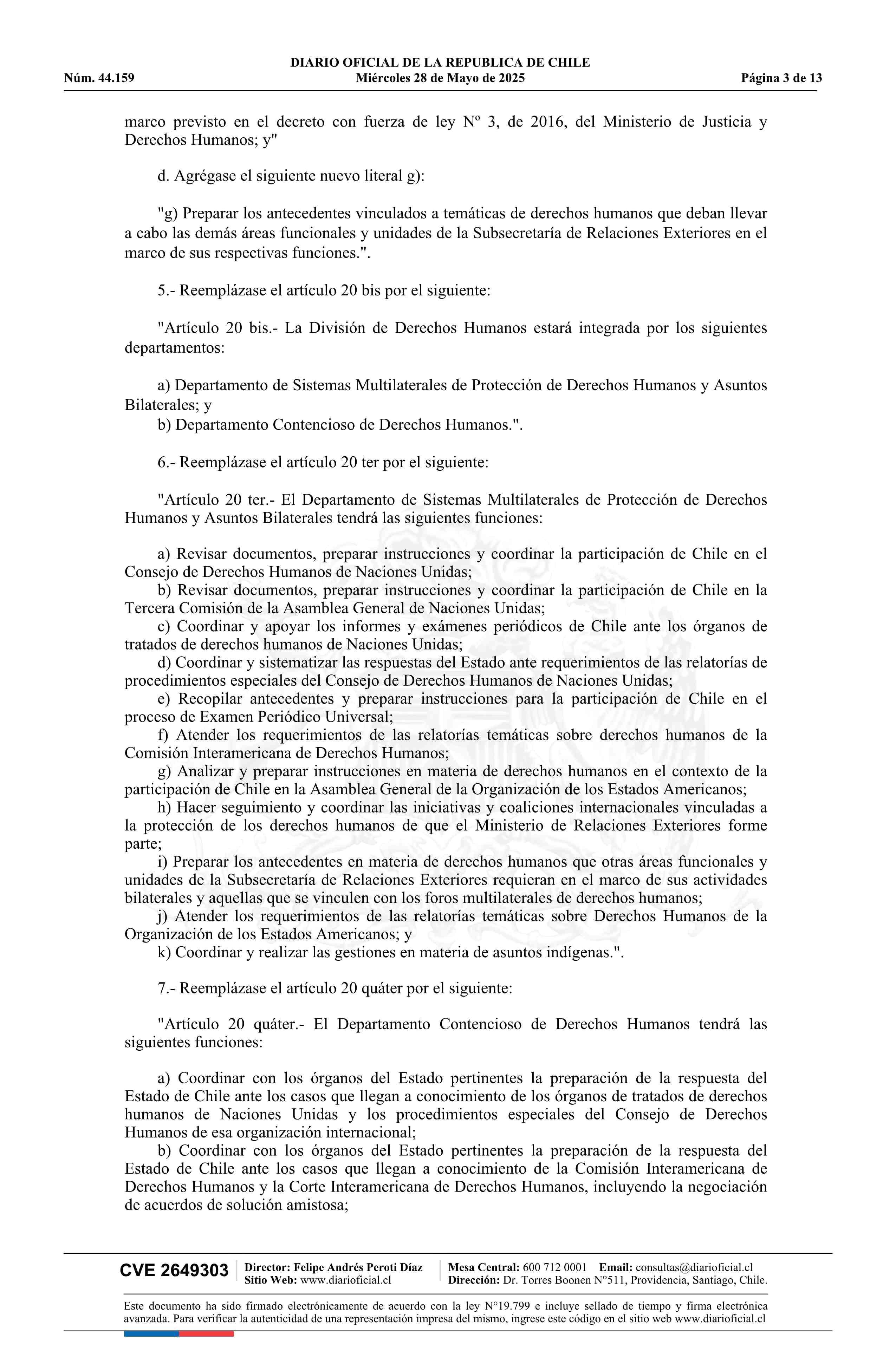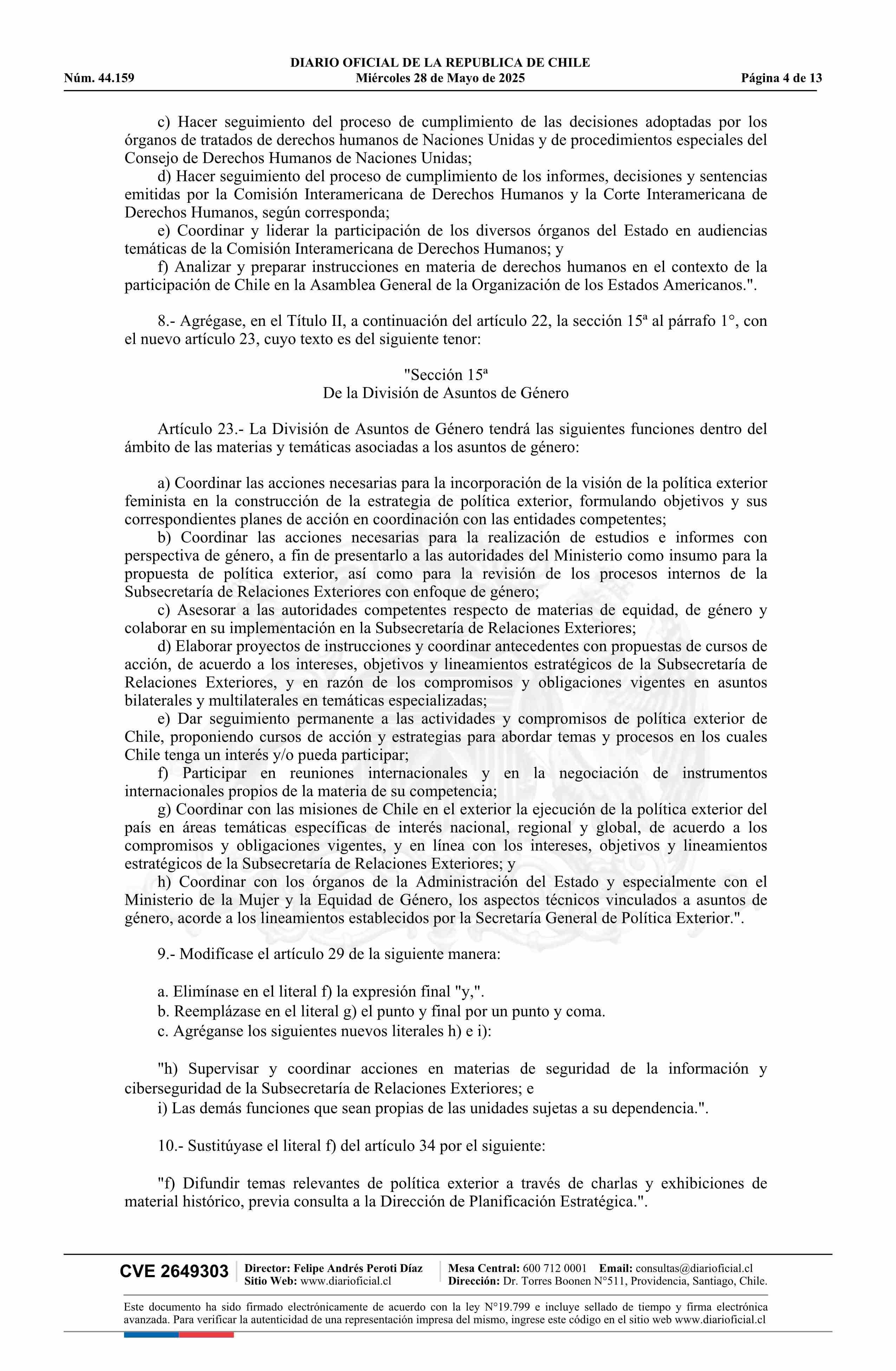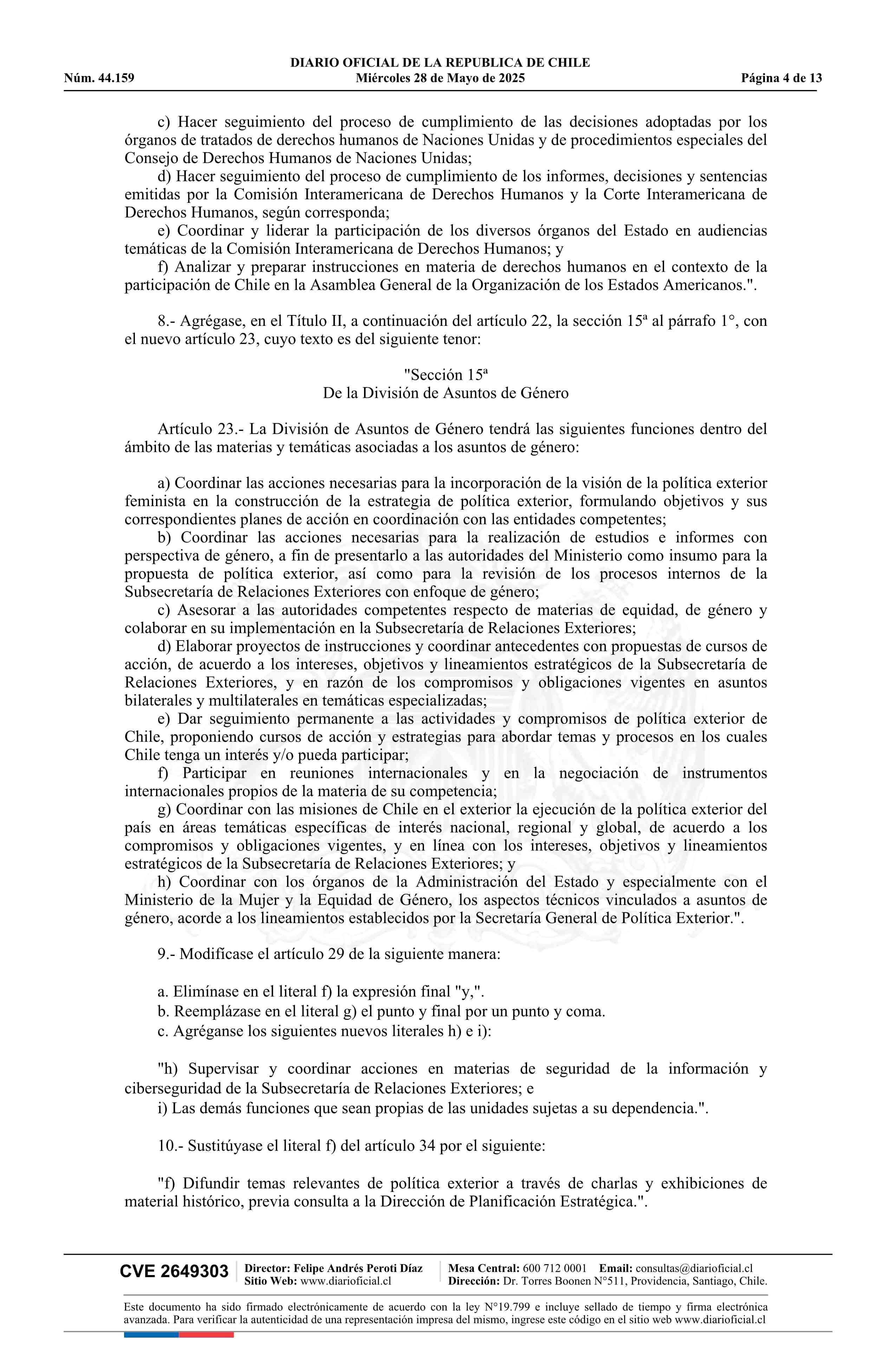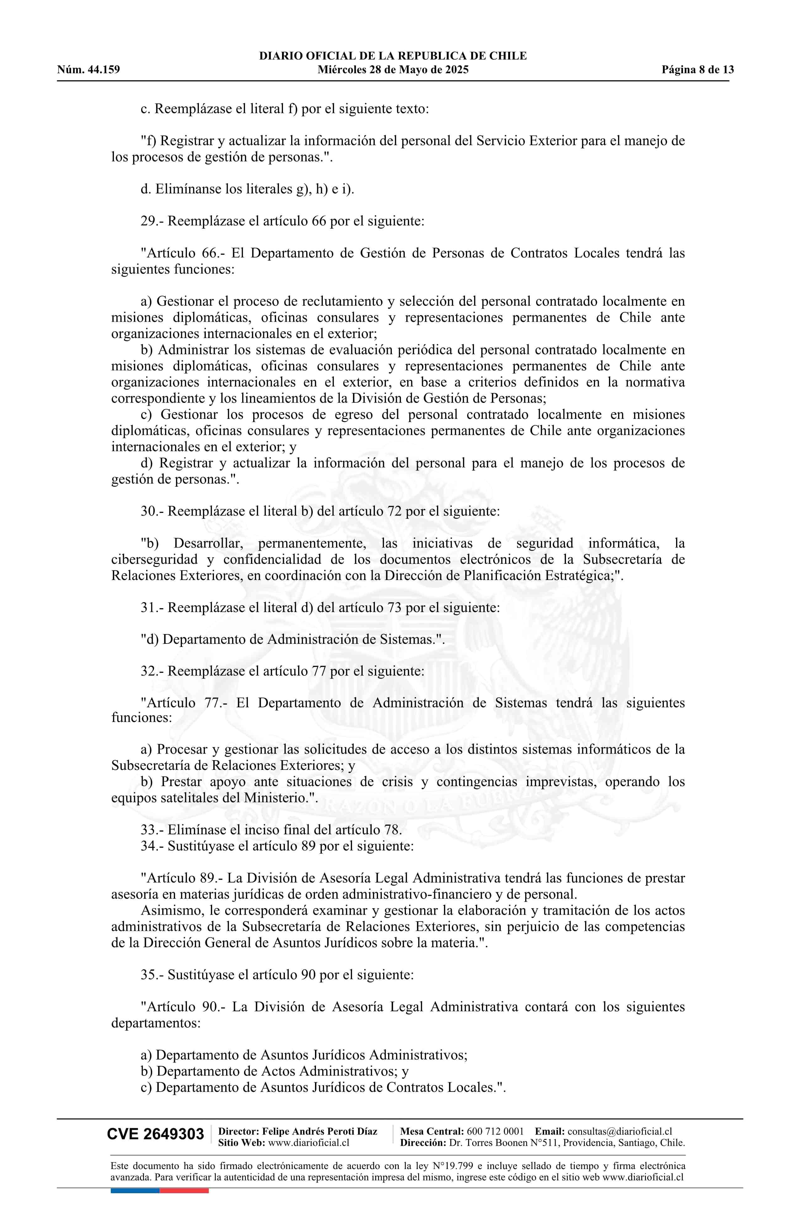 | Título: | Decreto número 207, de 2024.- Modifica el decreto Nº 41, de 2020, que aprueba Reglamento que determina la organización interna de la Subsecretaría de Relaciones Exteriores y las denominaciones y funciones que corresponden a cada una de sus unidades |
