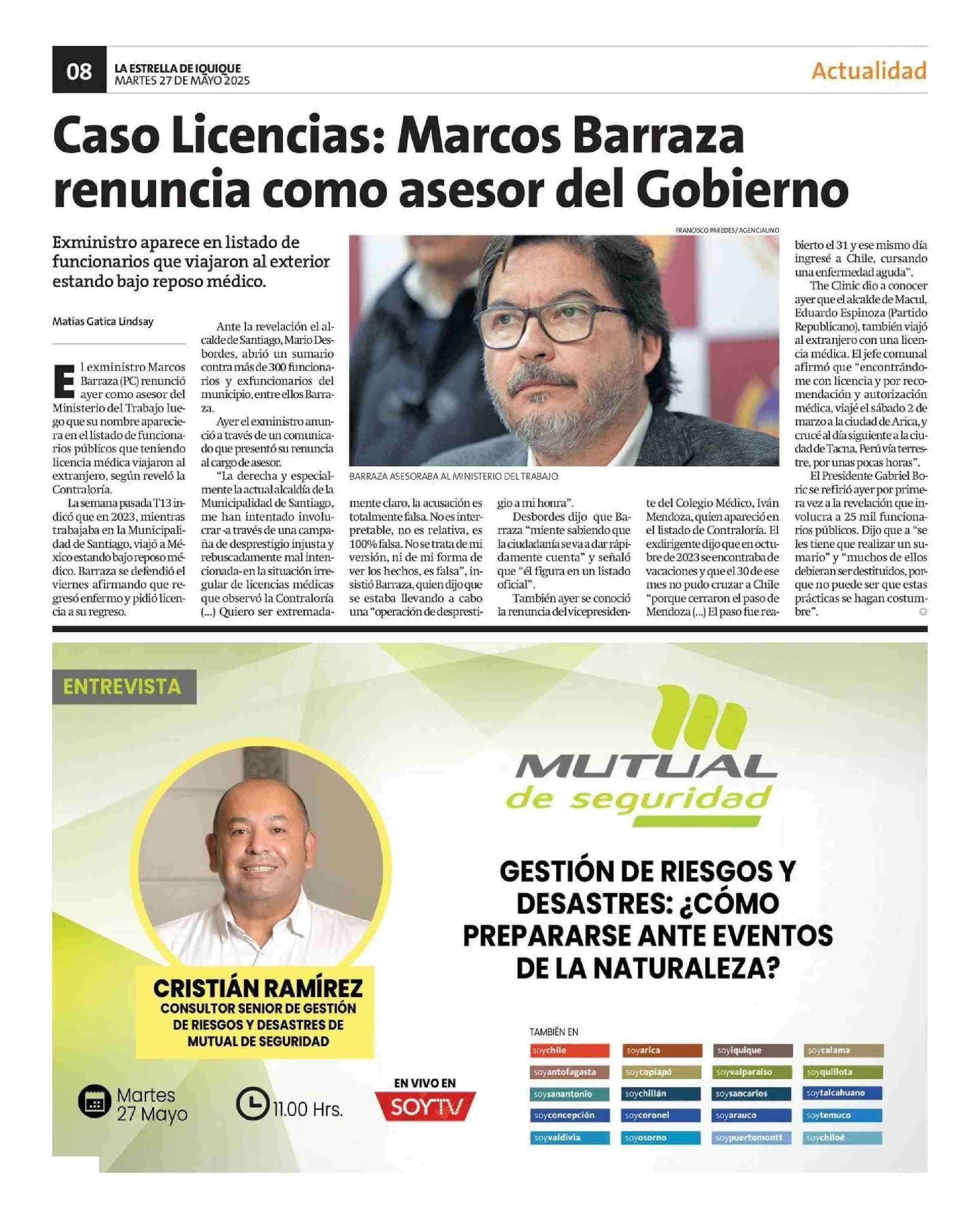 Caso Licencias: Marcos Barraza renuncia como asesor del Gobierno 27-05-2025 La Estrella de Iquique |