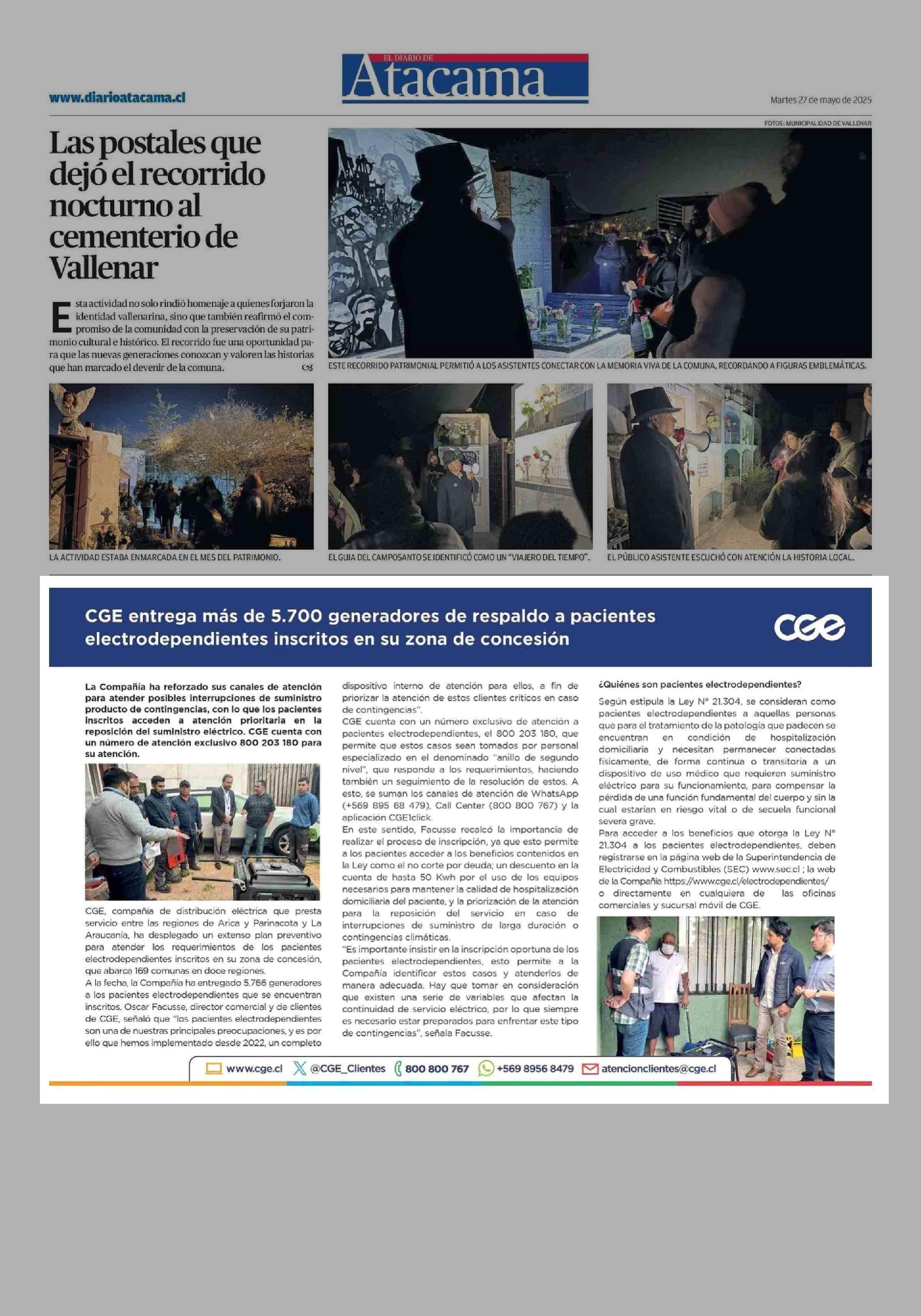 CGE entrega más de 5.700 generadores de respaldo a pacientes electrodependientes inscritos en su zona de concesión 27-05-2025 El Diario de Atacama |