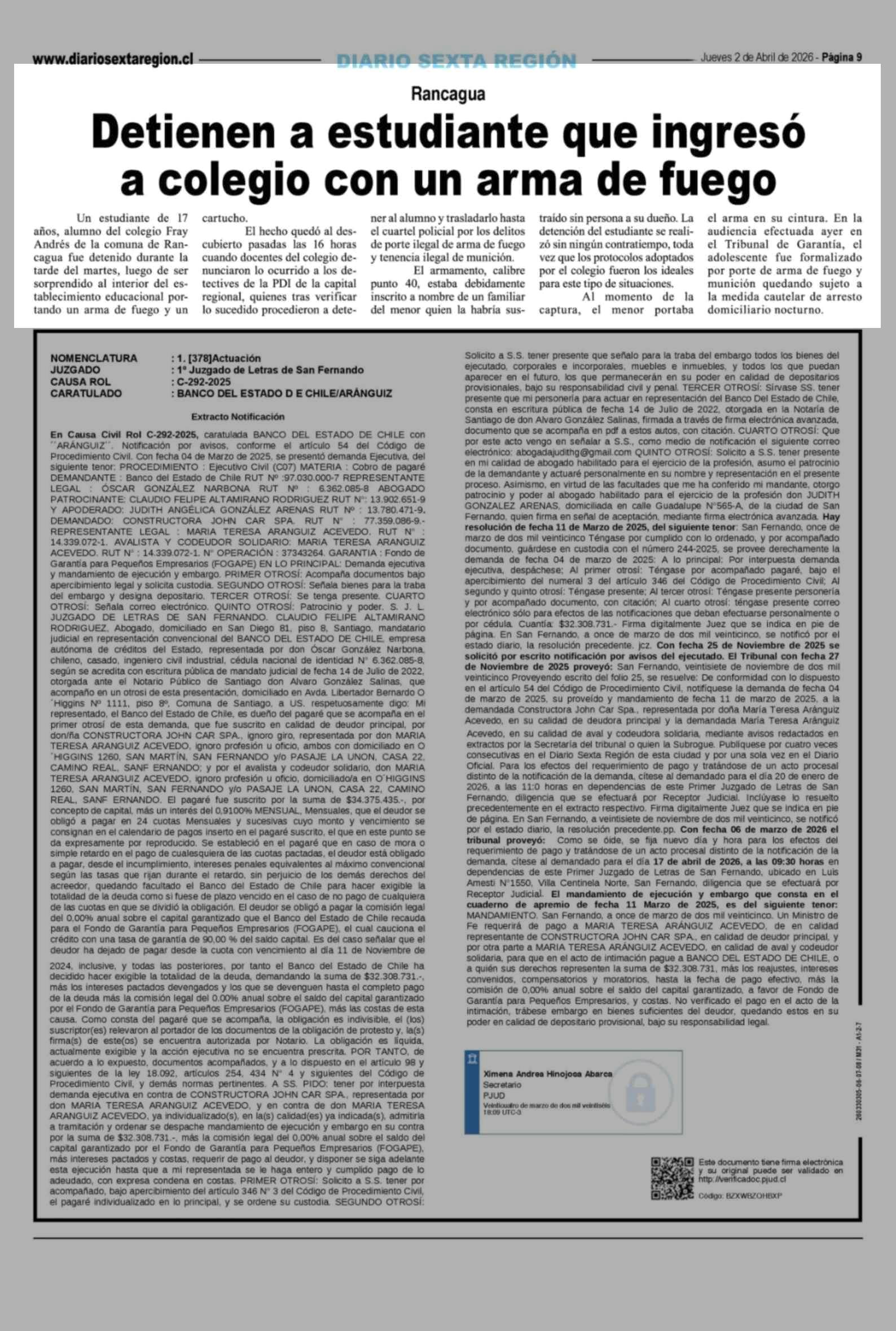 Detienen a estudiante que ingresó a colegio con un arma de fuego 02-04-2026 Diario VI Región |