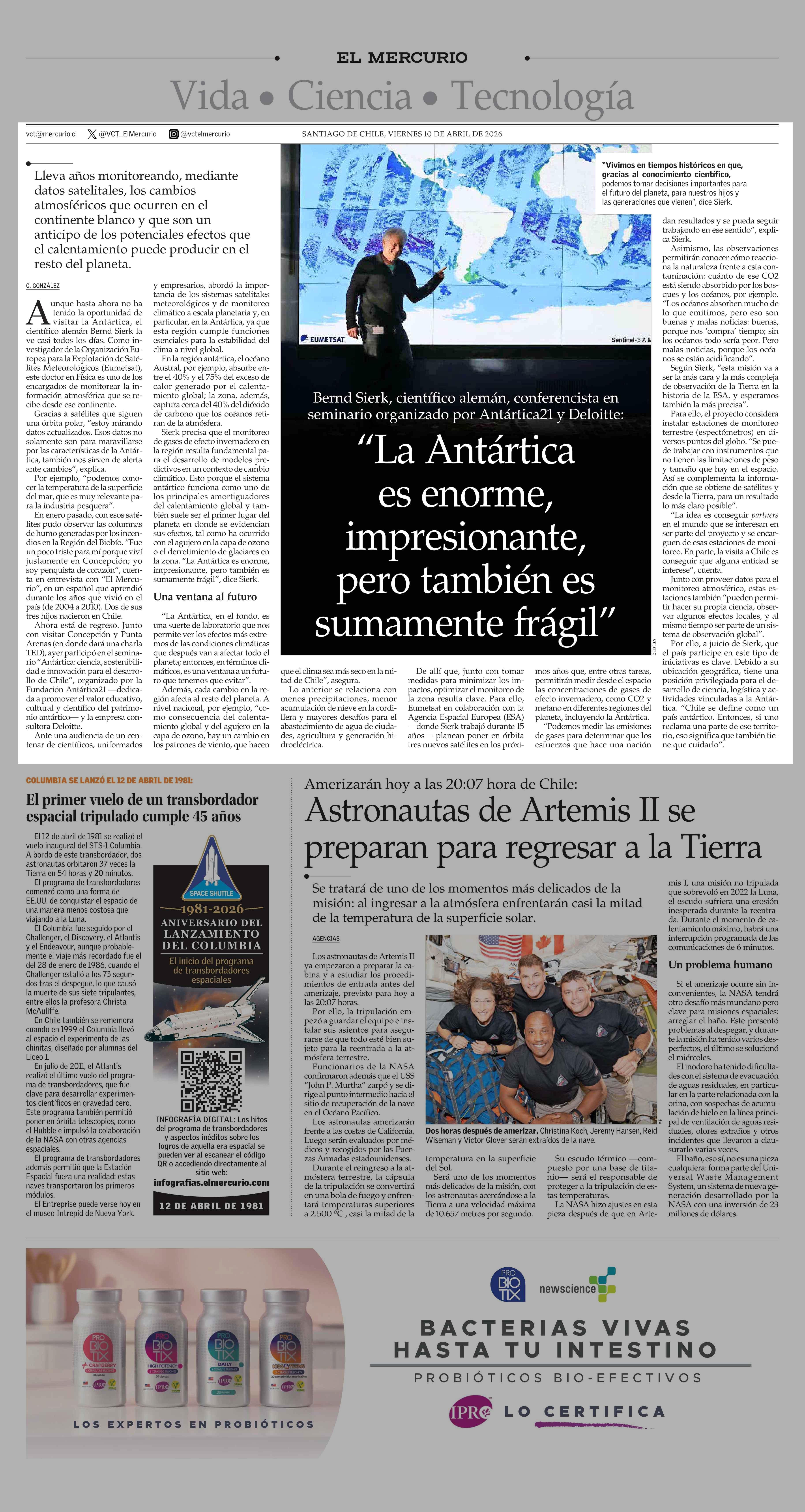 “La Antártica es enorme, impresionante, pero también es sumamente frágil” 10-04-2026 El Mercurio |