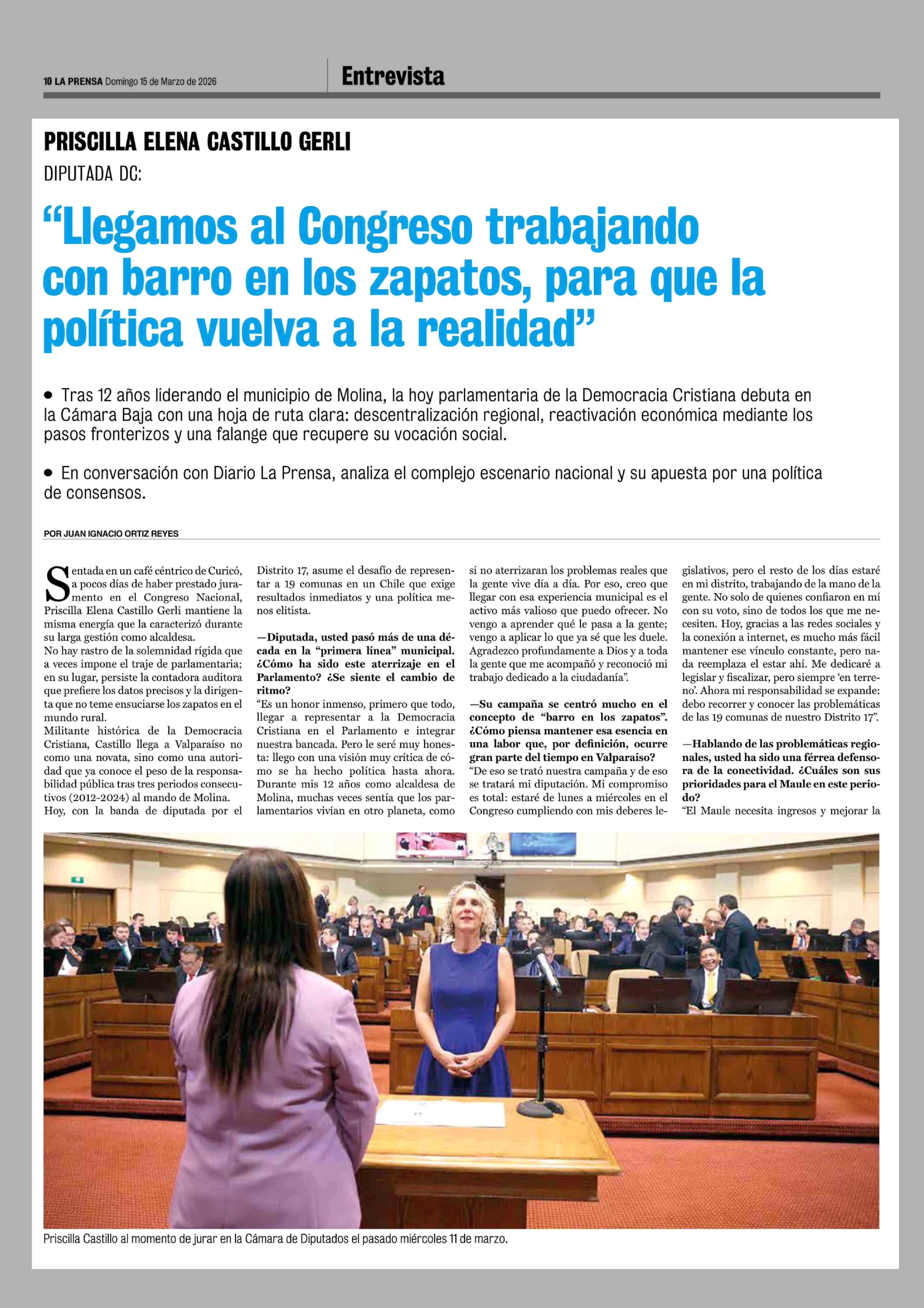 "Llegamos al Congreso trabajando con barro en los zapatos, para que la política vuelva a la realidad" 15-03-2026 La Prensa de Curicó |