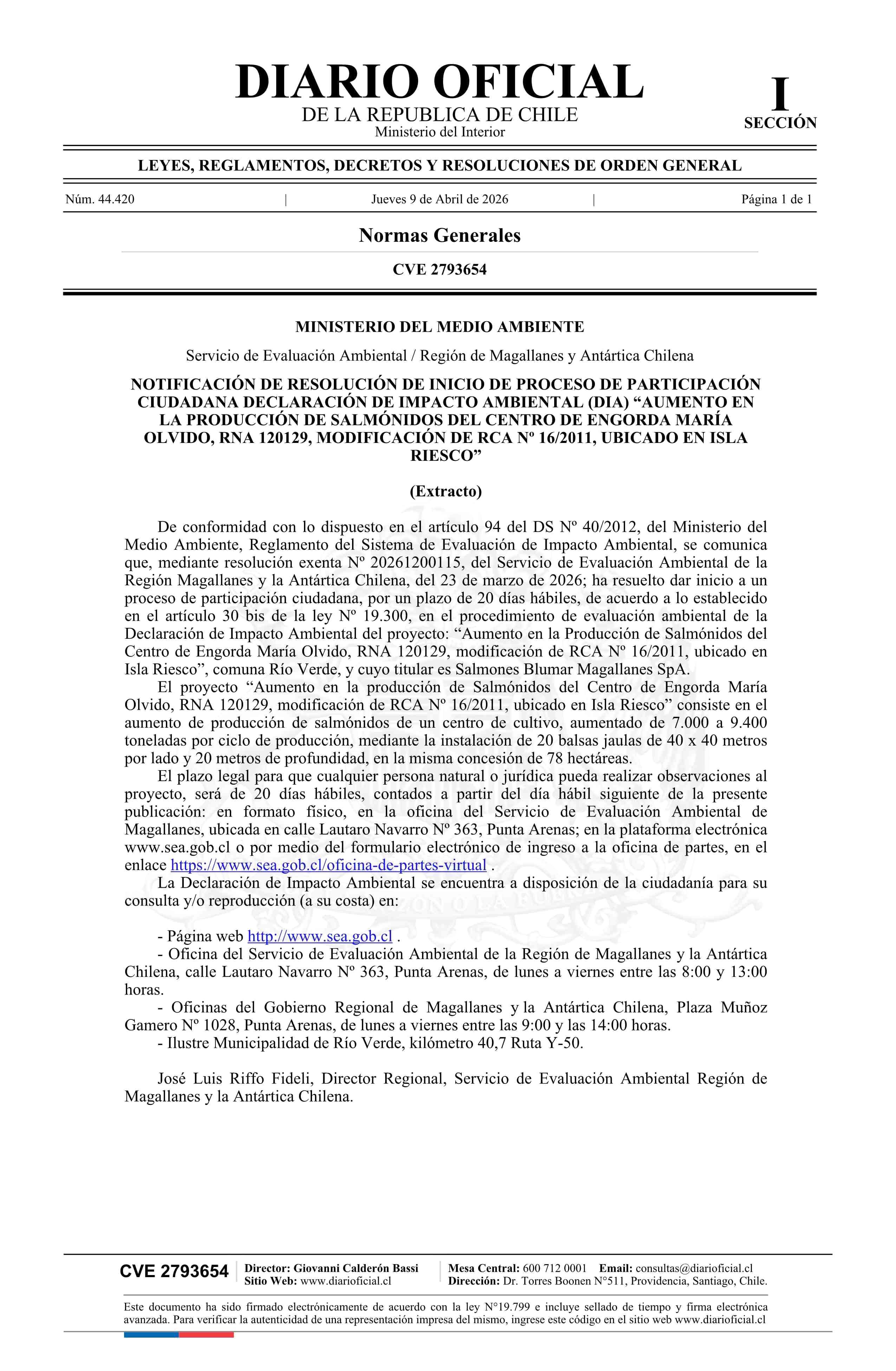 | Título: | Extracto de resolución exenta número 20261200115, de 2026.- Notifica resolución de inicio de proceso de participación ciudadana Declaración de Impacto Ambiental Aumento en la Producción de Salmónidos del Centro de Engorda María Olvido, RNA 120129, Modificación de RCA Nº 16/2011, ubicado en Isla Ries |