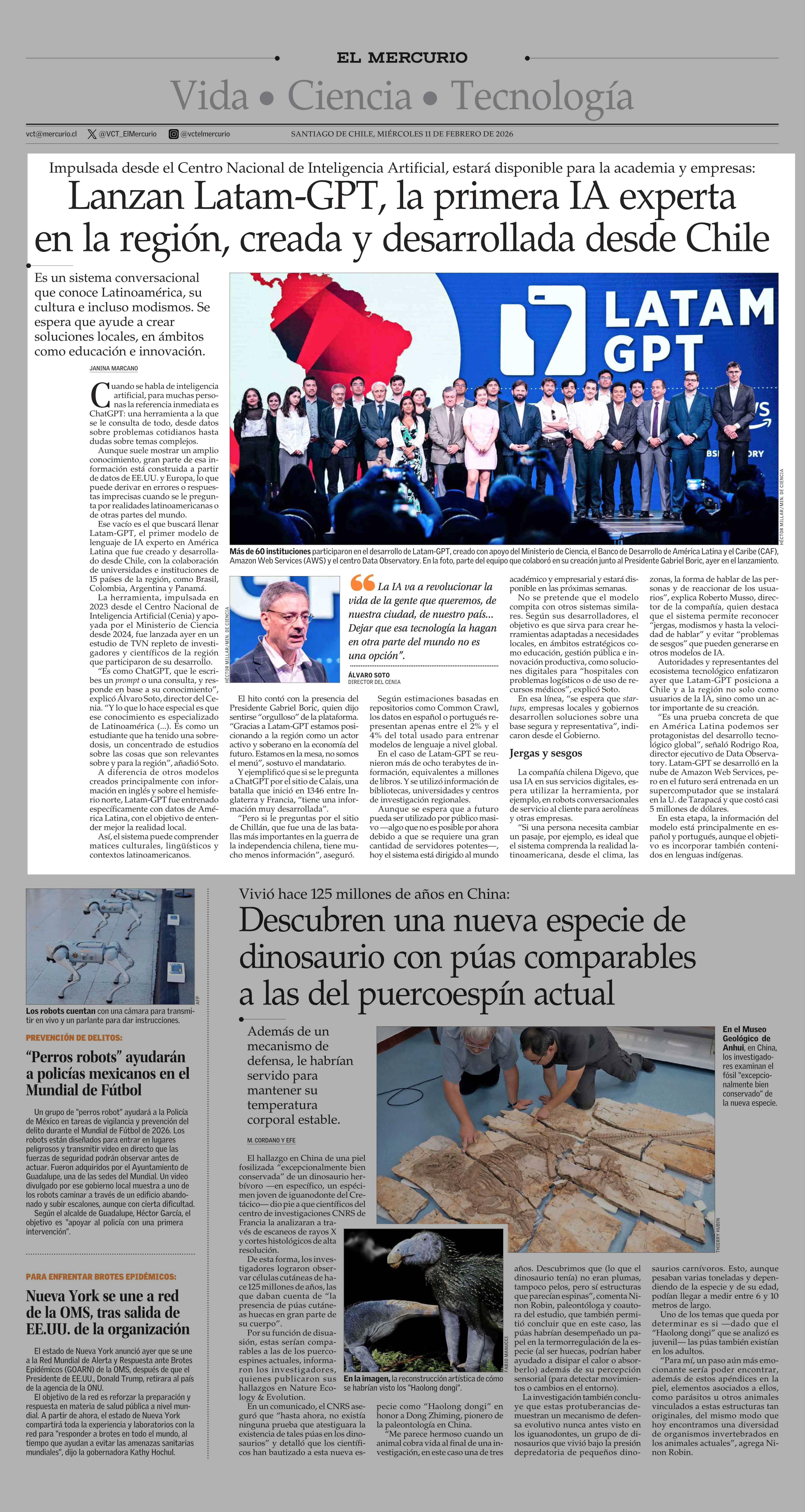 Lanzan Latam-GPT, la primera IA experta en la región, creada y desarrollada desde Chile 11-02-2026 El Mercurio |